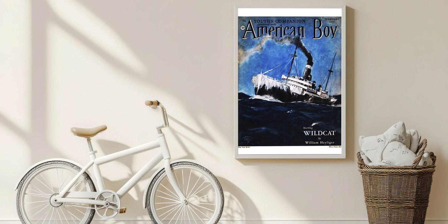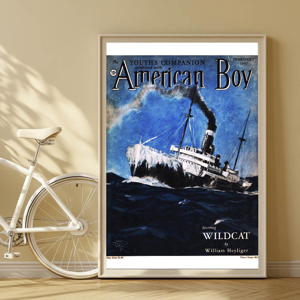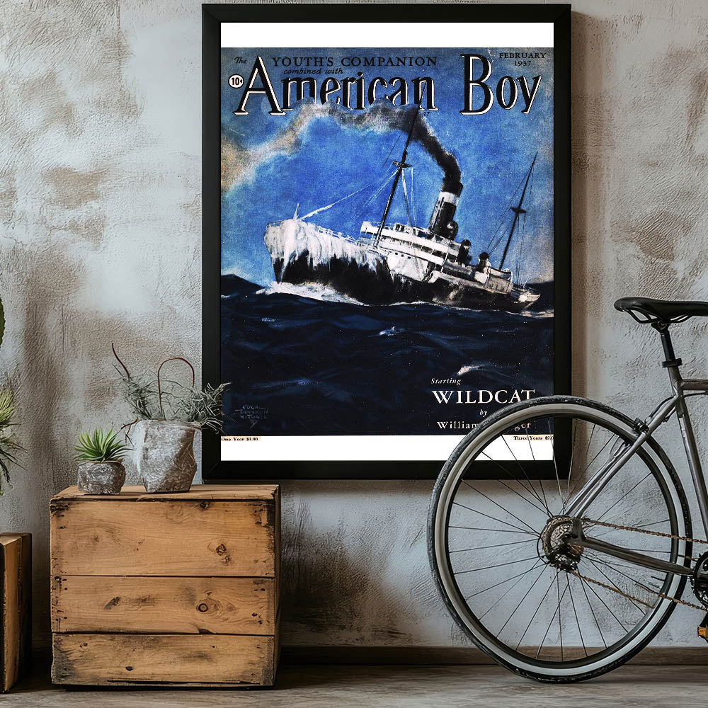 Set sail on a thrilling adventure with this Vintage Magazine Cover Art from American Boy, February 1937, featuring the powerful steamship in Wildcat by William Heyliger. The cover illustration depicts the ship battling the sea, surrounded by waves and icy waters, capturing the raw energy of the story. With its dramatic composition and bold use of color, this cover art is perfect for those who love nautical adventure, vintage illustrations, and classic magazine covers.