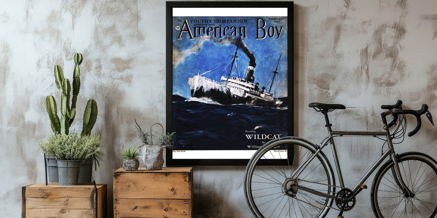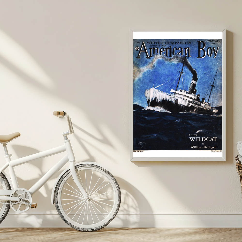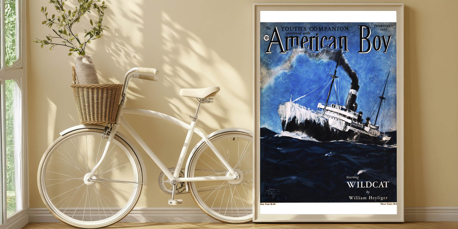 Set sail on a thrilling adventure with this Vintage Magazine Cover Art from American Boy, February 1937, featuring the powerful steamship in Wildcat by William Heyliger. The cover illustration depicts the ship battling the sea, surrounded by waves and icy waters, capturing the raw energy of the story. With its dramatic composition and bold use of color, this cover art is perfect for those who love nautical adventure, vintage illustrations, and classic magazine covers.