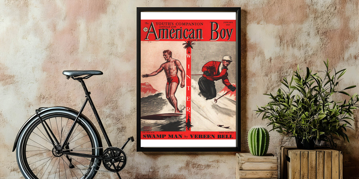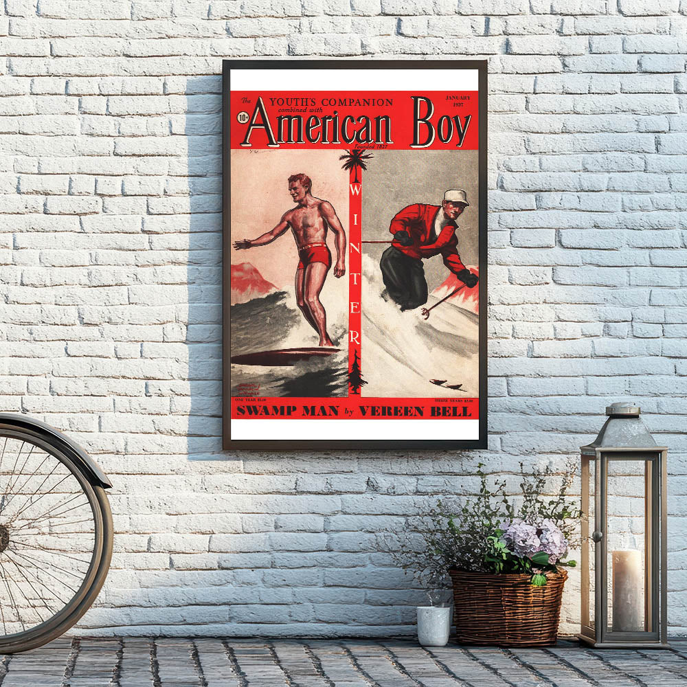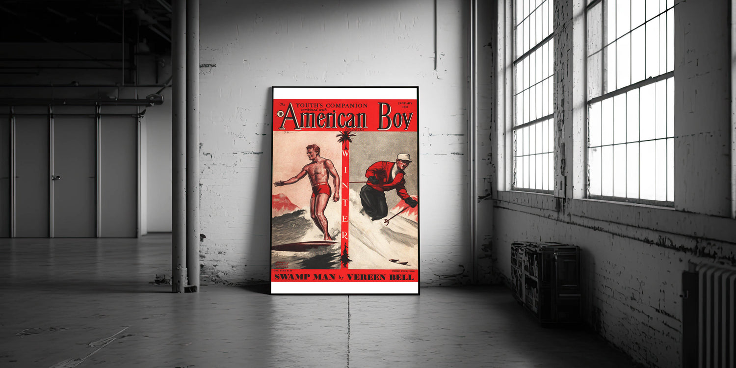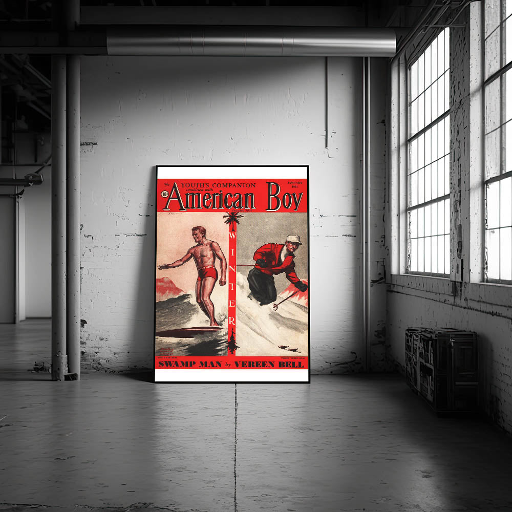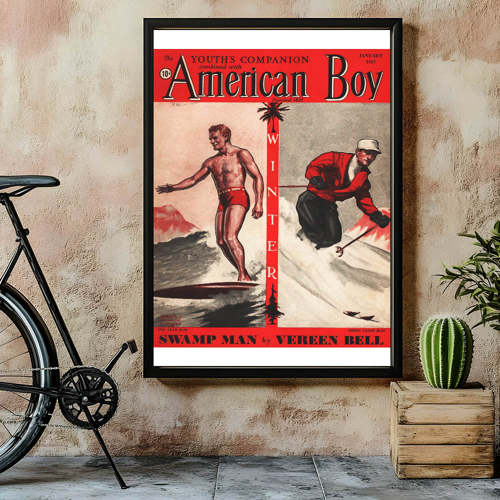 Experience the contrast of summer and winter with this striking Vintage Magazine Cover Art from American Boy, January 1937. The cover features a dynamic scene with a surfer in the sun-soaked ocean on the left and a skier carving through the snowy mountains on the right. Titled Swamp Man by Vereen Bell, this cover captures the spirit of adventure and contrasts the warmth of summer with the chill of winter in a bold, graphic style. This cover is perfect for lovers of outdoor sports, vintage artwork, or those who appreciate the unique blend of contrasting activities.