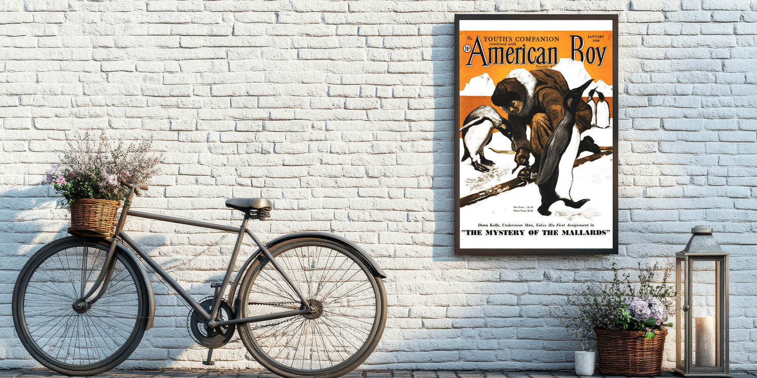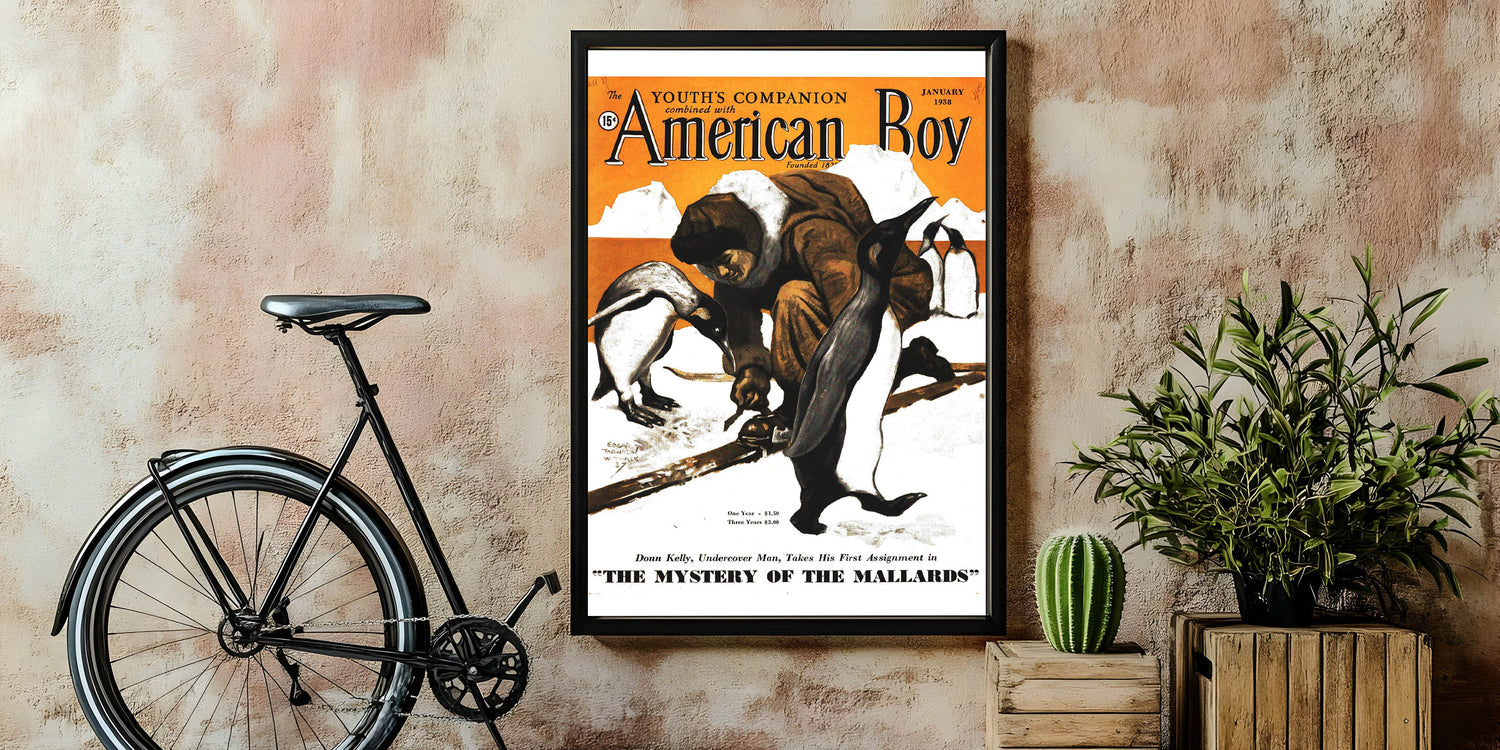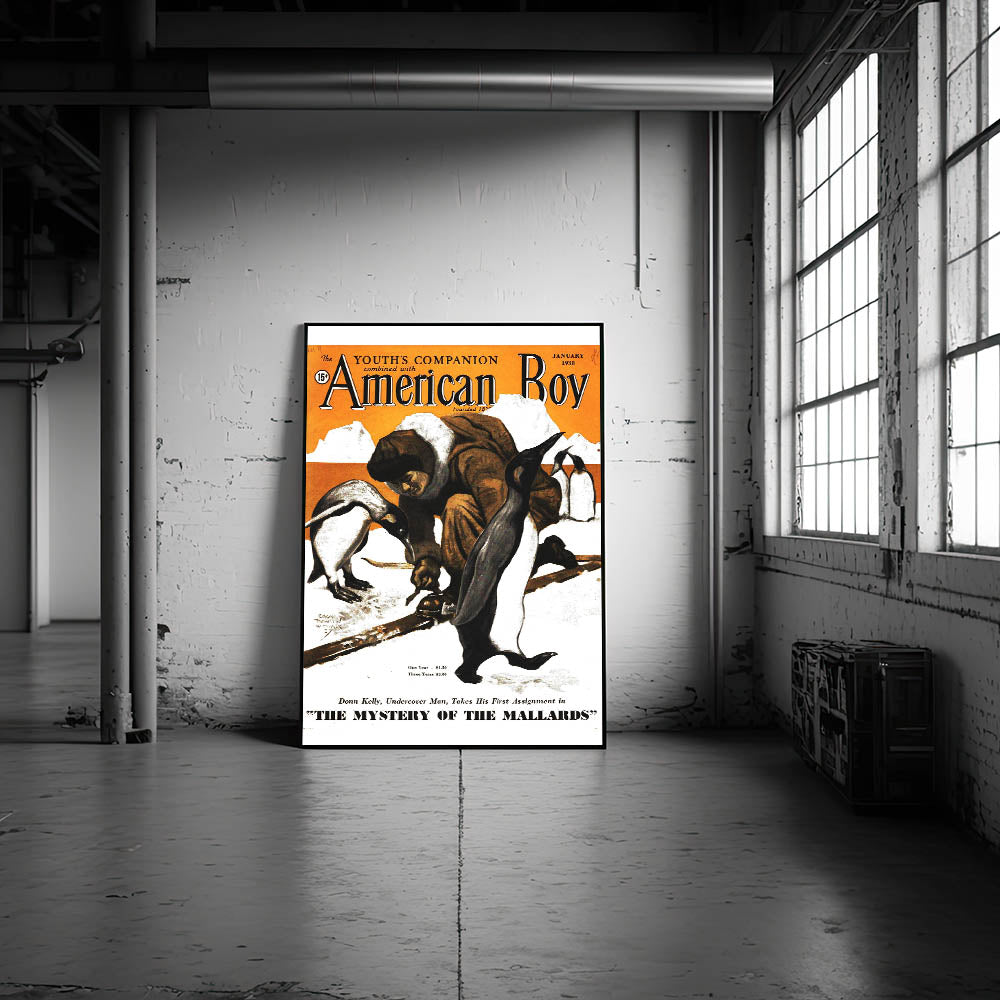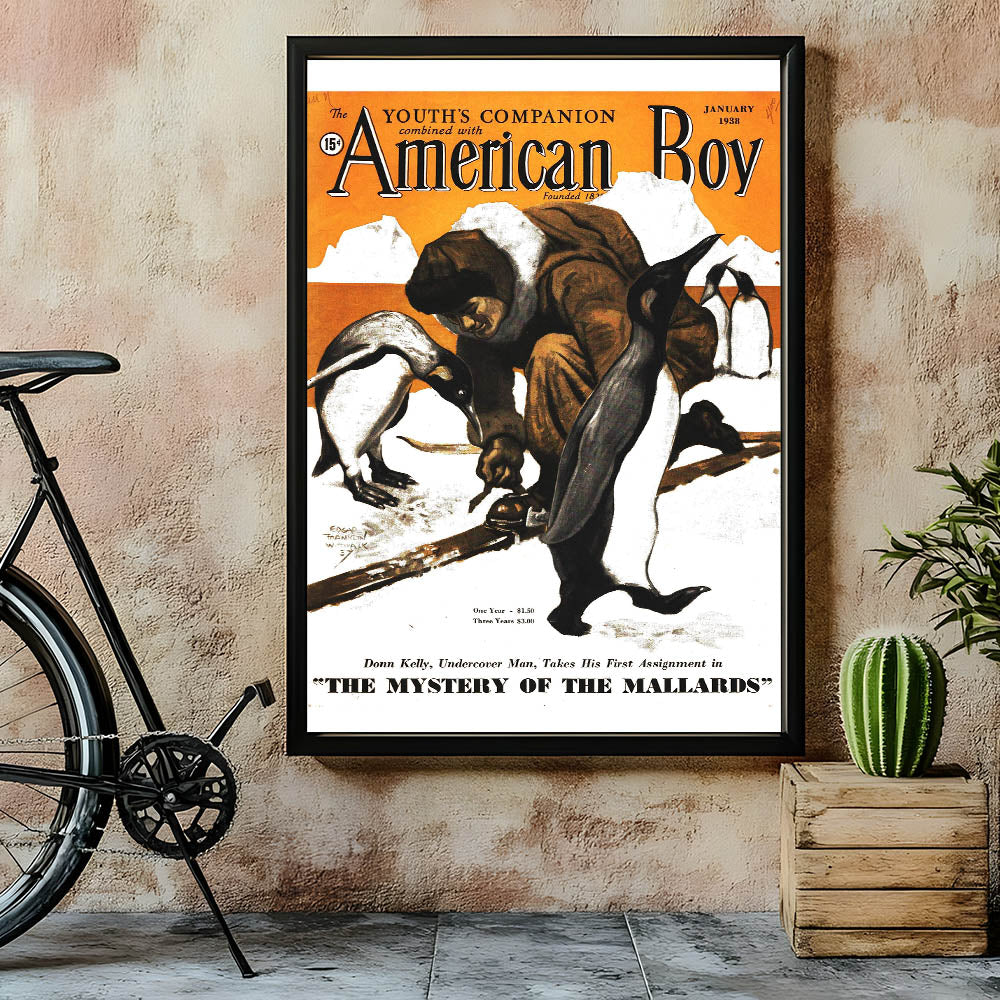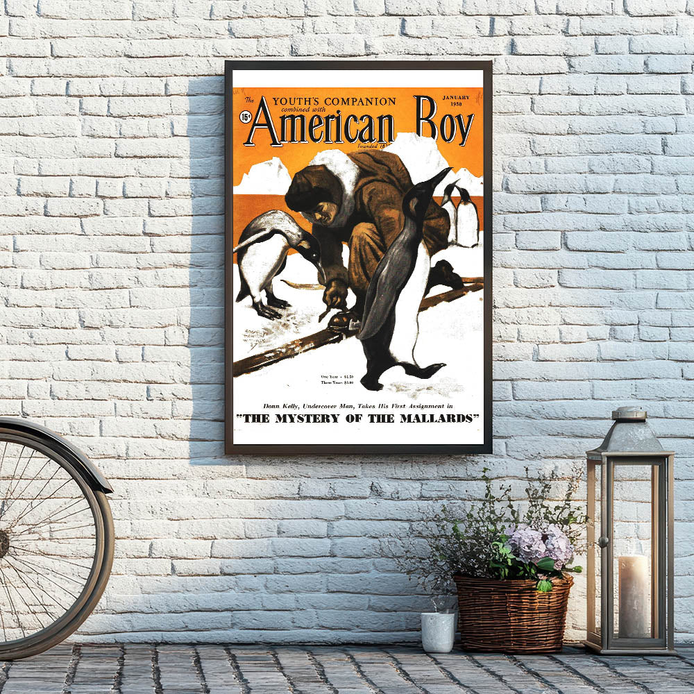 Step into the wild, icy landscapes of the Antarctic with this Vintage Magazine Cover Art from American Boy, January 1938, featuring The Mystery of the Mallards. The cover illustrates an explorer in a fur-lined parka kneeling next to penguins, capturing the thrill of an icy adventure. The bold use of orange and black hues adds a dramatic, adventurous flair, making this cover a must-have for fans of exploration, wildlife, and vintage artwork.