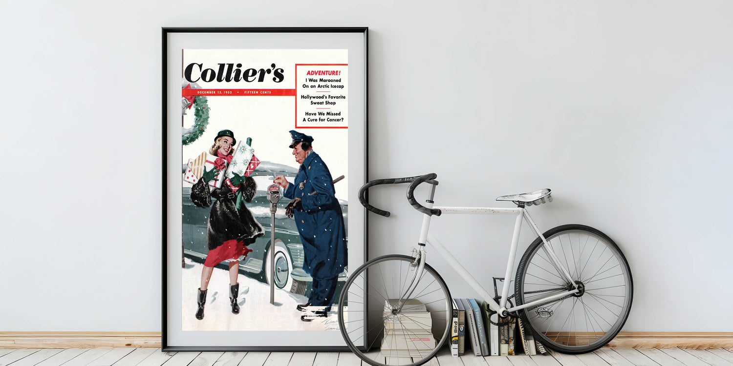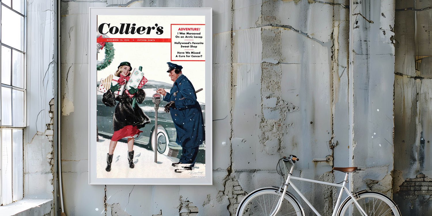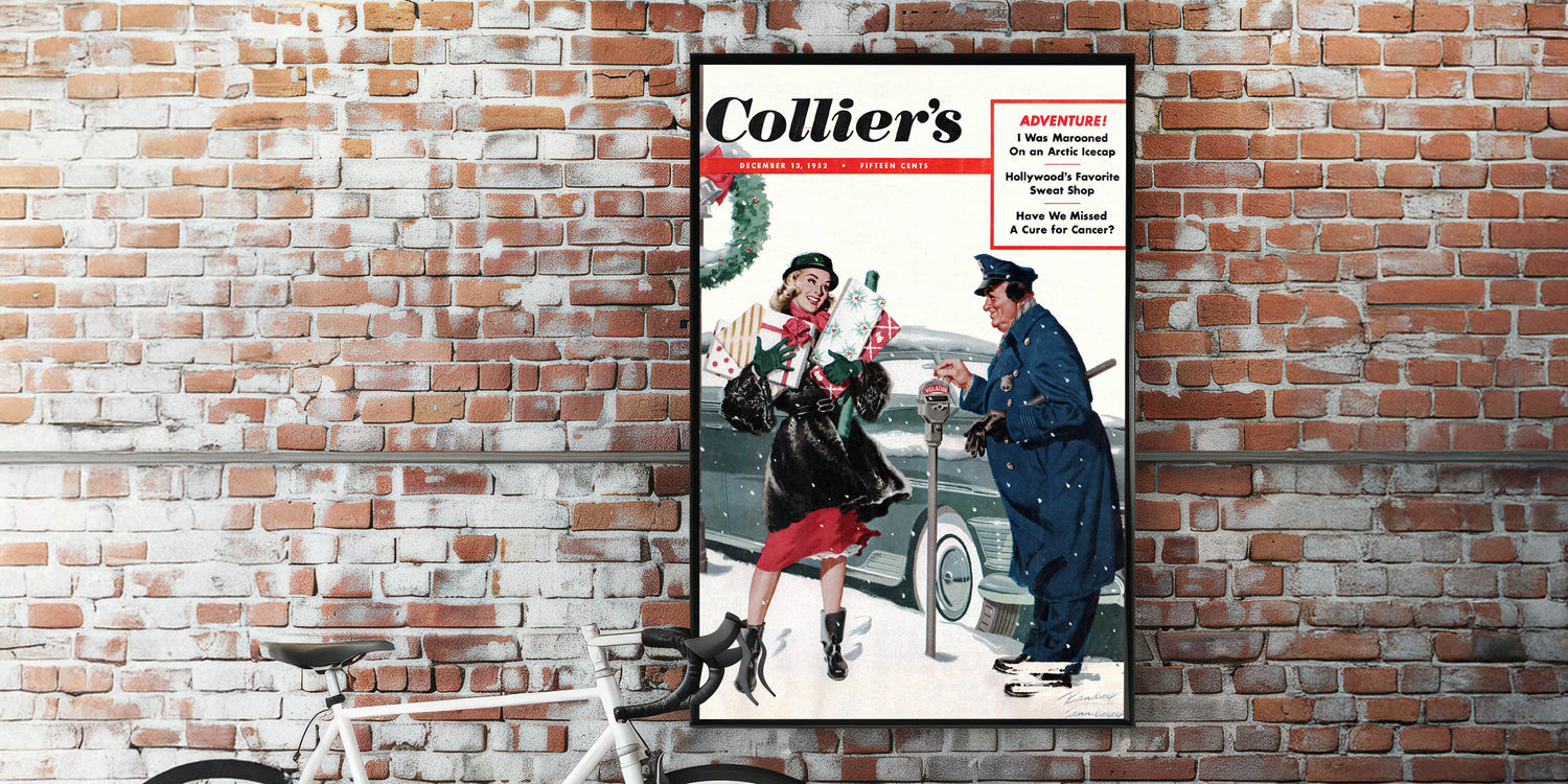 Capture the charm of a bygone era with this Vintage Magazine Cover Art from Collier's magazine. Featuring a joyful holiday scene with a woman carrying Christmas gifts and a friendly interaction with a policeman, this cover brings warmth and nostalgia to any space. The vibrant reds, greens, and snowy backdrop create a festive atmosphere perfect for the holiday season, while adding a touch of retro magazine cover prints to your home. Whether you’re decorating for the holidays or seeking nostalgic vintage decor prints, this piece will evoke fond memories of simpler times.