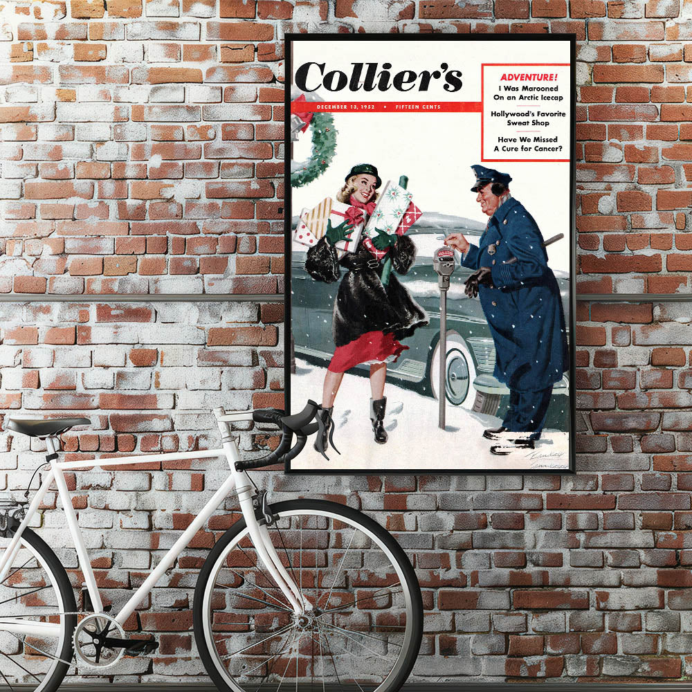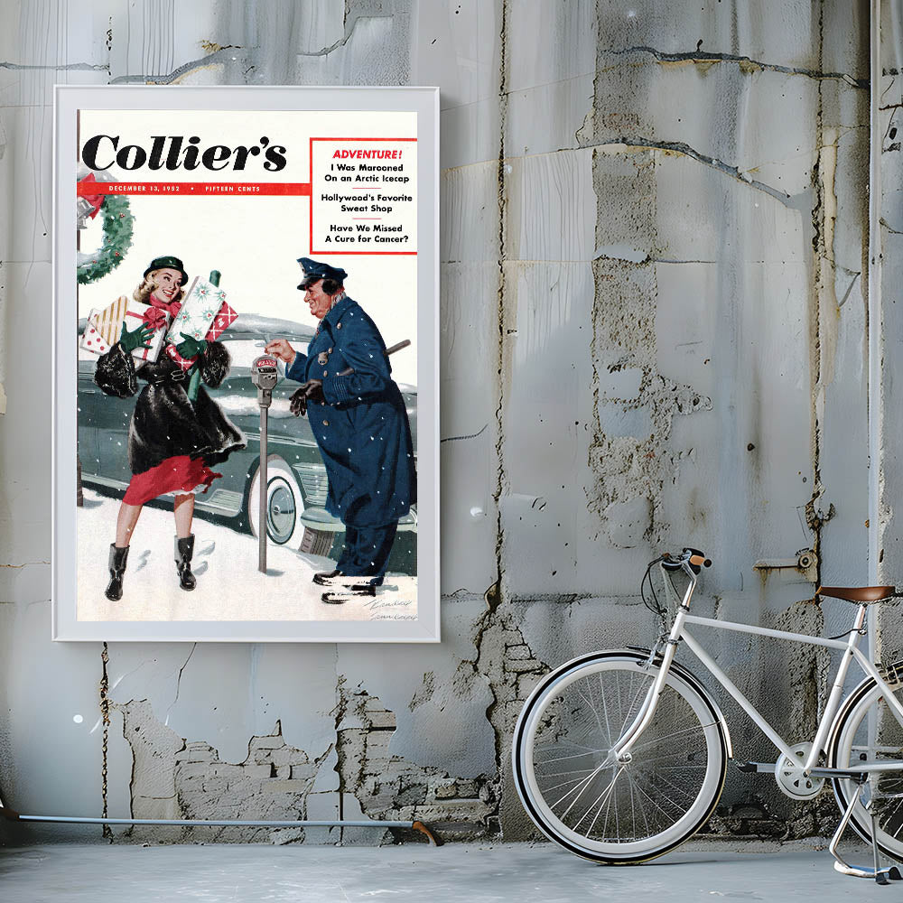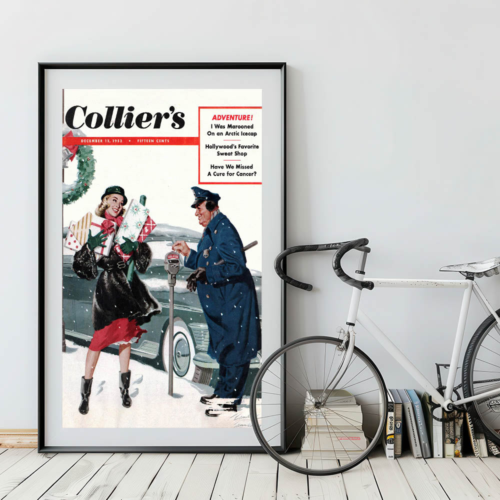 Capture the charm of a bygone era with this Vintage Magazine Cover Art from Collier's magazine. Featuring a joyful holiday scene with a woman carrying Christmas gifts and a friendly interaction with a policeman, this cover brings warmth and nostalgia to any space. The vibrant reds, greens, and snowy backdrop create a festive atmosphere perfect for the holiday season, while adding a touch of retro magazine cover prints to your home. Whether you’re decorating for the holidays or seeking nostalgic vintage decor prints, this piece will evoke fond memories of simpler times.