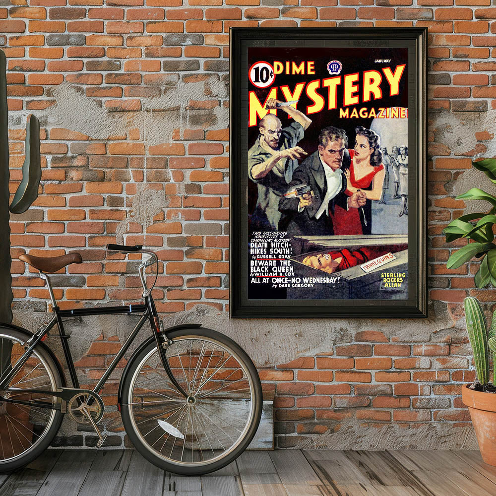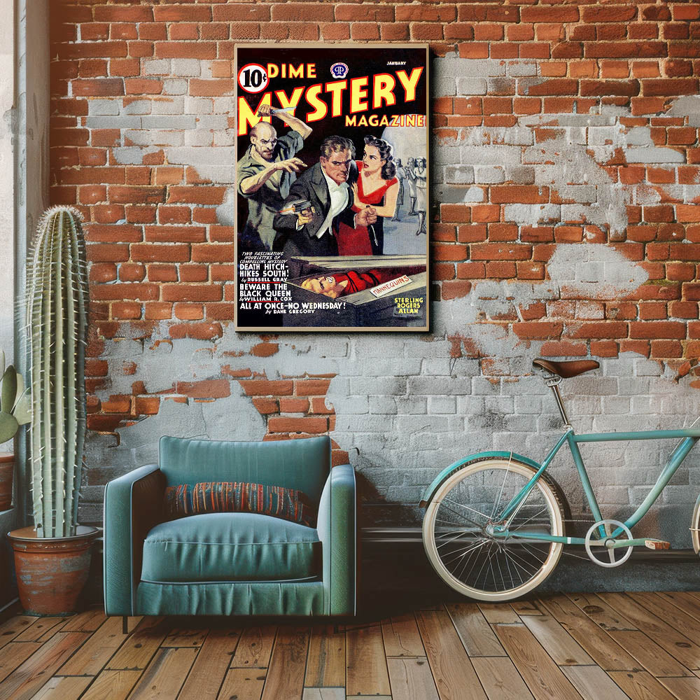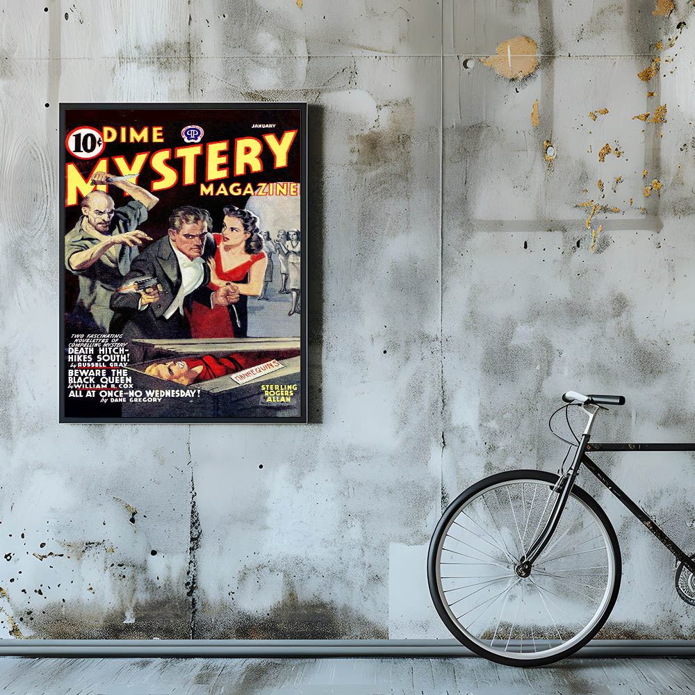 Discover a timeless piece of history with this Vintage Magazine Cover Art, featuring a captivating scene from the Dime Mystery Magazine. This Retro Magazine Cover Print brings a dramatic and nostalgic touch to any space, perfect for lovers of classic detective stories and vintage pulp fiction. Whether you're an avid collector or simply seeking nostalgic vintage decor prints, this iconic piece will elevate your home decor.