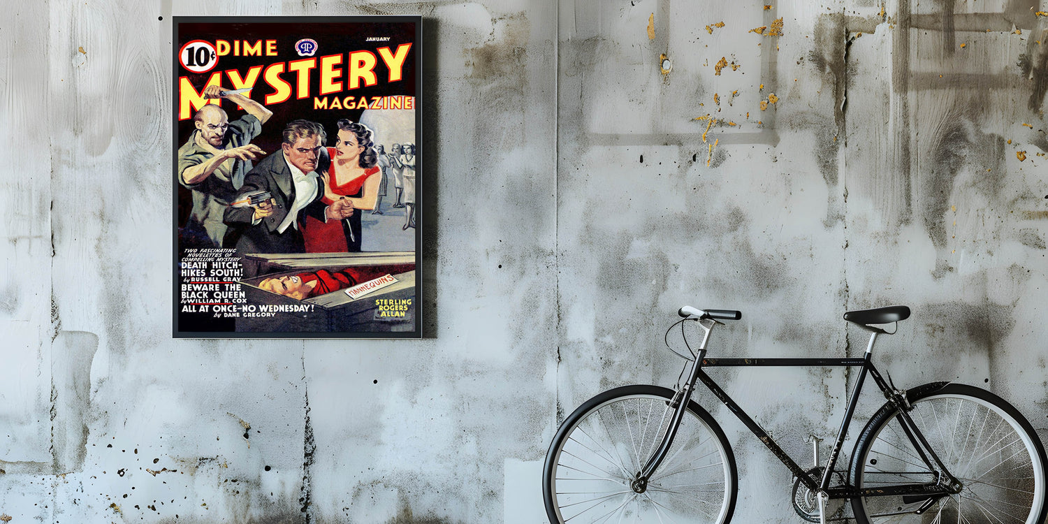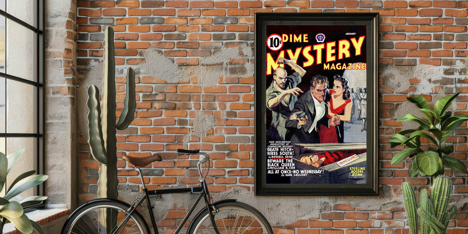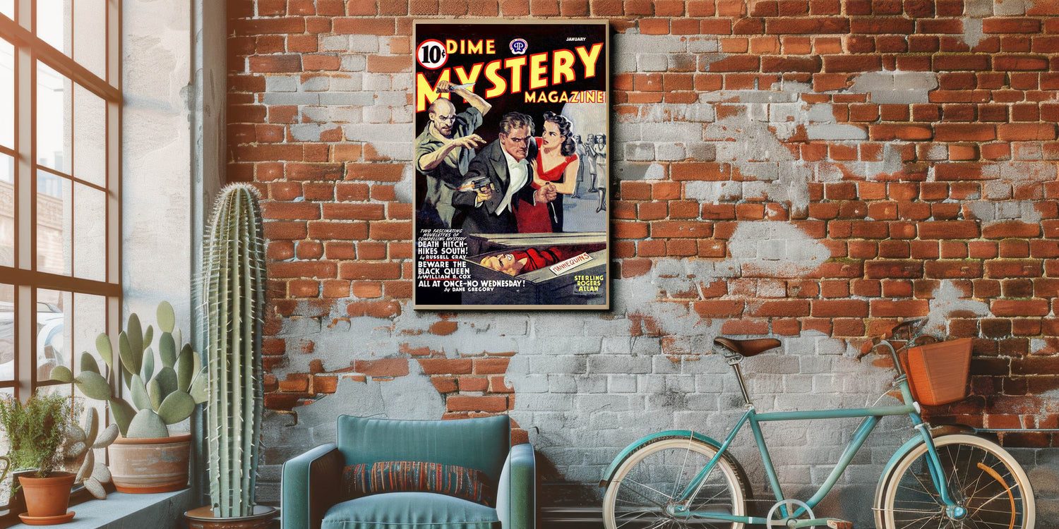 Discover a timeless piece of history with this Vintage Magazine Cover Art, featuring a captivating scene from the Dime Mystery Magazine. This Retro Magazine Cover Print brings a dramatic and nostalgic touch to any space, perfect for lovers of classic detective stories and vintage pulp fiction. Whether you're an avid collector or simply seeking nostalgic vintage decor prints, this iconic piece will elevate your home decor.