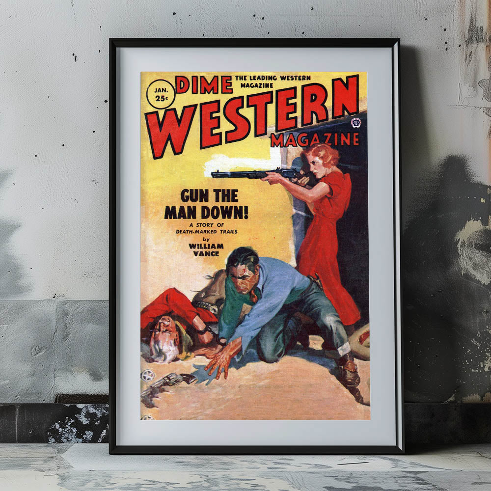 Bring the intense action of the Old West into your home with this Vintage Magazine Cover Art from the Dime Western Magazine. The cover art, featuring a dramatic gunfight, is a perfect blend of tension and Western adventure. This Retro Magazine Cover Print is ideal for fans of action-packed stories and lovers of classic magazine cover artwork. It's an excellent piece for nostalgic vintage decor prints and a perfect fit for any space seeking a bold Western theme.