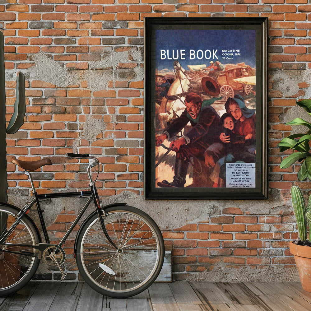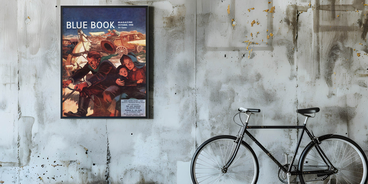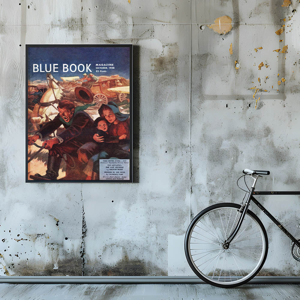 Bring the excitement of the Wild West to your space with this vintage Blue Book Magazine cover from October 1948. Featuring an action-packed scene of a family in a runaway wagon, this illustration captures the thrilling moments of the American frontier. The intensity and energy of this moment, as the family races through the plains, is perfectly encapsulated in this retro print.