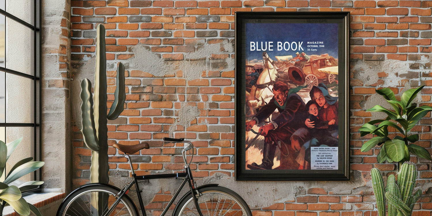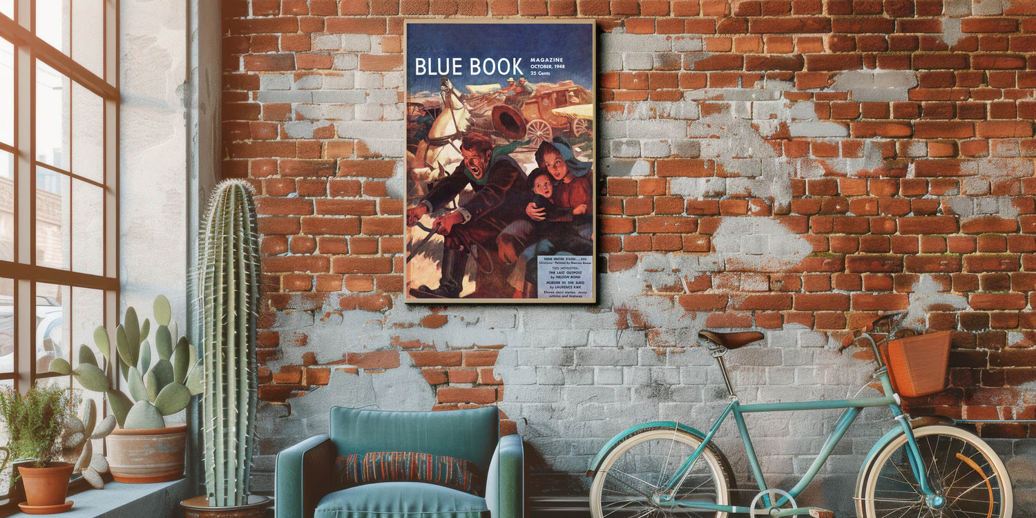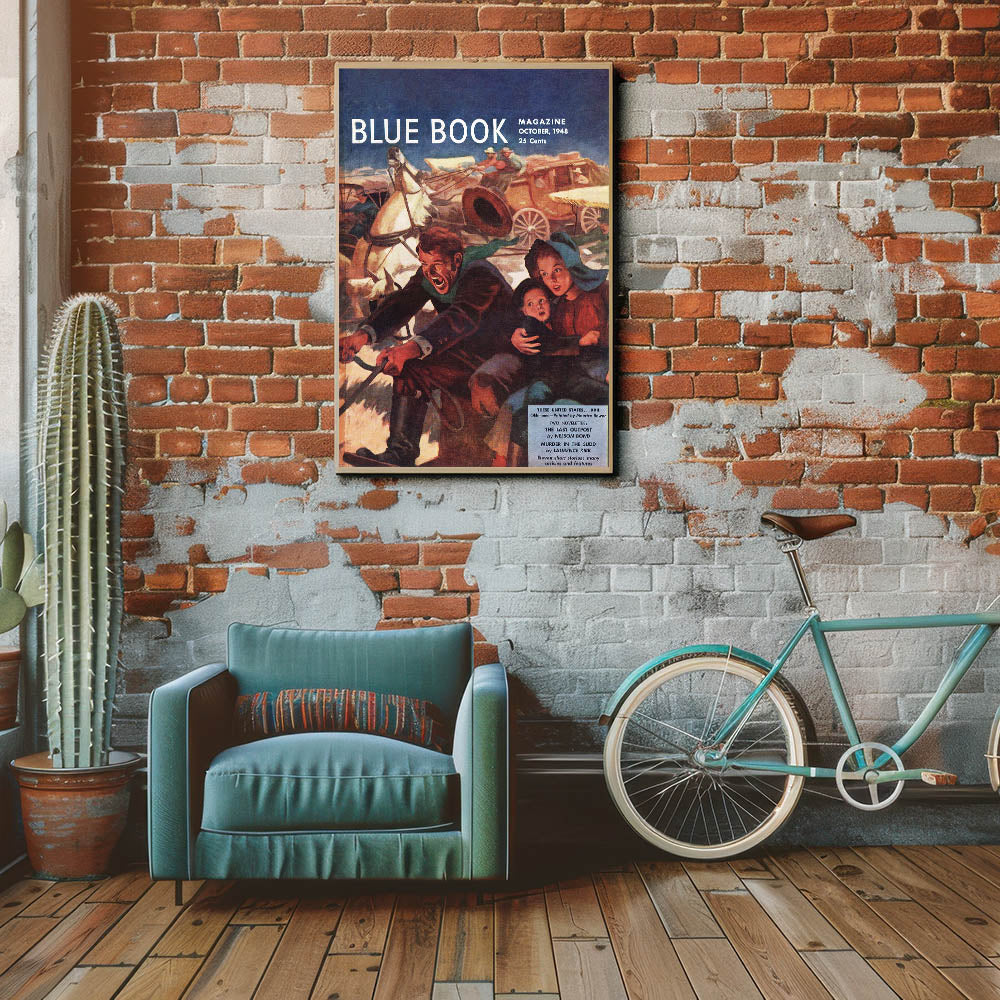 Bring the excitement of the Wild West to your space with this vintage Blue Book Magazine cover from October 1948. Featuring an action-packed scene of a family in a runaway wagon, this illustration captures the thrilling moments of the American frontier. The intensity and energy of this moment, as the family races through the plains, is perfectly encapsulated in this retro print.