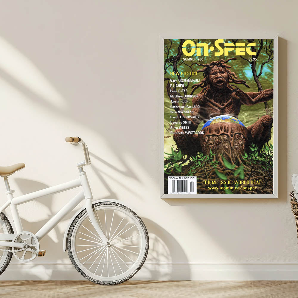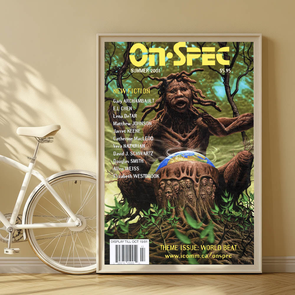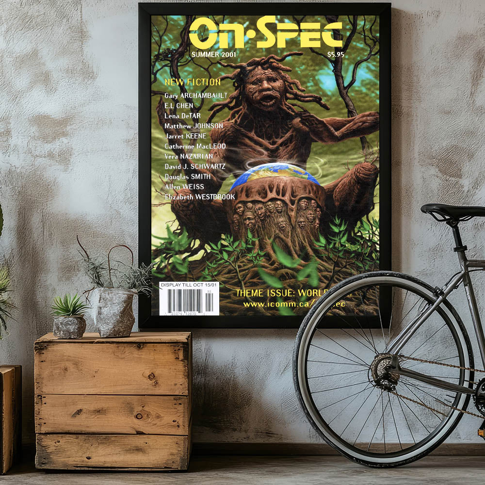 Step into the world of fantasy with this Vintage Magazine Cover Art from On Spec Summer 2001. The captivating cover features an intricately designed tree-man creature that blends nature and fantasy with a surreal twist. This retro magazine cover print perfectly captures the essence of speculative fiction with its vibrant and detailed artwork.