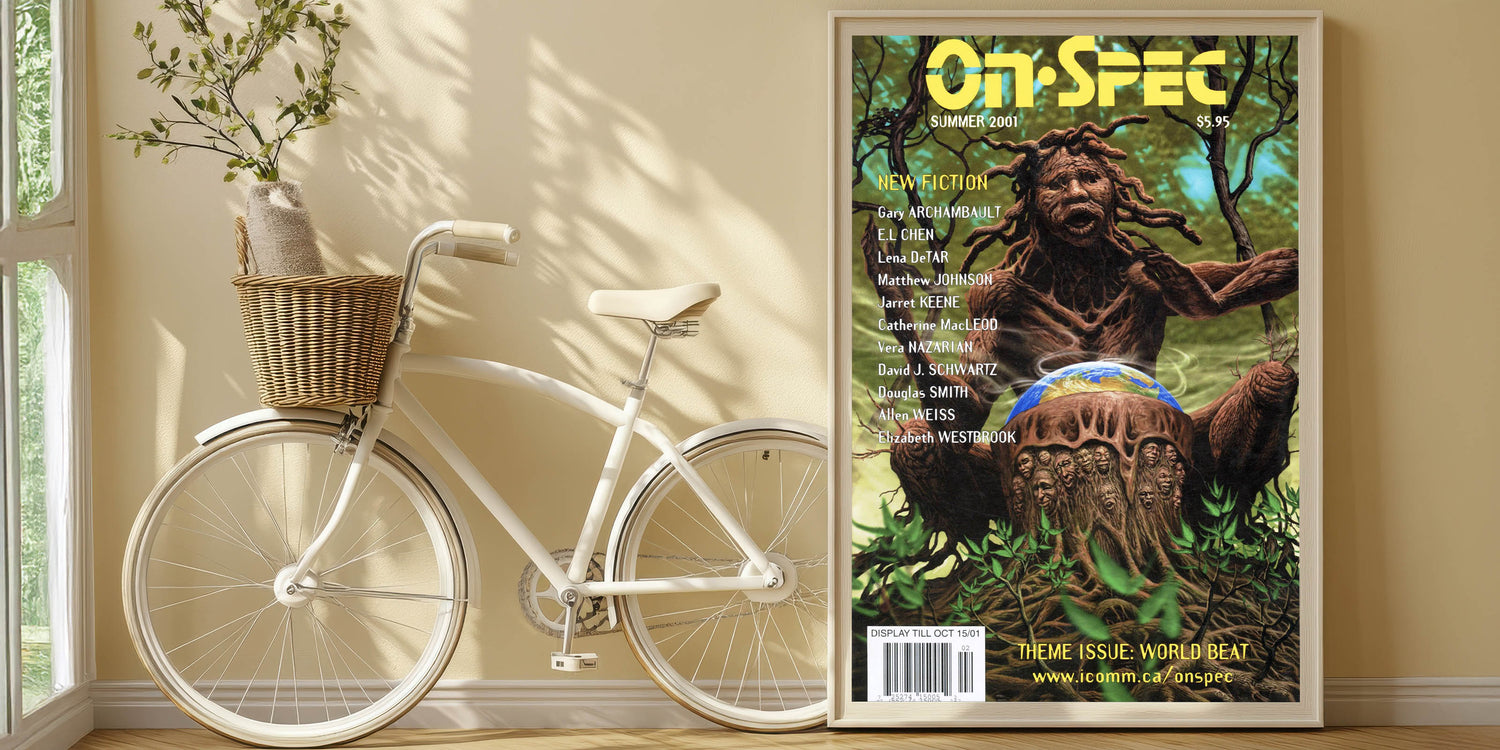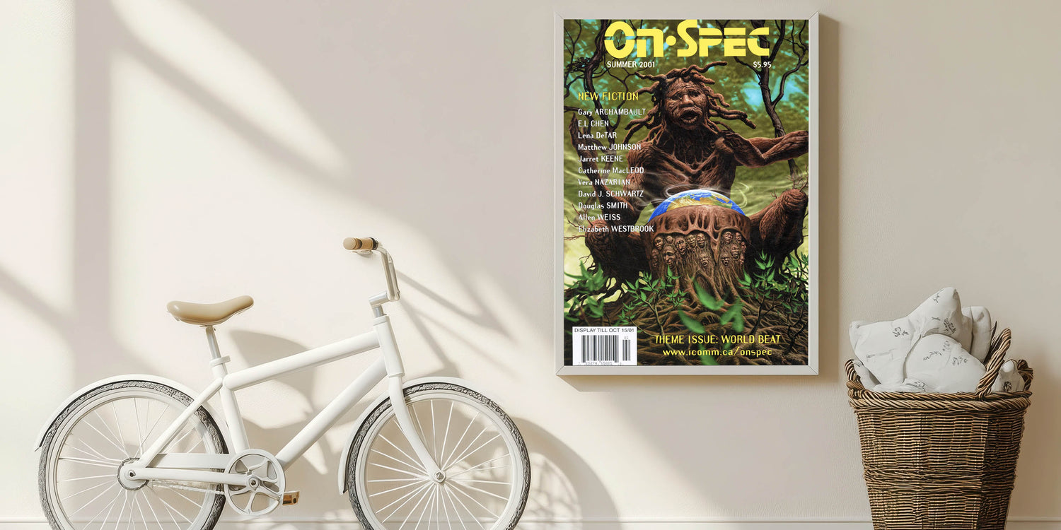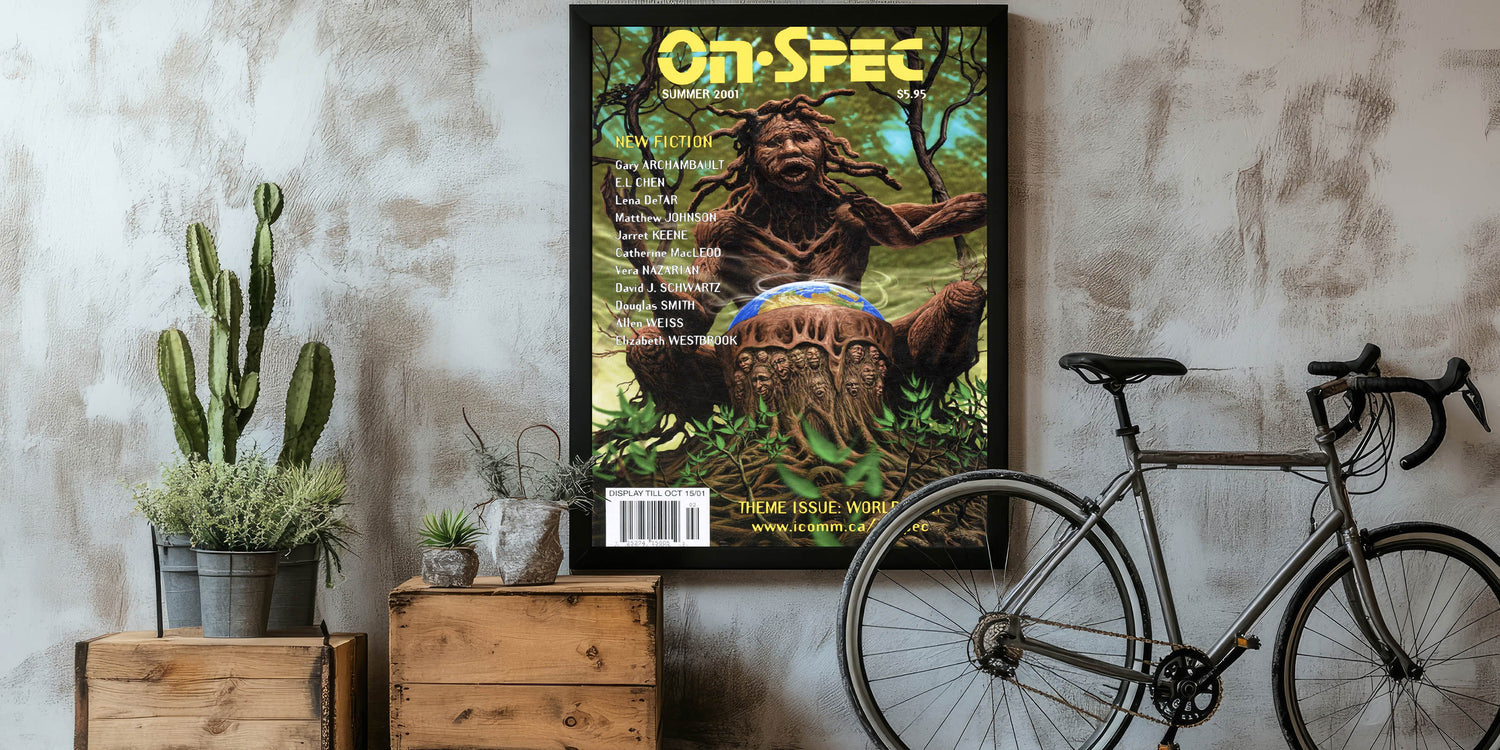 Step into the world of fantasy with this Vintage Magazine Cover Art from On Spec Summer 2001. The captivating cover features an intricately designed tree-man creature that blends nature and fantasy with a surreal twist. This retro magazine cover print perfectly captures the essence of speculative fiction with its vibrant and detailed artwork.