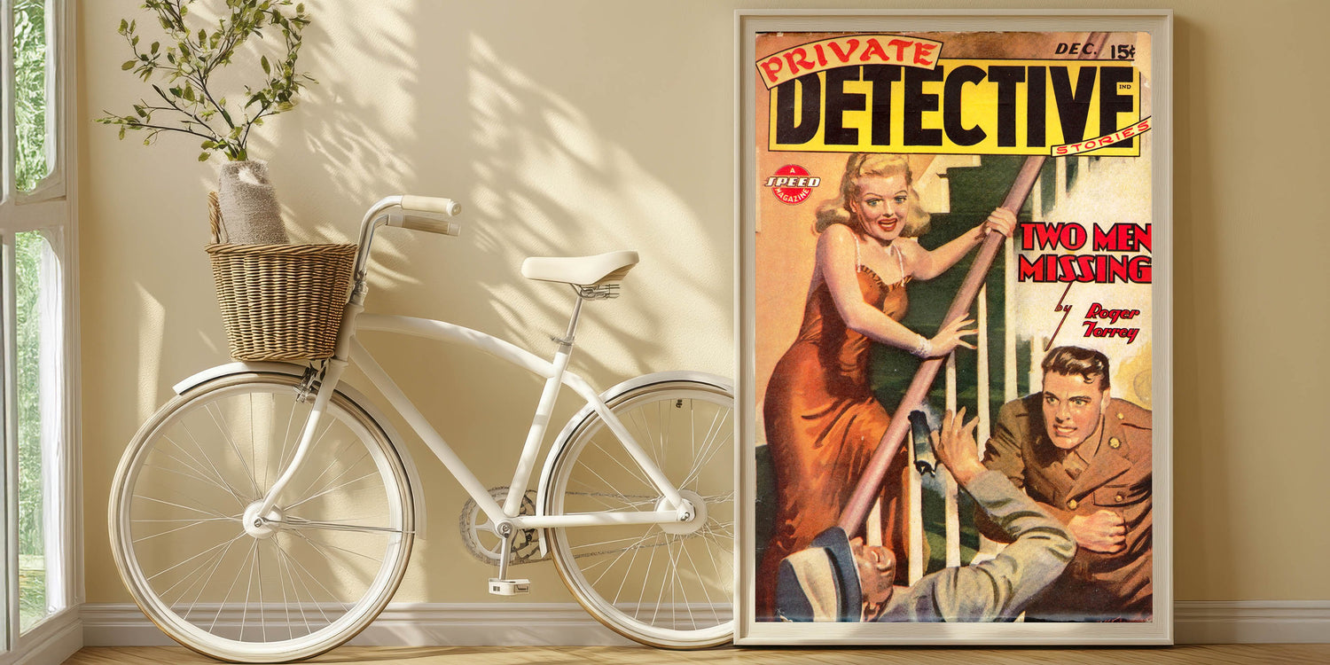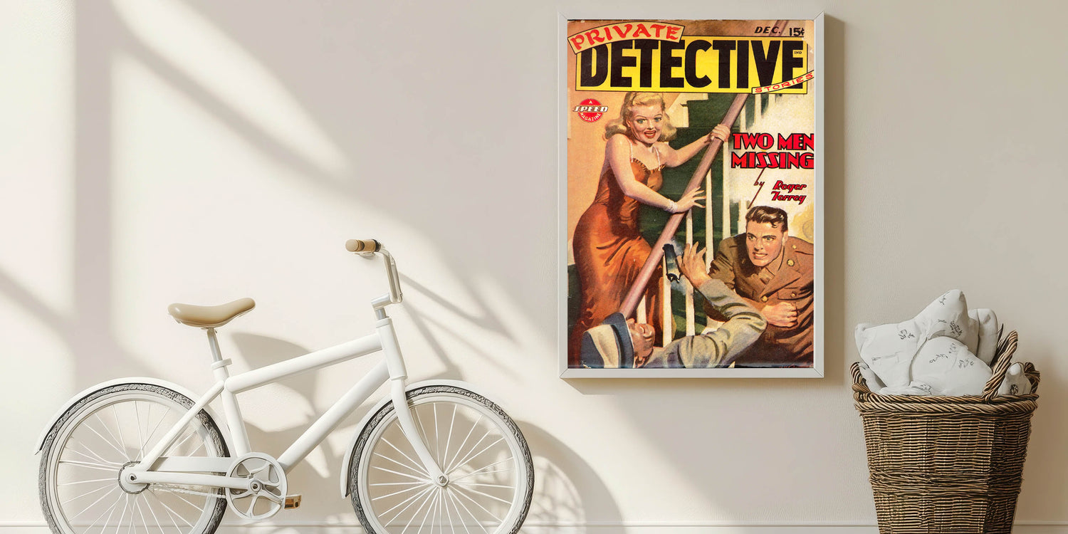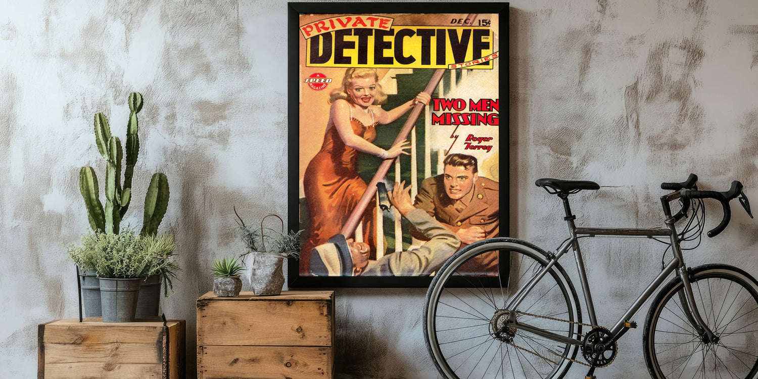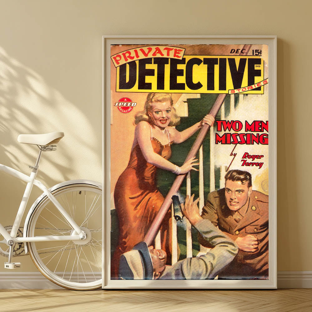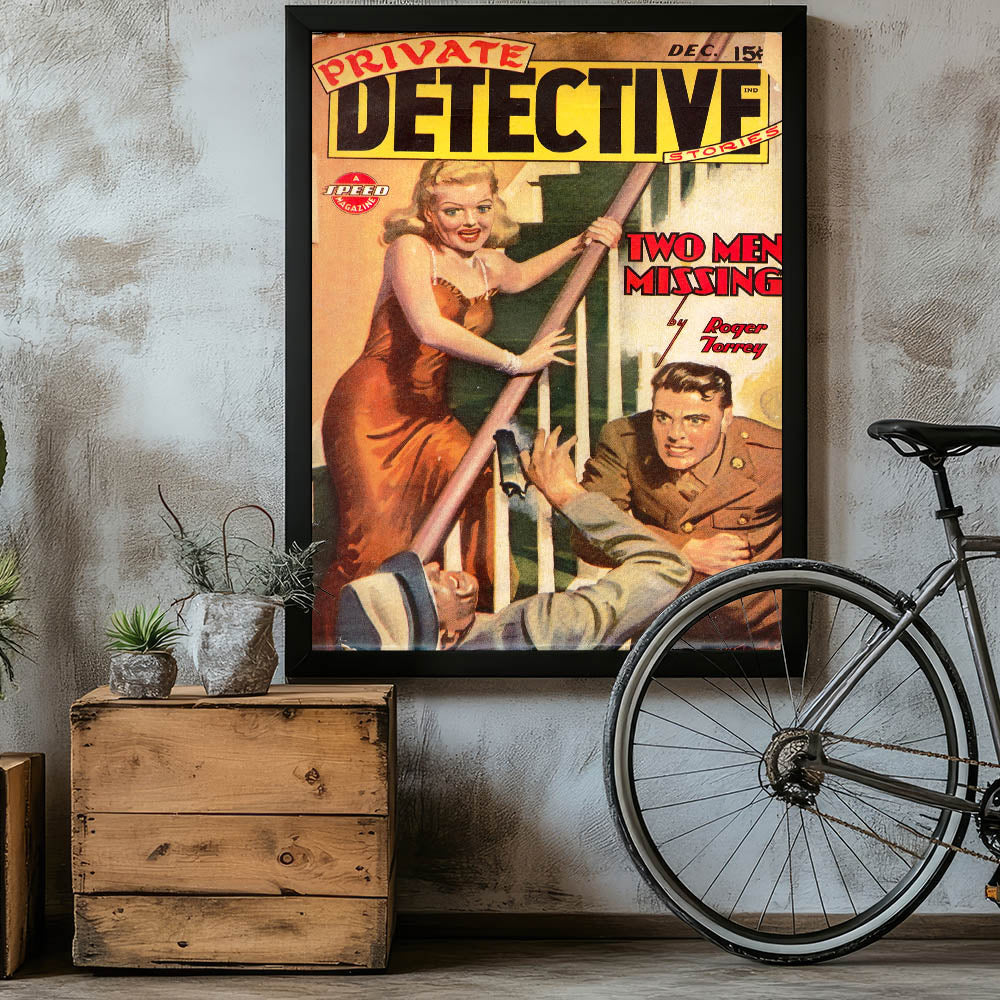 Add a dash of mystery and suspense to your home with this Vintage Magazine Cover Art, showcasing a retro detective noir magazine print from Private Detective Stories. This iconic cover, featuring the story "Two Men Missing," illustrates a dramatic scene between a femme fatale and a detective, exuding the tension and intrigue of classic detective fiction. The vivid colors and captivating illustration will make a bold statement in any room, perfect for fans of nostalgic vintage decor prints and classic magazine cover artwork.