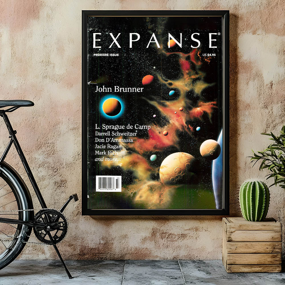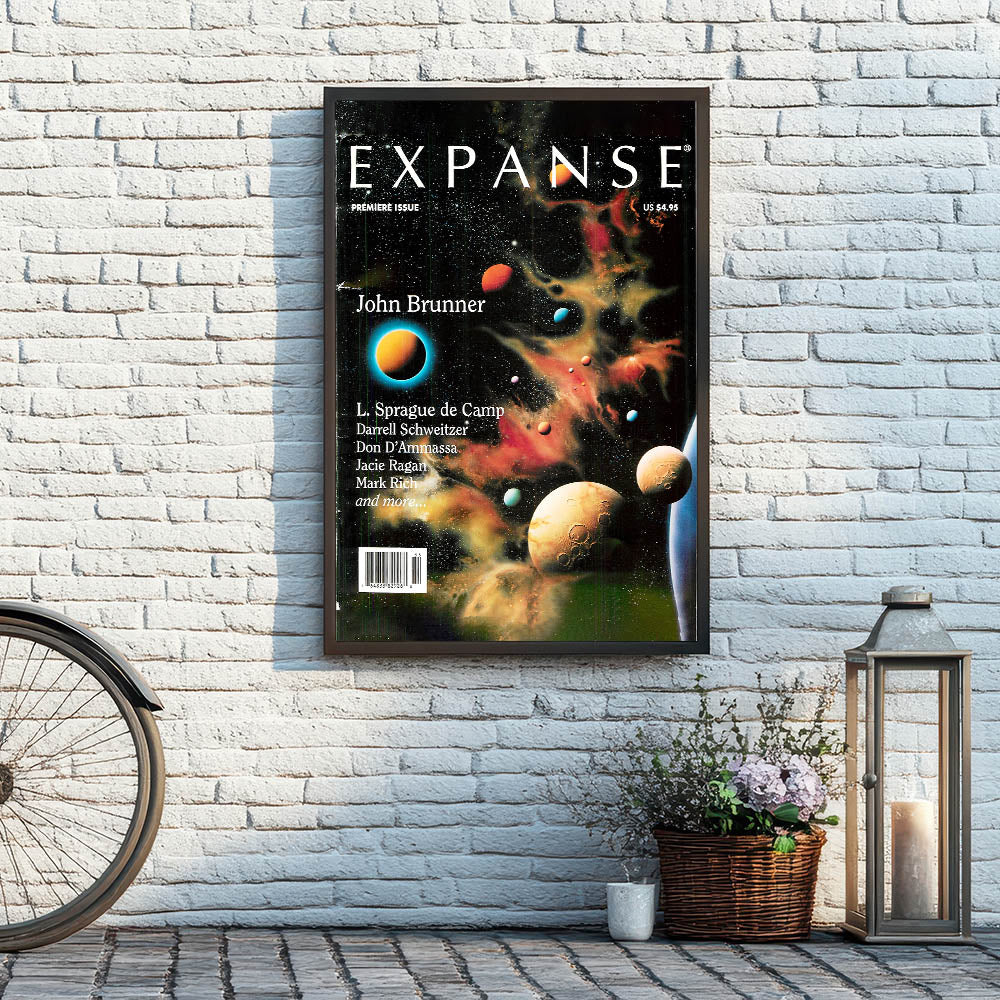 Bring the wonder of space exploration into your home with this vintage magazine cover wall art, featuring a striking retro sci-fi space scene. This classic magazine cover artwork from the EXPANSE premiere issue showcases vibrant planets, glowing nebulae, and a mesmerizing cosmic landscape, making it the perfect nostalgic vintage decor print for any space enthusiast or collector.