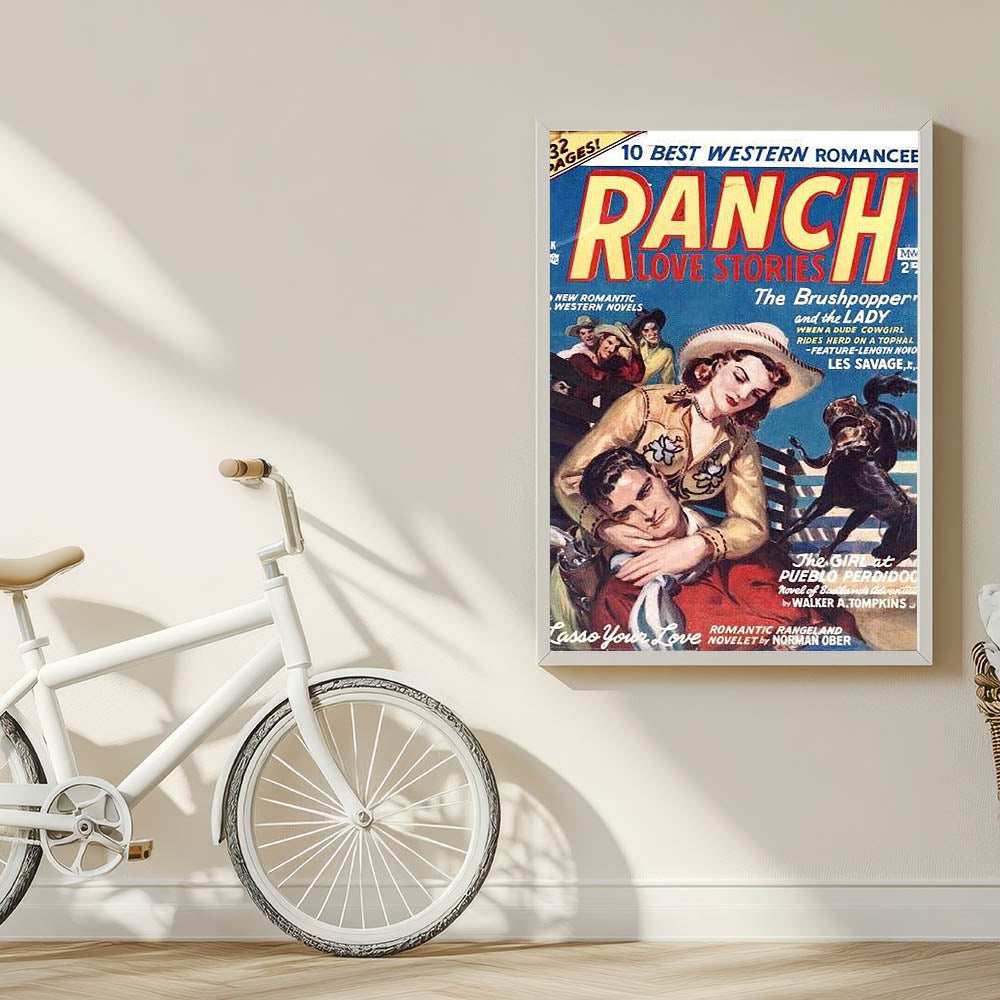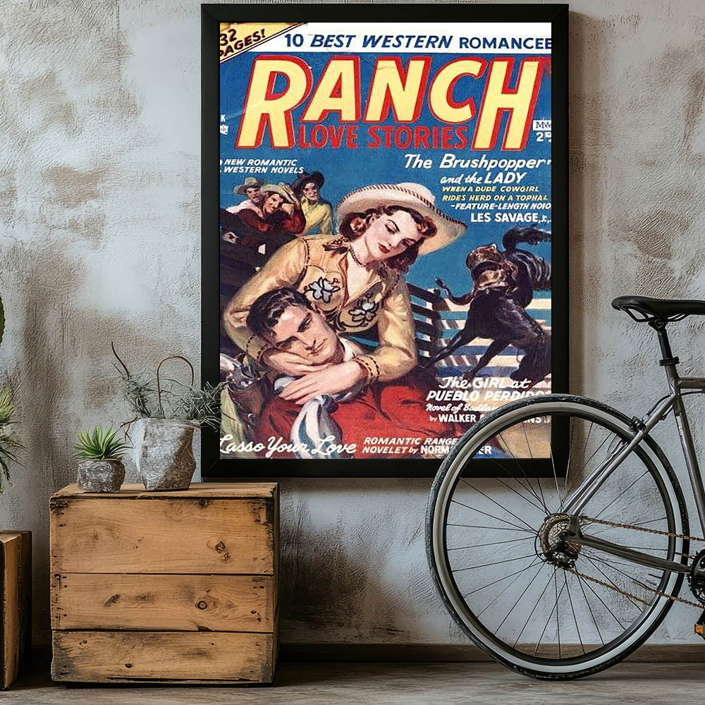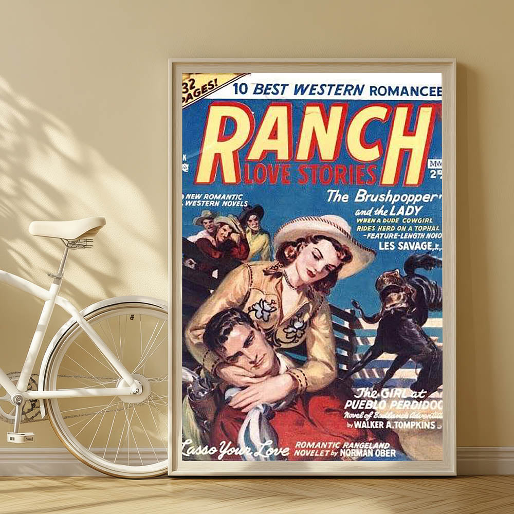 Step into the world of romance and adventure with this Vintage Magazine Cover Art, featuring a retro Western romance magazine print from Ranch Love Stories. This striking cover showcases a romantic cowboy tale, bringing together the ruggedness of the West and the allure of love. With bold, vibrant colors and an iconic illustration, this cover is perfect for fans of nostalgic vintage decor prints and classic Western themes.