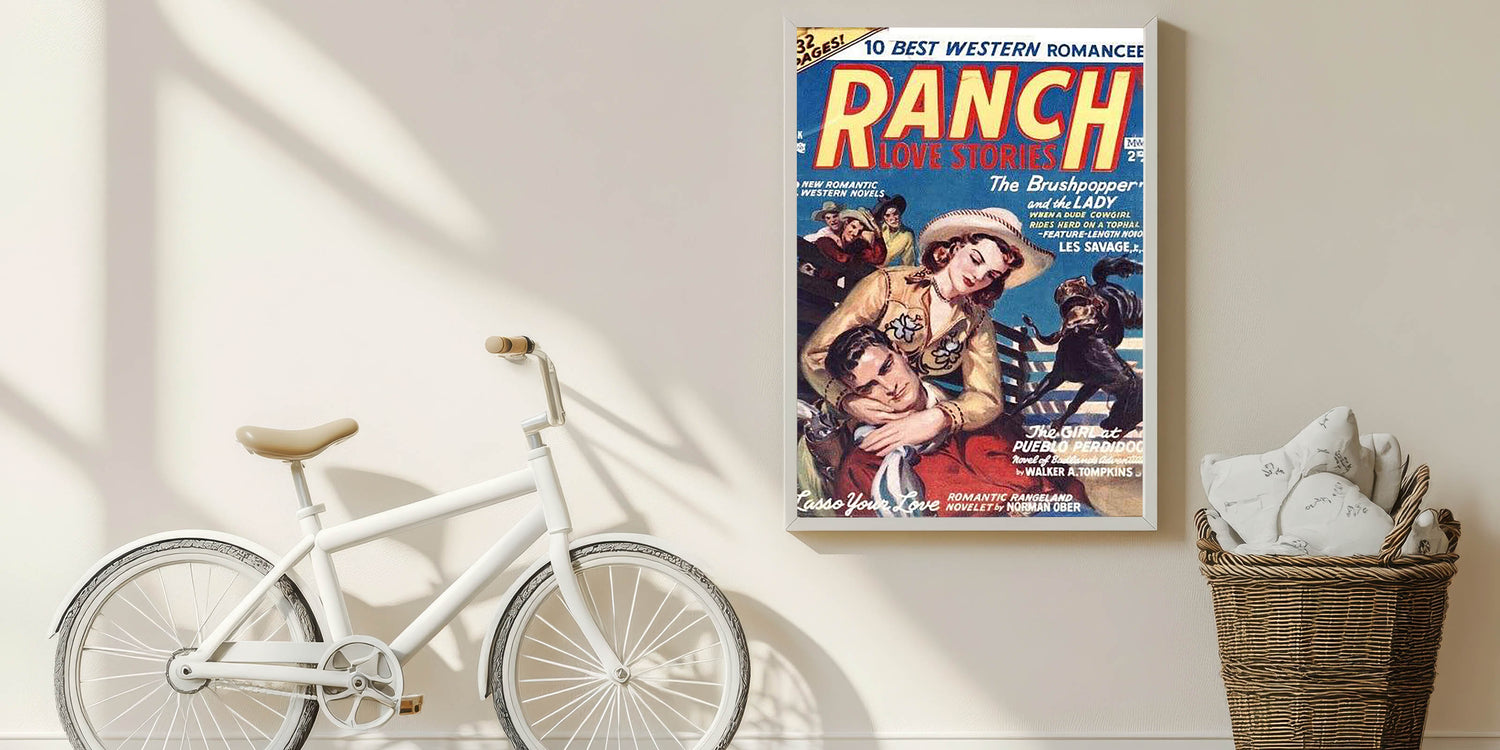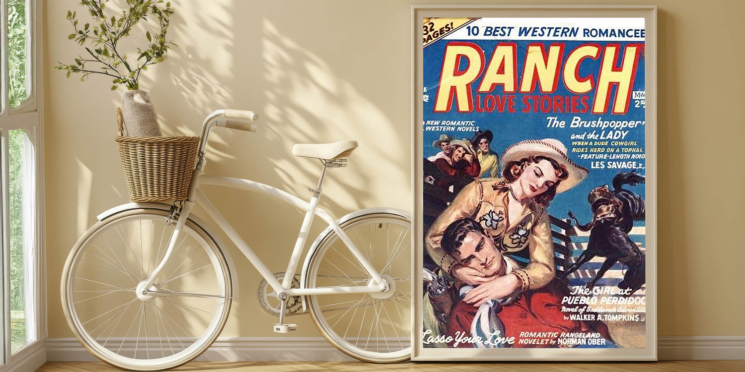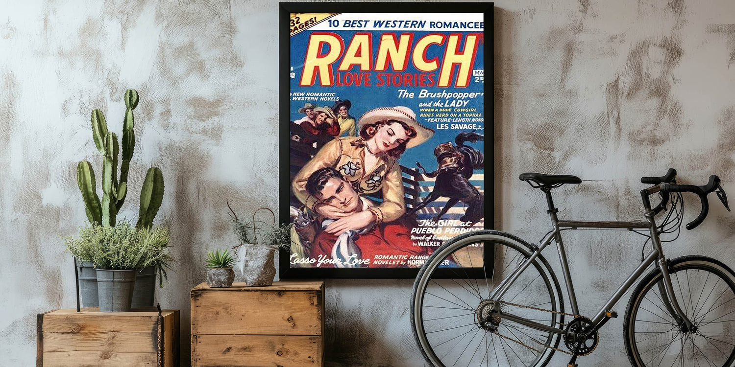This vintage magazine cover print brings the charm of the Old West and romance to your home. Whether you're decorating a Western-themed space or simply looking for a unique addition to your collection, this print will evoke a sense of adventure and timeless love.