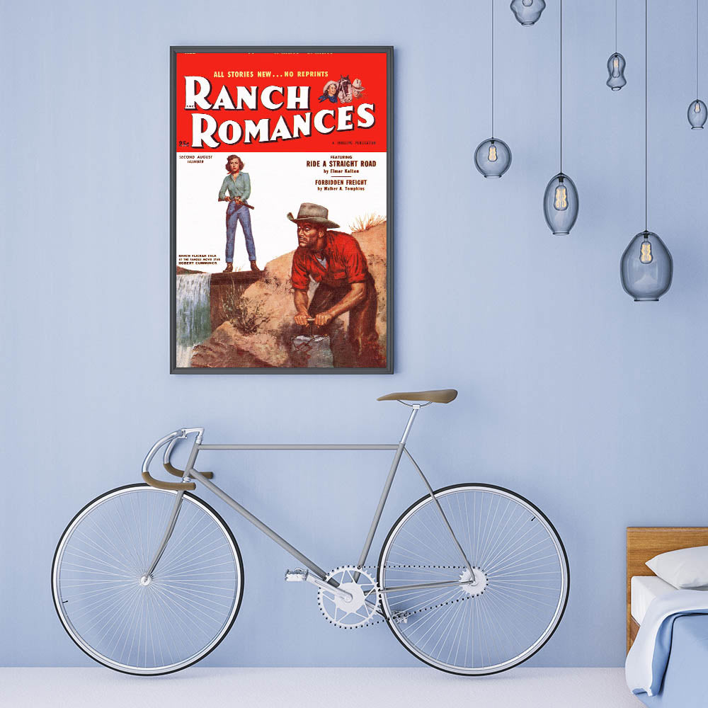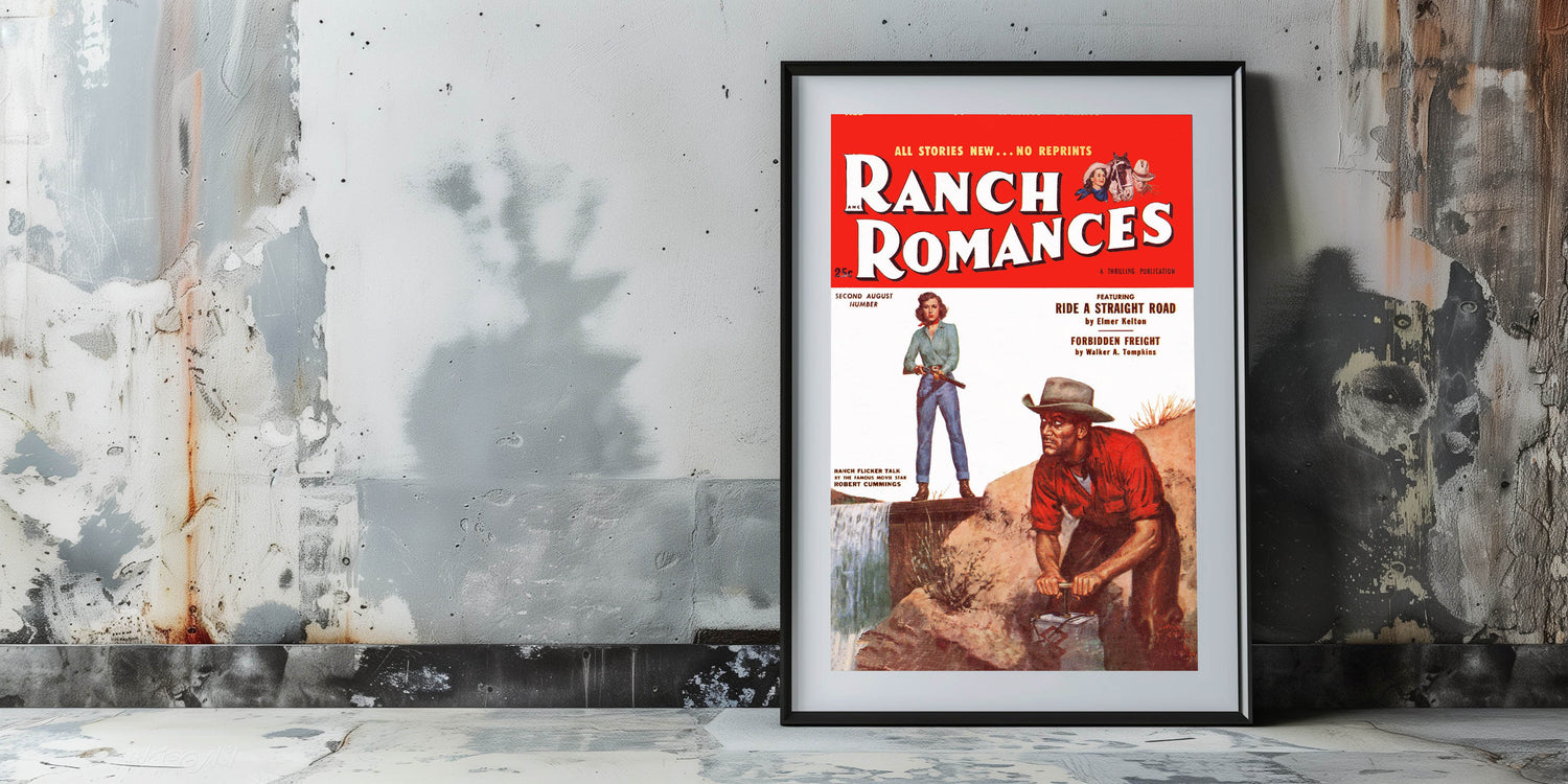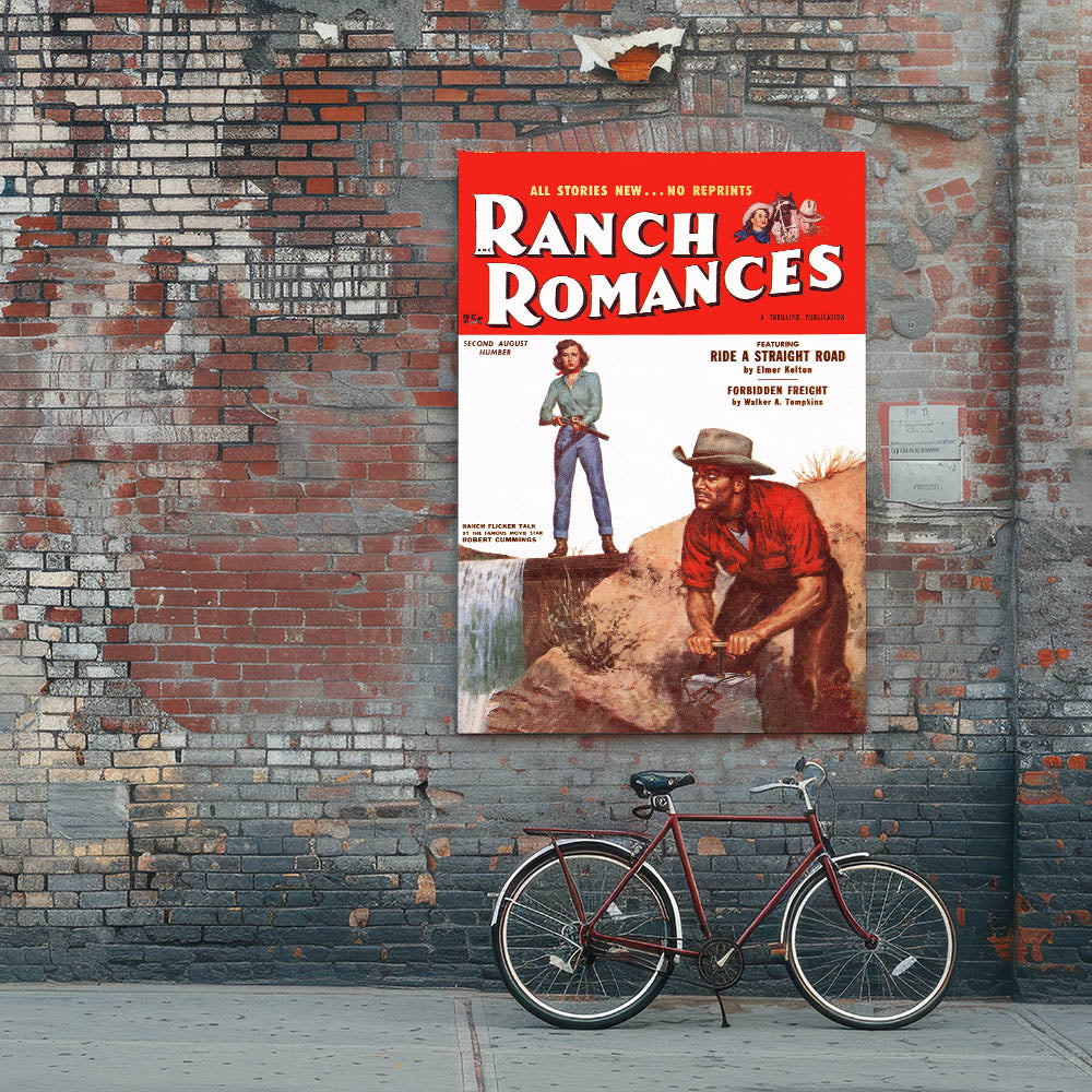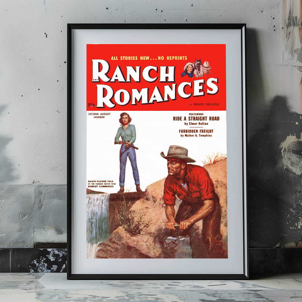 Step into the wild world of romance and adventure with this Vintage Magazine Cover Art, showcasing a retro Western romance magazine print from Ranch Romances. This vibrant cover features a dramatic scene of a rugged cowboy and a determined woman, capturing the spirit of the West in its full glory. The bold colors and captivating design make it a perfect addition to any vintage or Western-themed décor.
