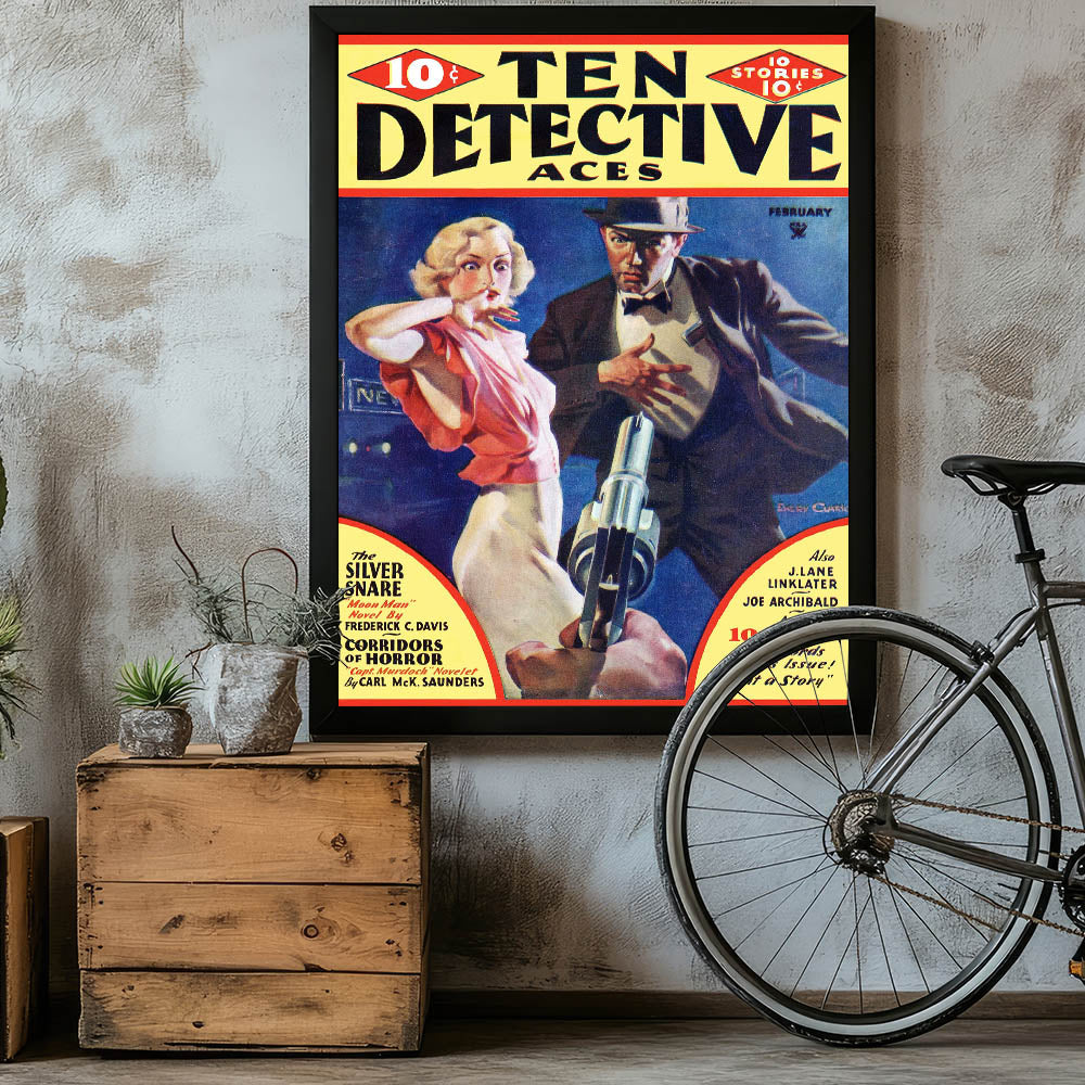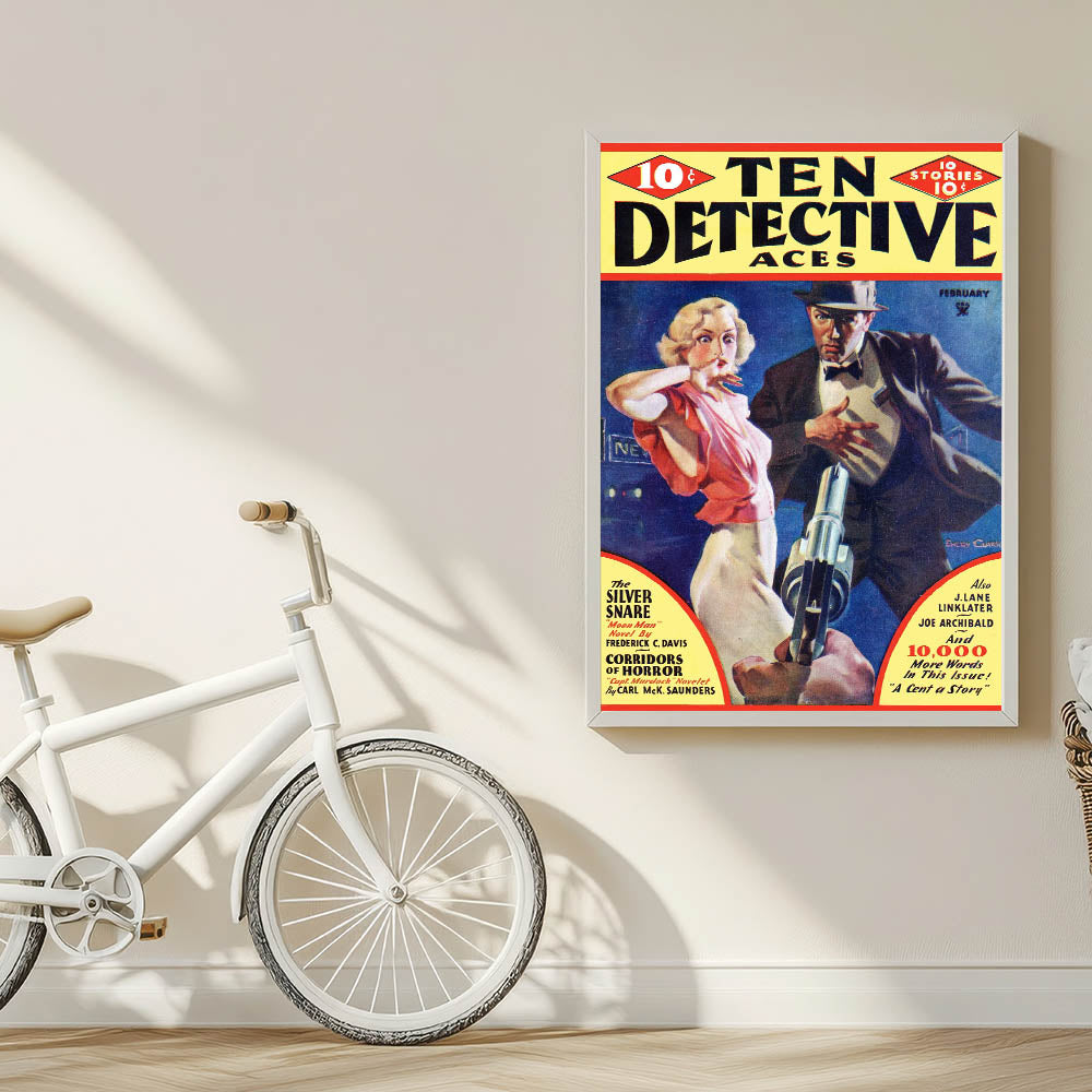 Step into the world of classic detective stories with this Vintage Magazine Cover Art from Ten Detective Aces, February edition, featuring the thrilling story The Silver Snare. The cover art, showcasing a tense moment between a woman and a man holding a revolver, exudes the suspense and danger characteristic of the detective genre. The bold colors and dynamic illustration capture the essence of vintage crime fiction.