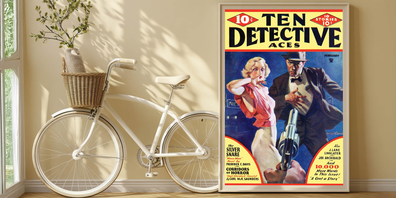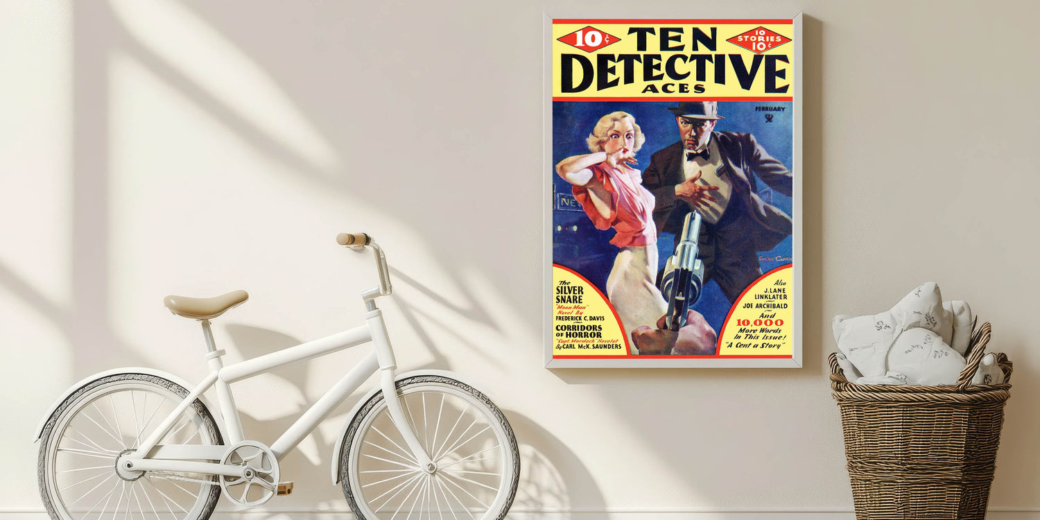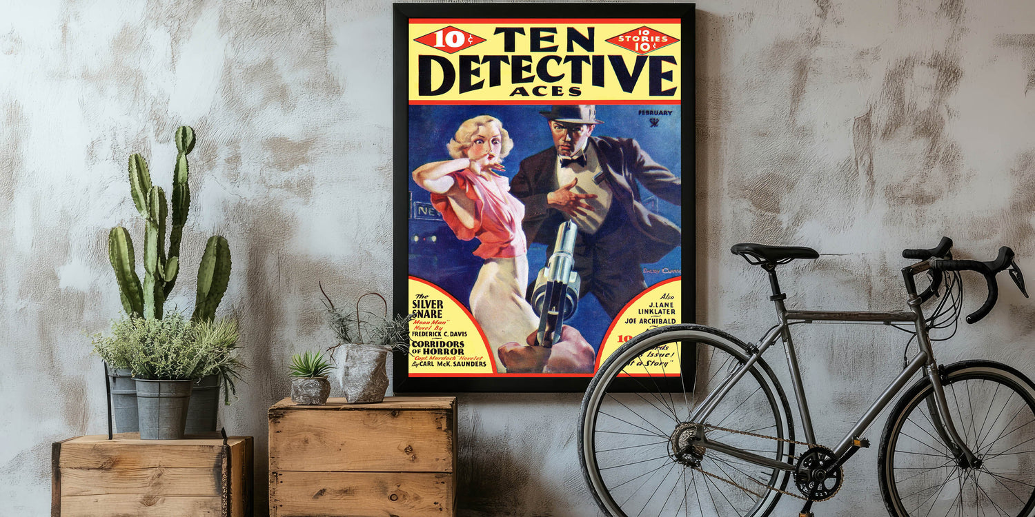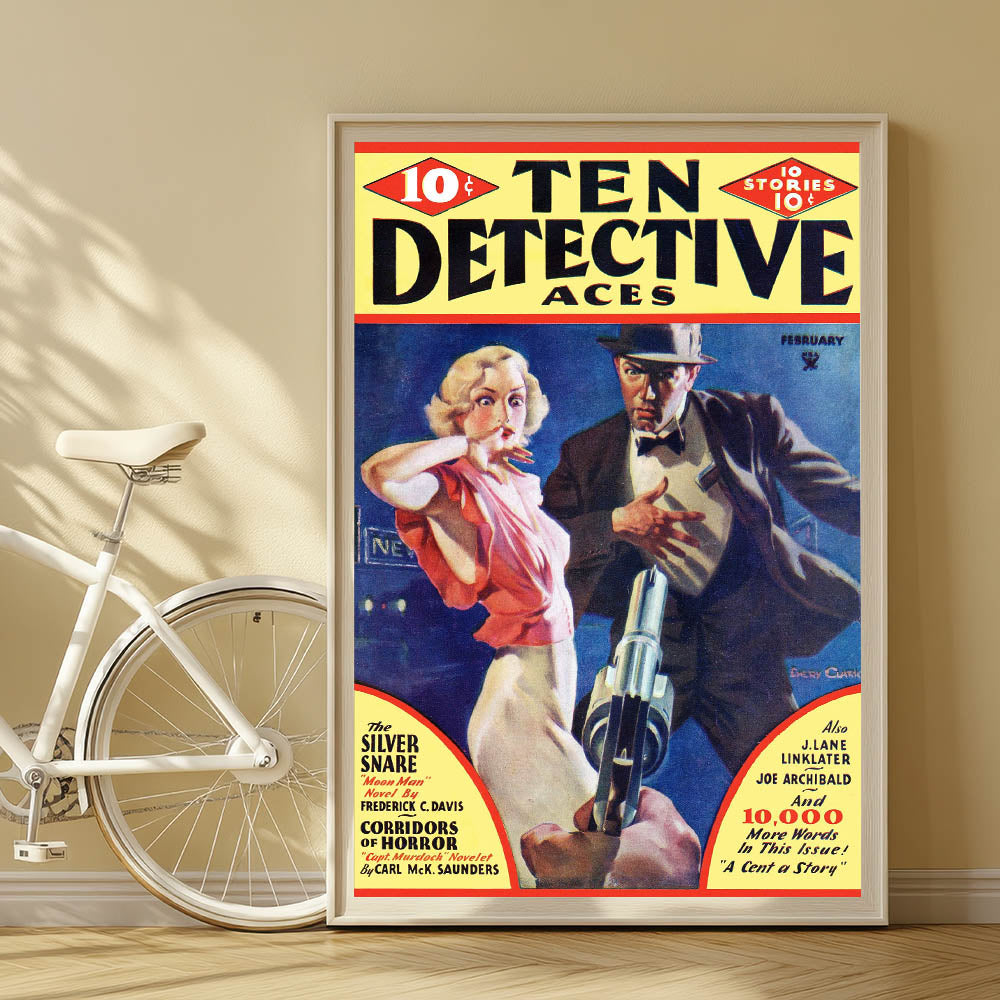 This vintage magazine cover wall art will add a bold, dramatic touch to any room. Whether you're a collector of retro prints for home decor or a fan of detective fiction, this piece captures the essence of classic mystery stories.