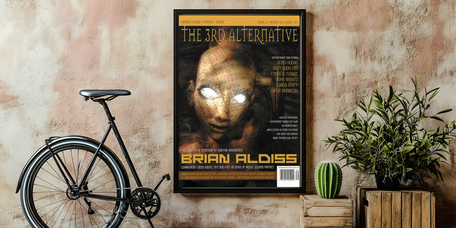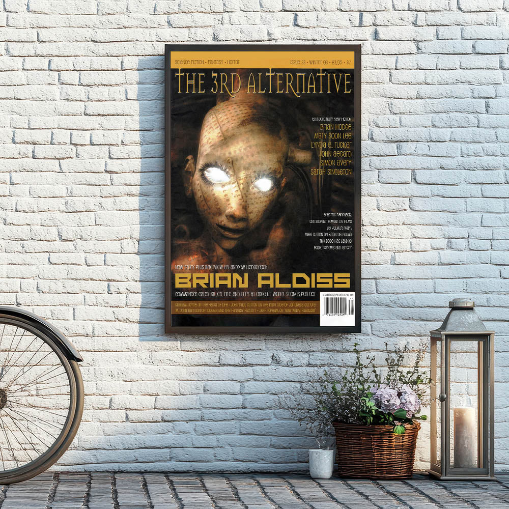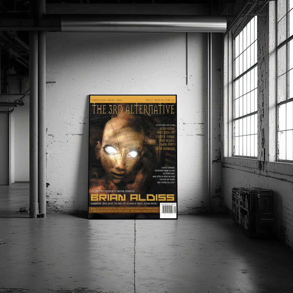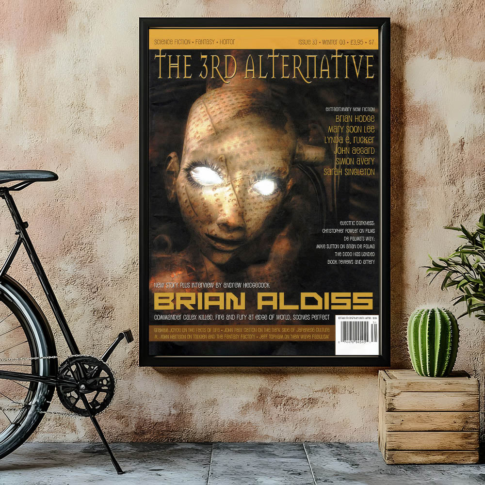 This vintage magazine cover art from The 3rd Alternative, Winter 2003, is a captivating representation of science fiction, fantasy, and horror. Featuring an eerie, otherworldly face with glowing eyes, this cover perfectly captures the essence of the genre. The striking blend of dark tones with hints of metallic gold in the typography adds an element of mystery, making it a standout piece for fans of speculative fiction and unique magazine art.