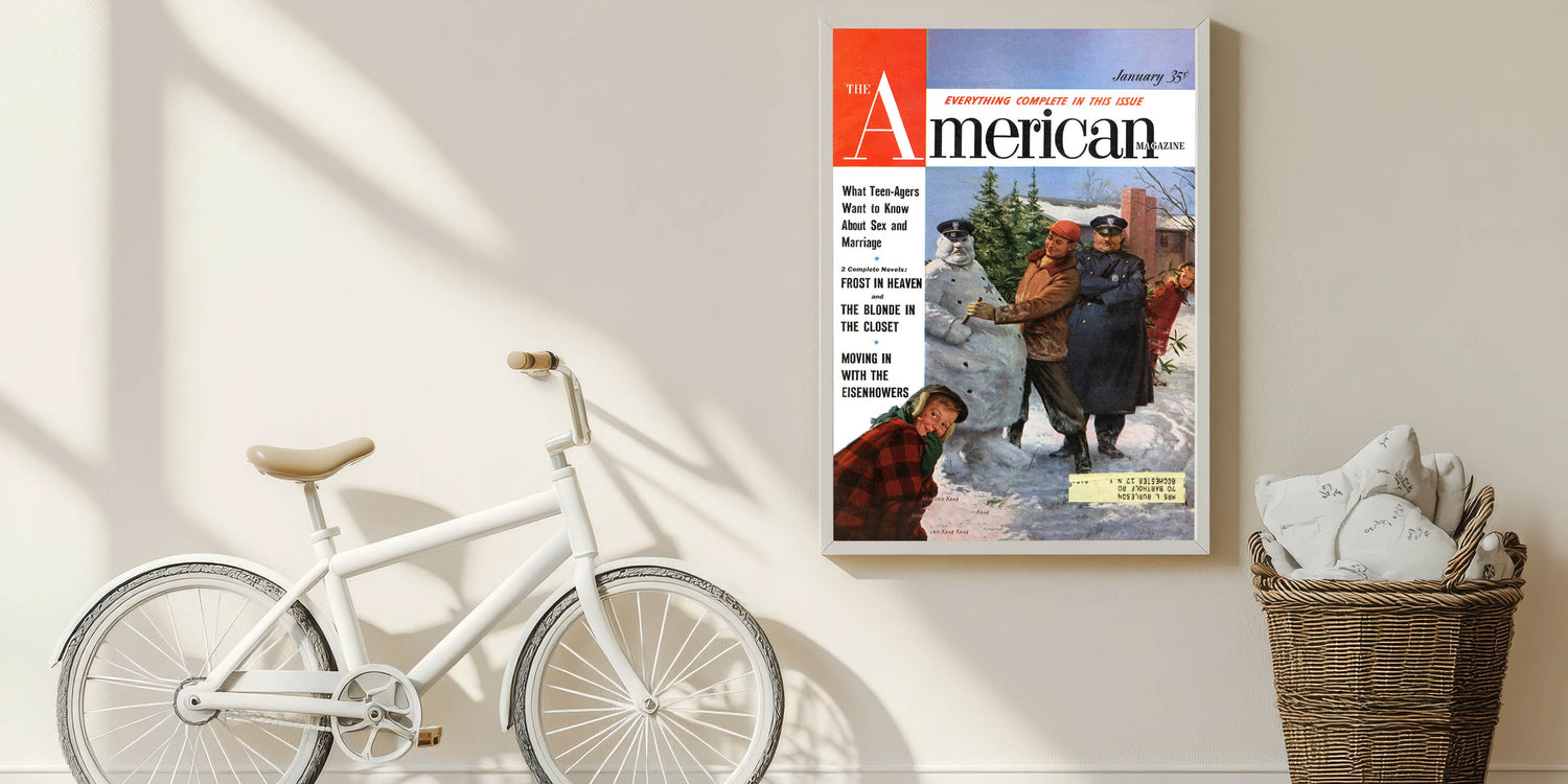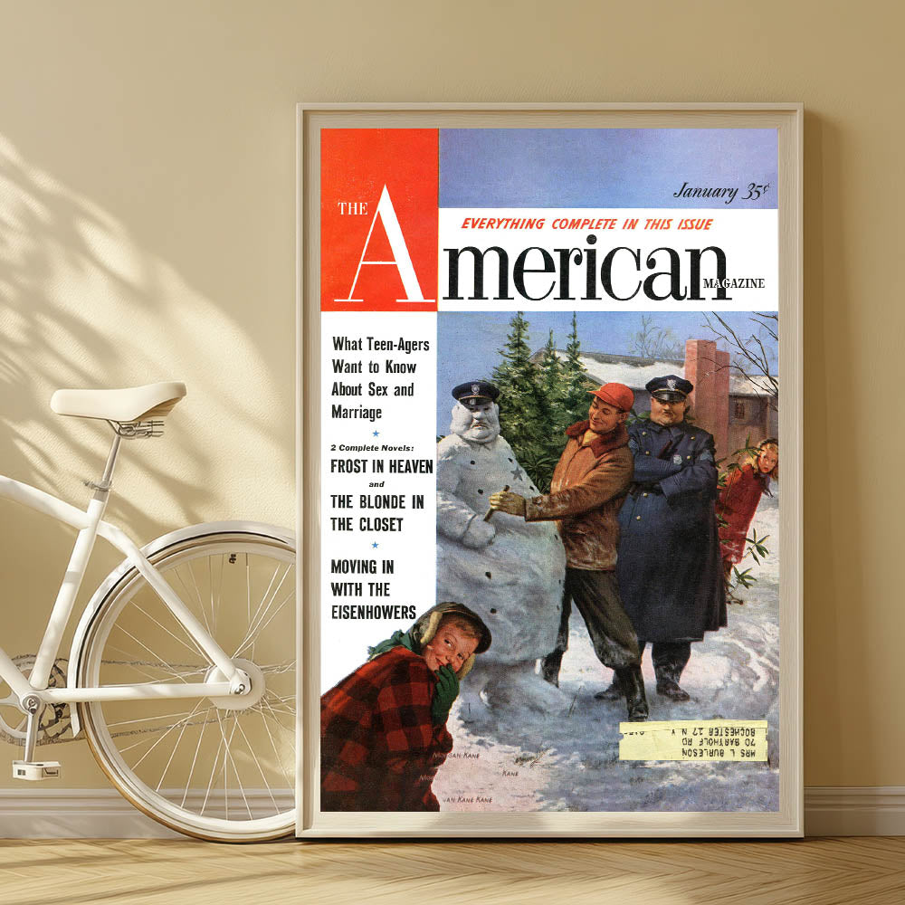 Step into a nostalgic winter scene with this Vintage Magazine Cover Art from The American Magazine, January edition. Featuring a heartwarming scene of a child and two police officers building a snowman, this cover perfectly captures the spirit of winter and childhood fun. The bright and colorful illustration by Morgan Kane combines elements of warmth, humor, and the carefree joy of the holiday season. The headline, What Teenagers Want to Know About Sex and Marriage, adds a retro touch to the cover, capturing the cultural and social themes of the era.