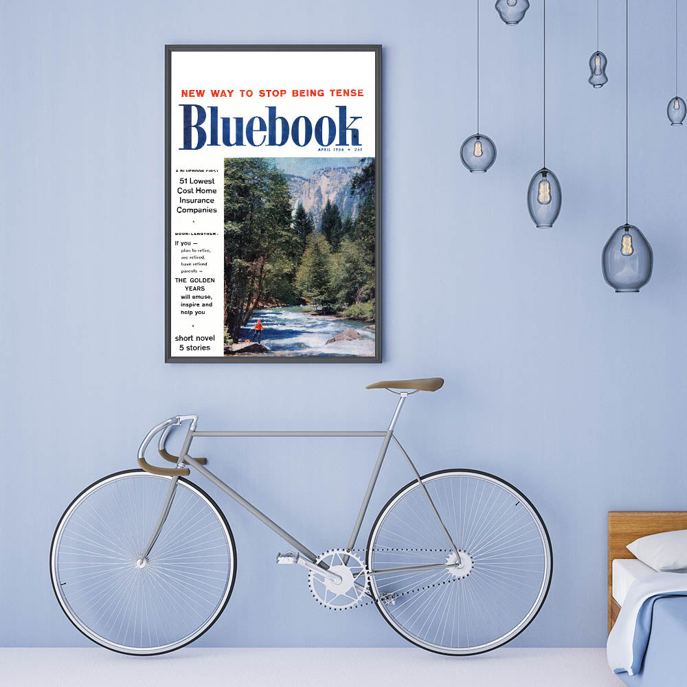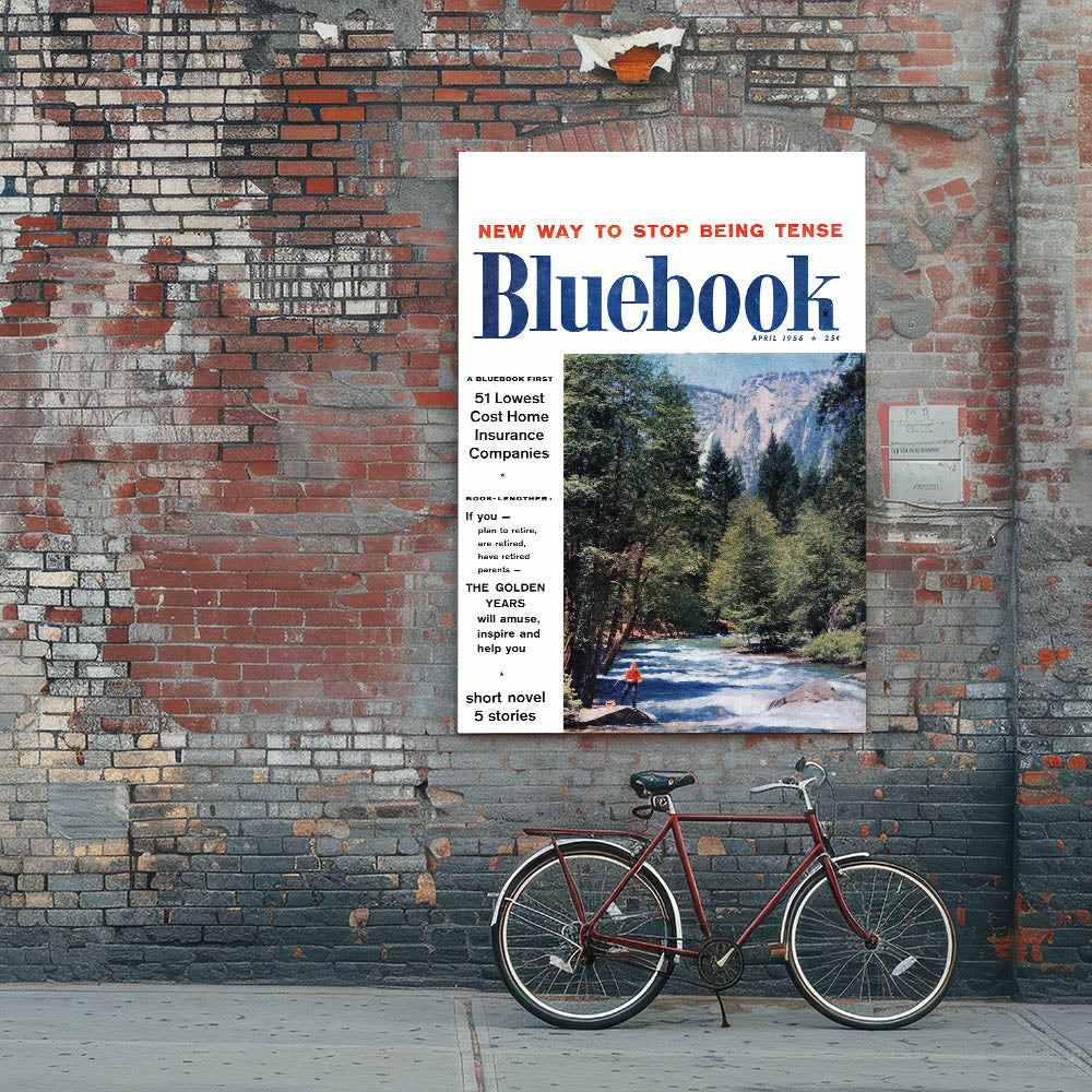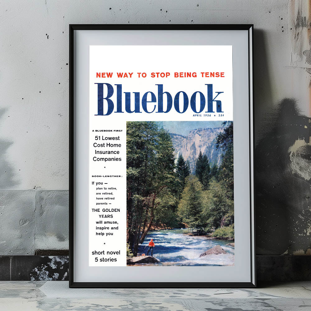 Relax and unwind with this vintage Bluebook Magazine cover from April 1956. Capturing a peaceful moment of nature, this cover features a figure standing by a rushing river, surrounded by lush trees and towering mountains. The calm yet powerful beauty of this scene is perfect for those who appreciate serene landscapes and vintage magazine cover art.