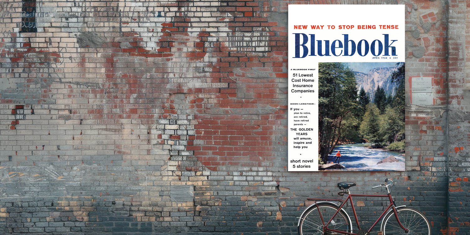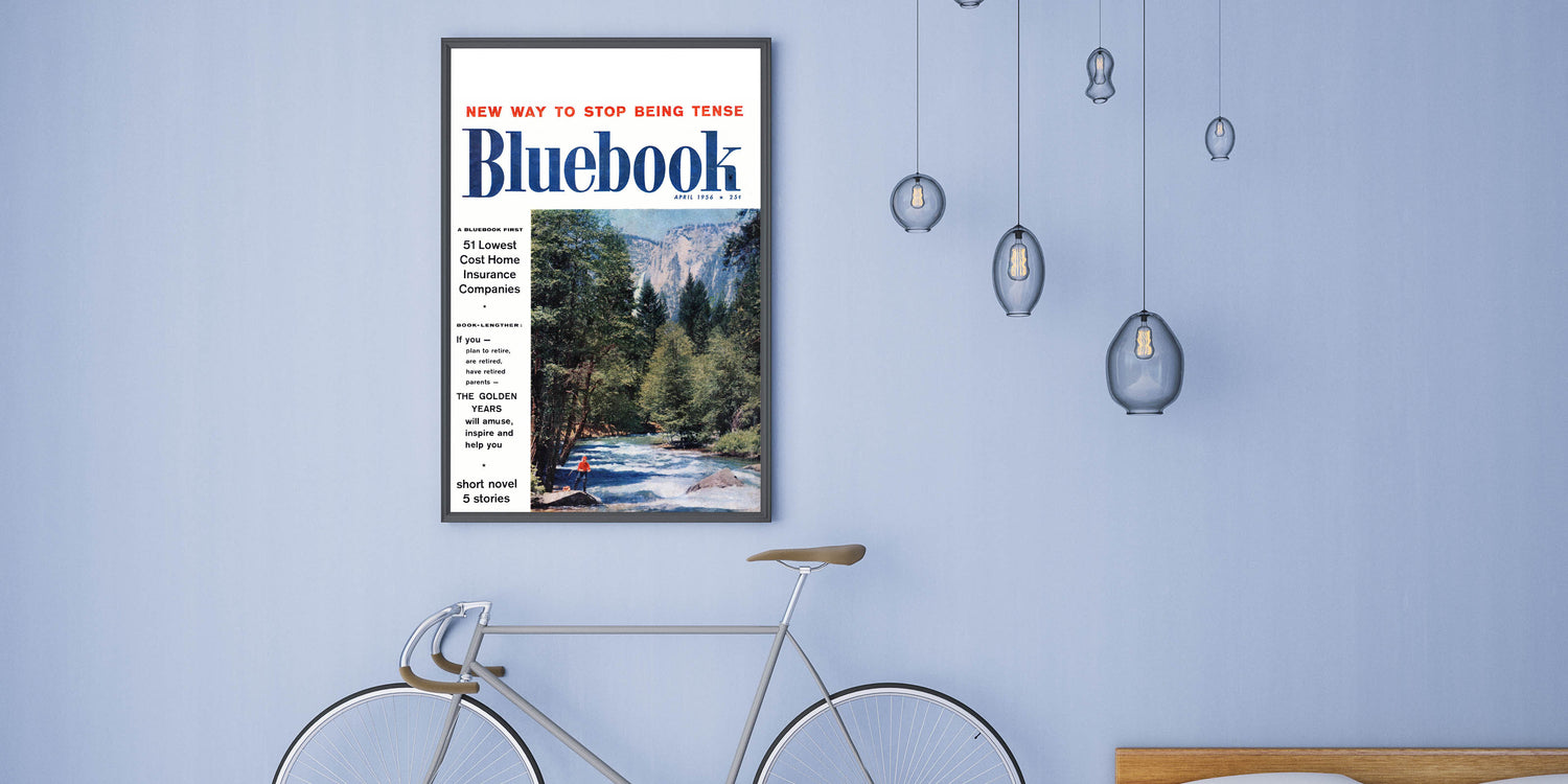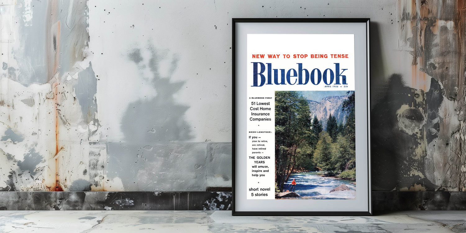 Relax and unwind with this vintage Bluebook Magazine cover from April 1956. Capturing a peaceful moment of nature, this cover features a figure standing by a rushing river, surrounded by lush trees and towering mountains. The calm yet powerful beauty of this scene is perfect for those who appreciate serene landscapes and vintage magazine cover art.