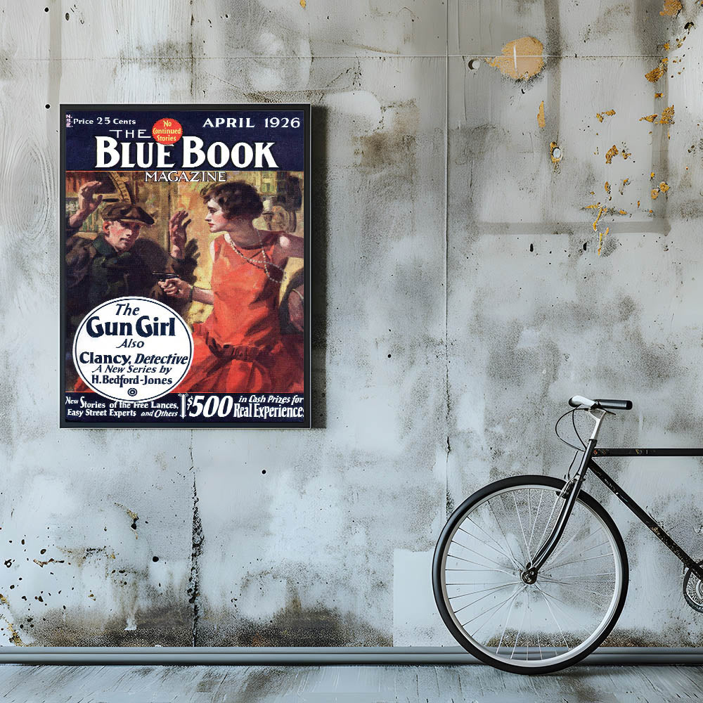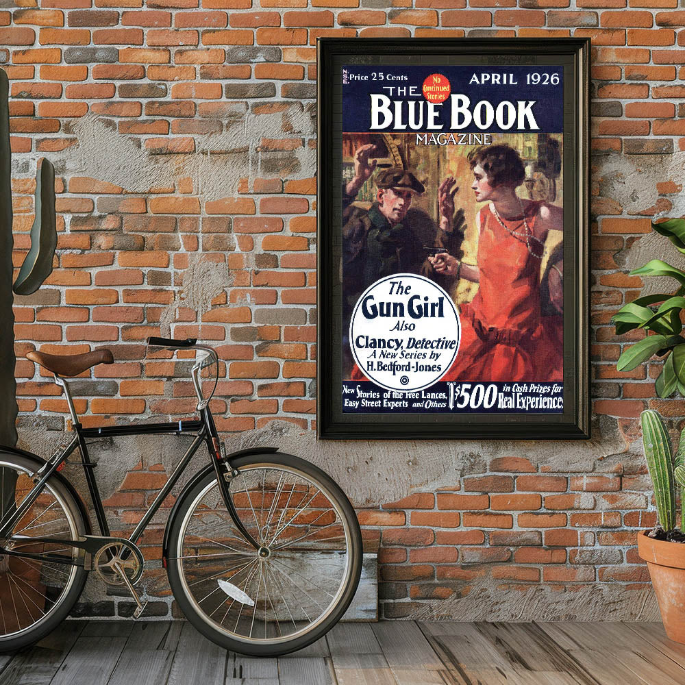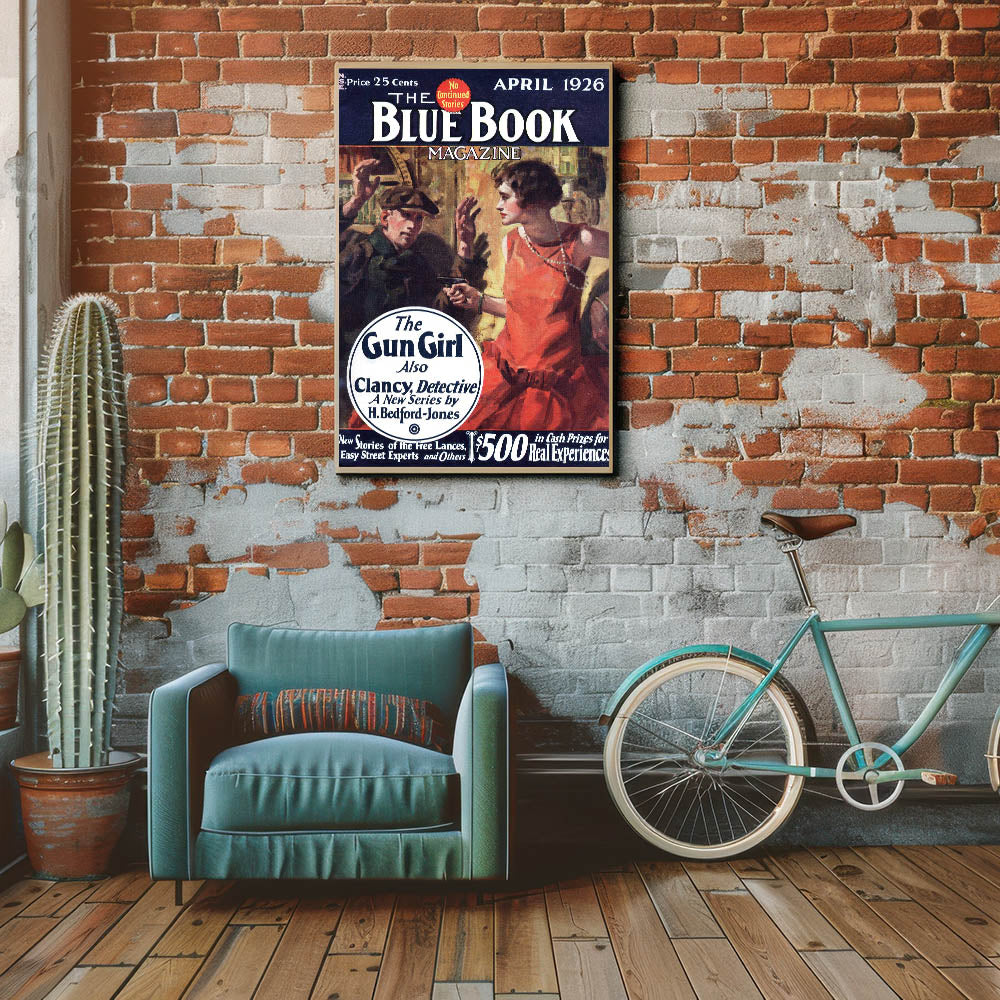 Step back in time with this iconic piece of vintage magazine cover art. Featuring The Gun Girl from the April 1926 edition of The Blue Book Magazine, this retro print captures the tension and allure of the Jazz Age. The vivid scene of a red-dressed woman confronting a man with a gun adds a dynamic and dramatic flair to any room.
