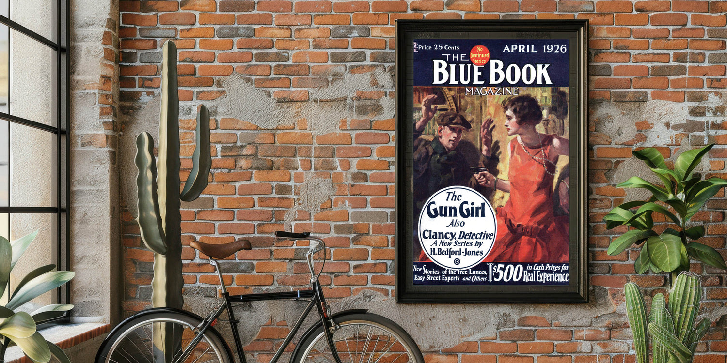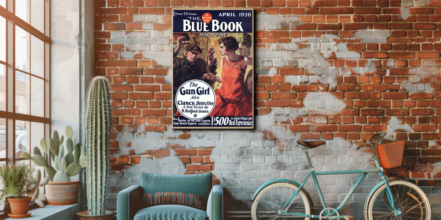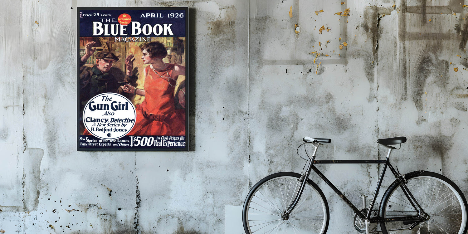 Step back in time with this iconic piece of vintage magazine cover art. Featuring The Gun Girl from the April 1926 edition of The Blue Book Magazine, this retro print captures the tension and allure of the Jazz Age. The vivid scene of a red-dressed woman confronting a man with a gun adds a dynamic and dramatic flair to any room.