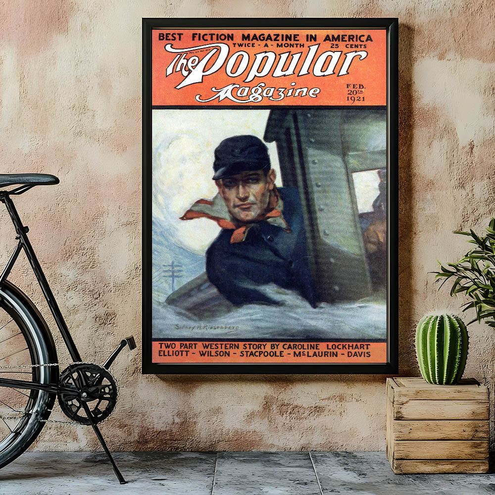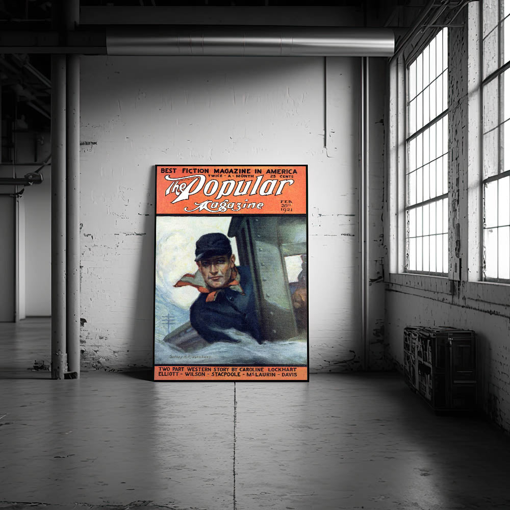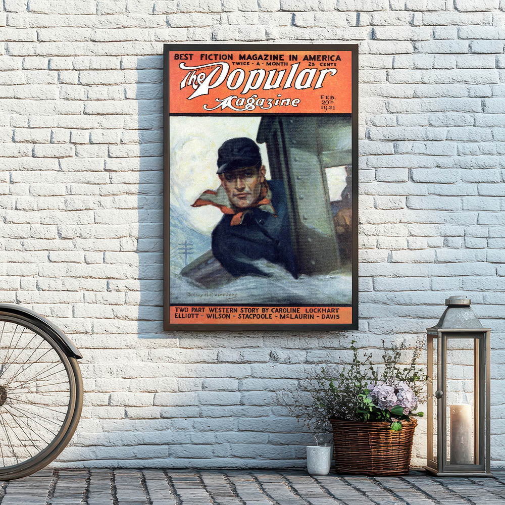 - Iconic vintage design: A reproduction of the The Popular Magazine cover from February 1921, featuring a dramatic, action-packed illustration.