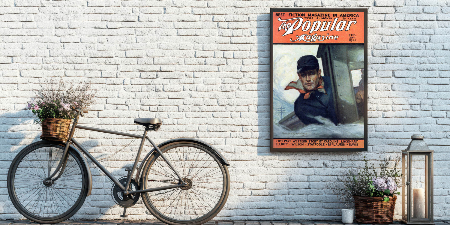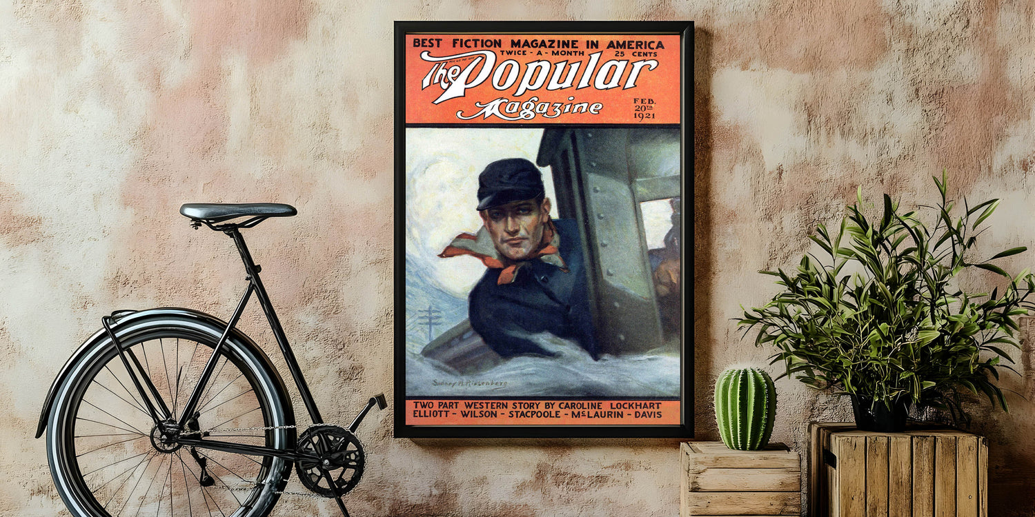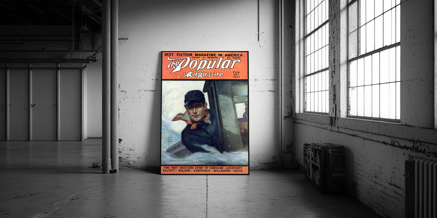 - Iconic vintage design: A reproduction of the The Popular Magazine cover from February 1921, featuring a dramatic, action-packed illustration.