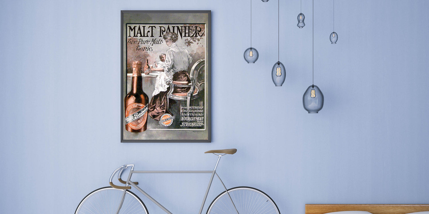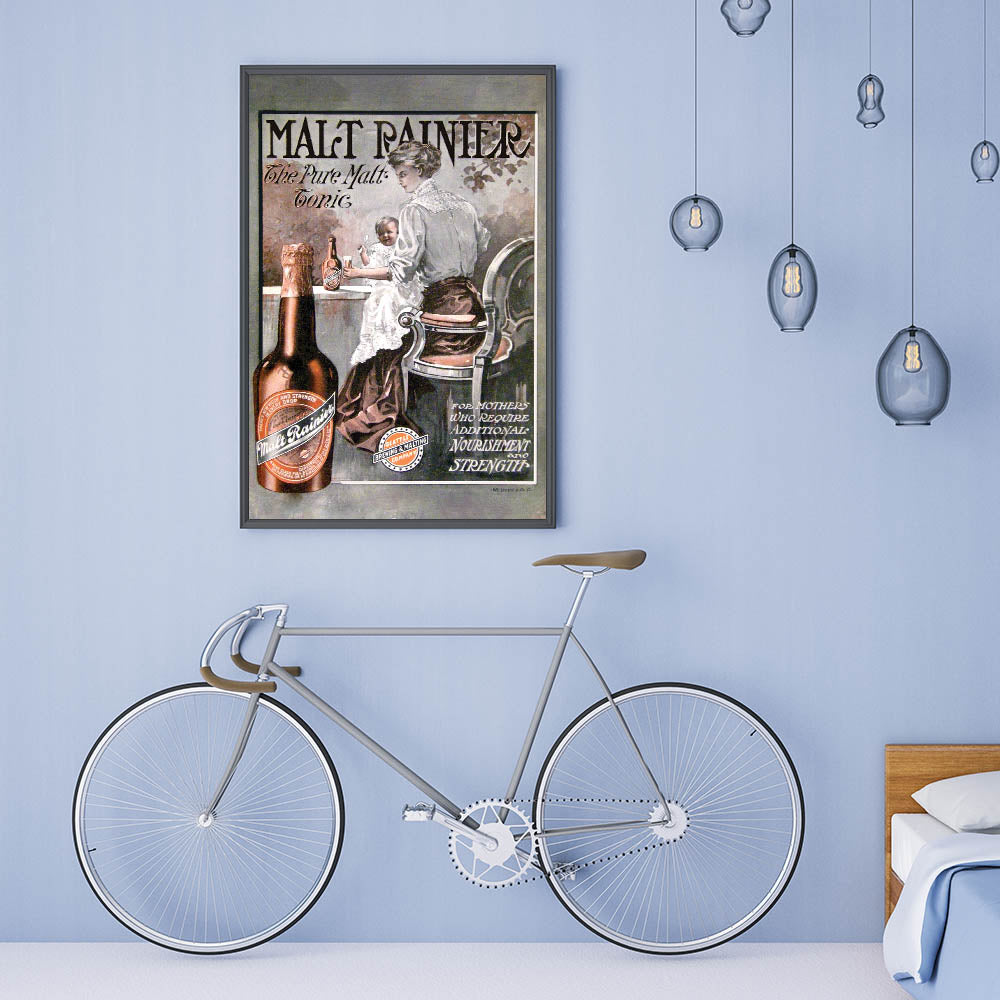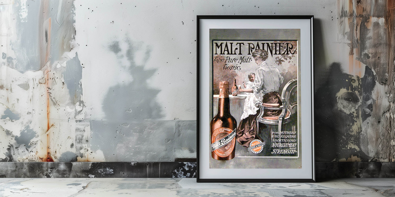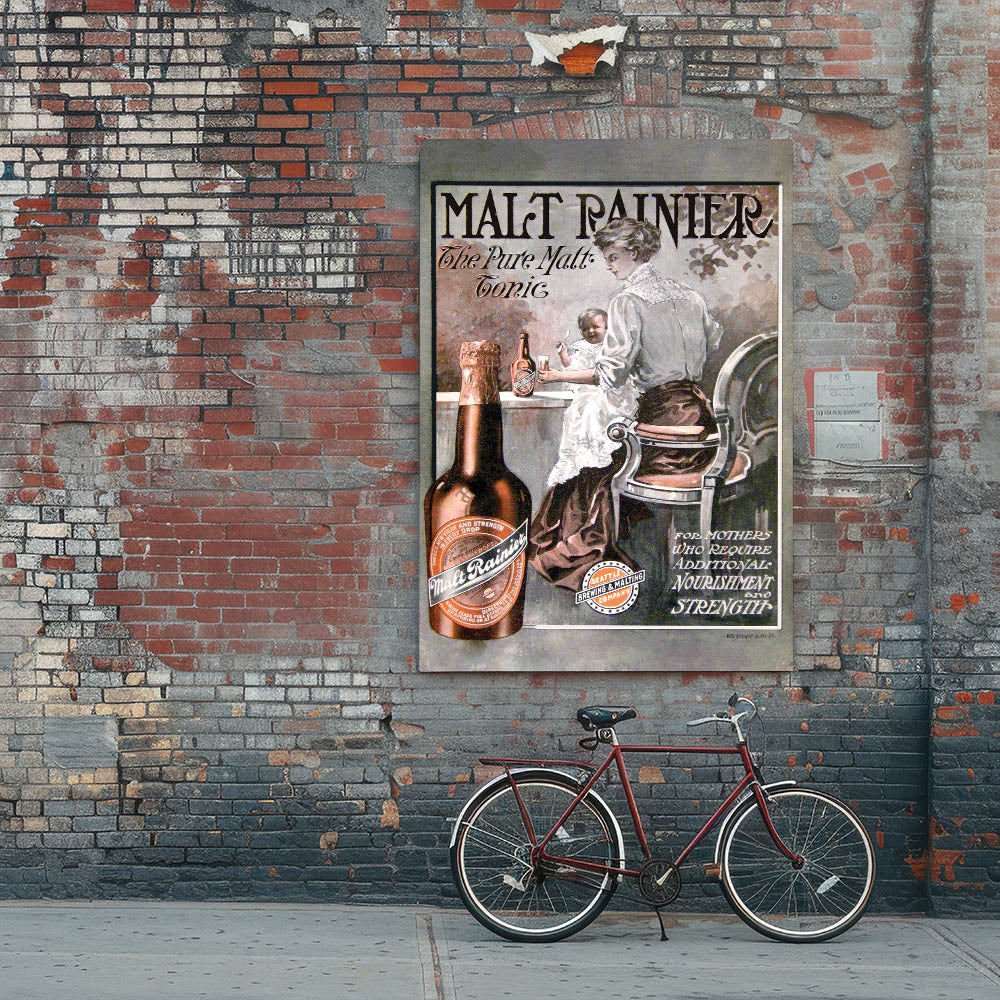- A charming vintage-inspired wall art featuring a mother and child, with a focus on Malt Rainier tonic.