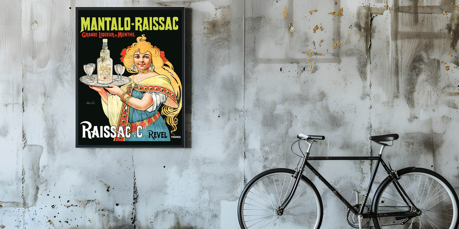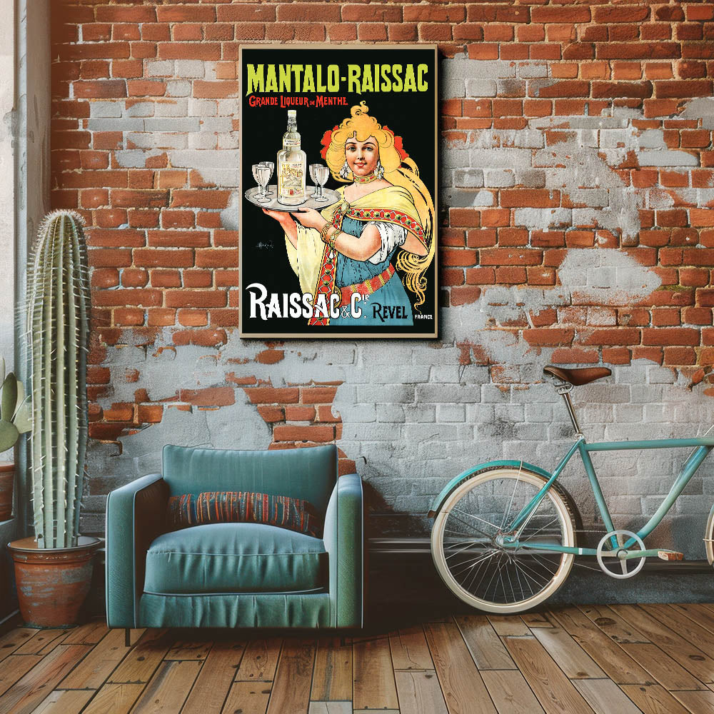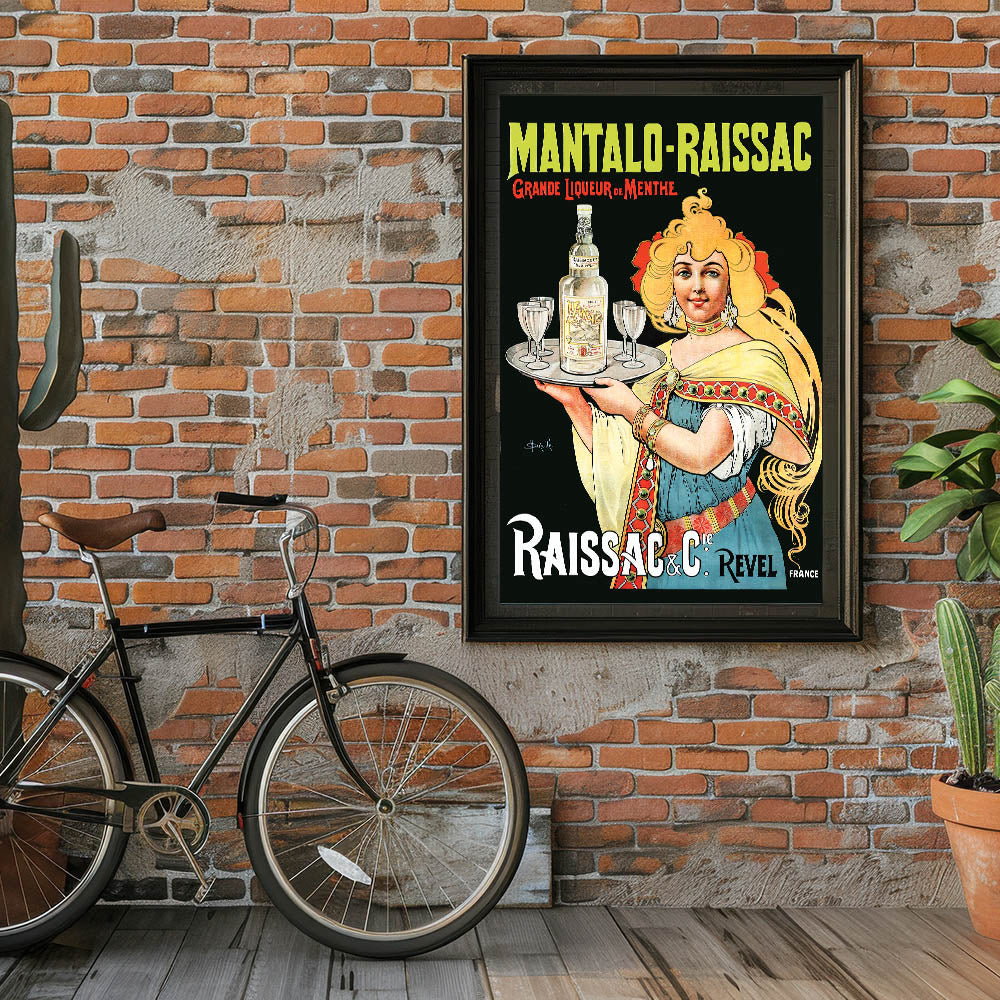 This Vintage Mantalo-Raissac Poster features a vibrant and charming design showcasing the classic mint liqueur. The artwork presents a woman in traditional attire, holding a tray with the iconic bottle and glasses of Mantalo-Raissac, set against a striking backdrop. The vintage-inspired wall art brings a sense of sophistication and elegance, making it a perfect addition to any collection of nostalgic advertising prints.