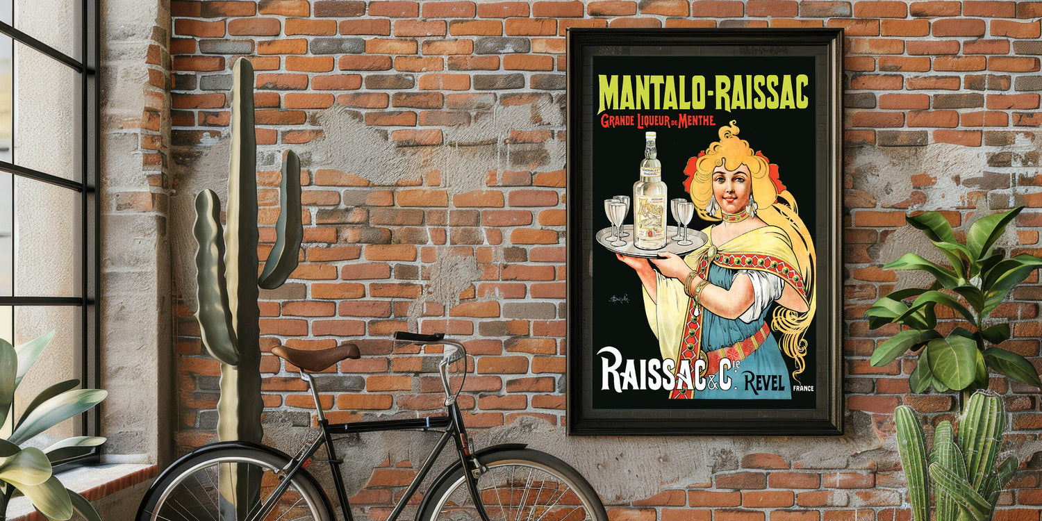 - High-quality reproduction of a vintage Mantalo-Raissac liqueur ad