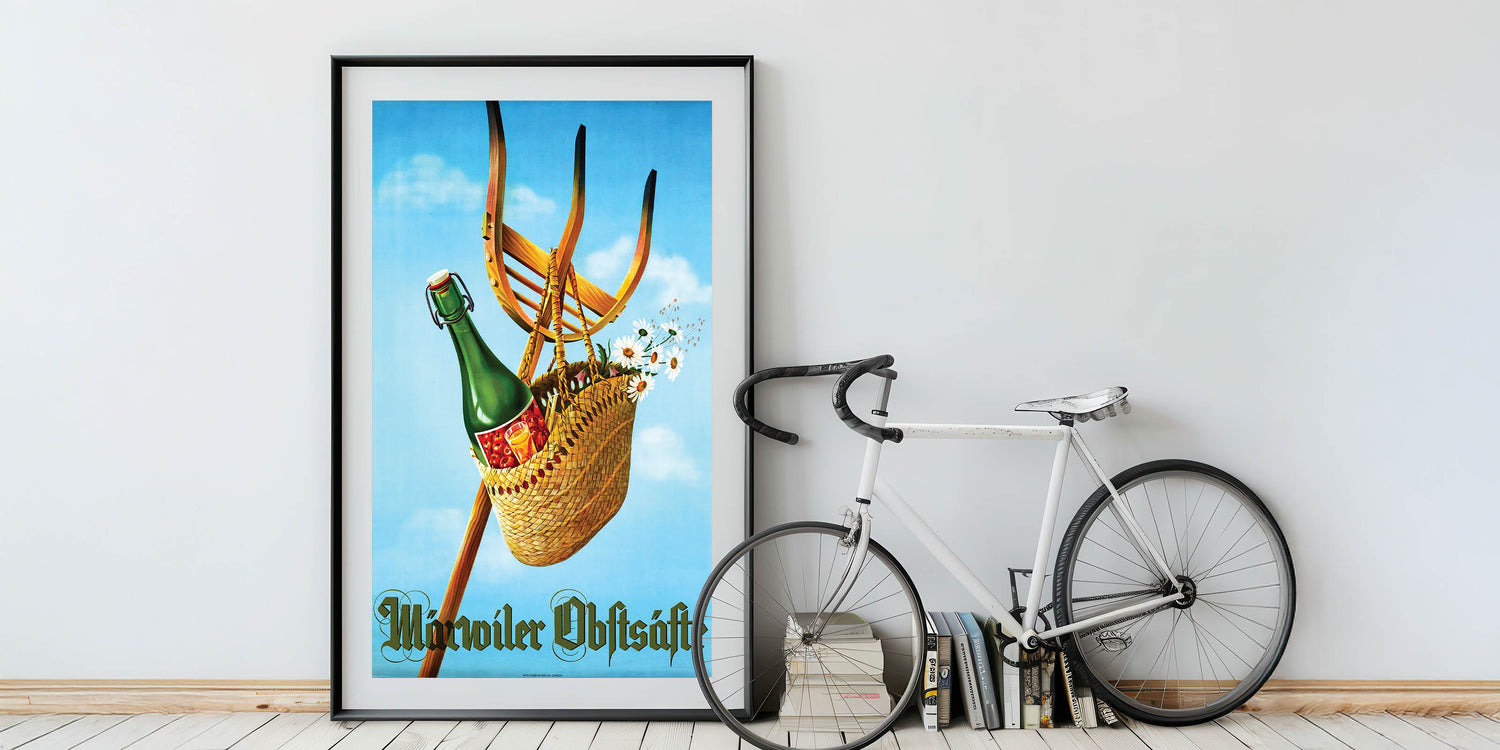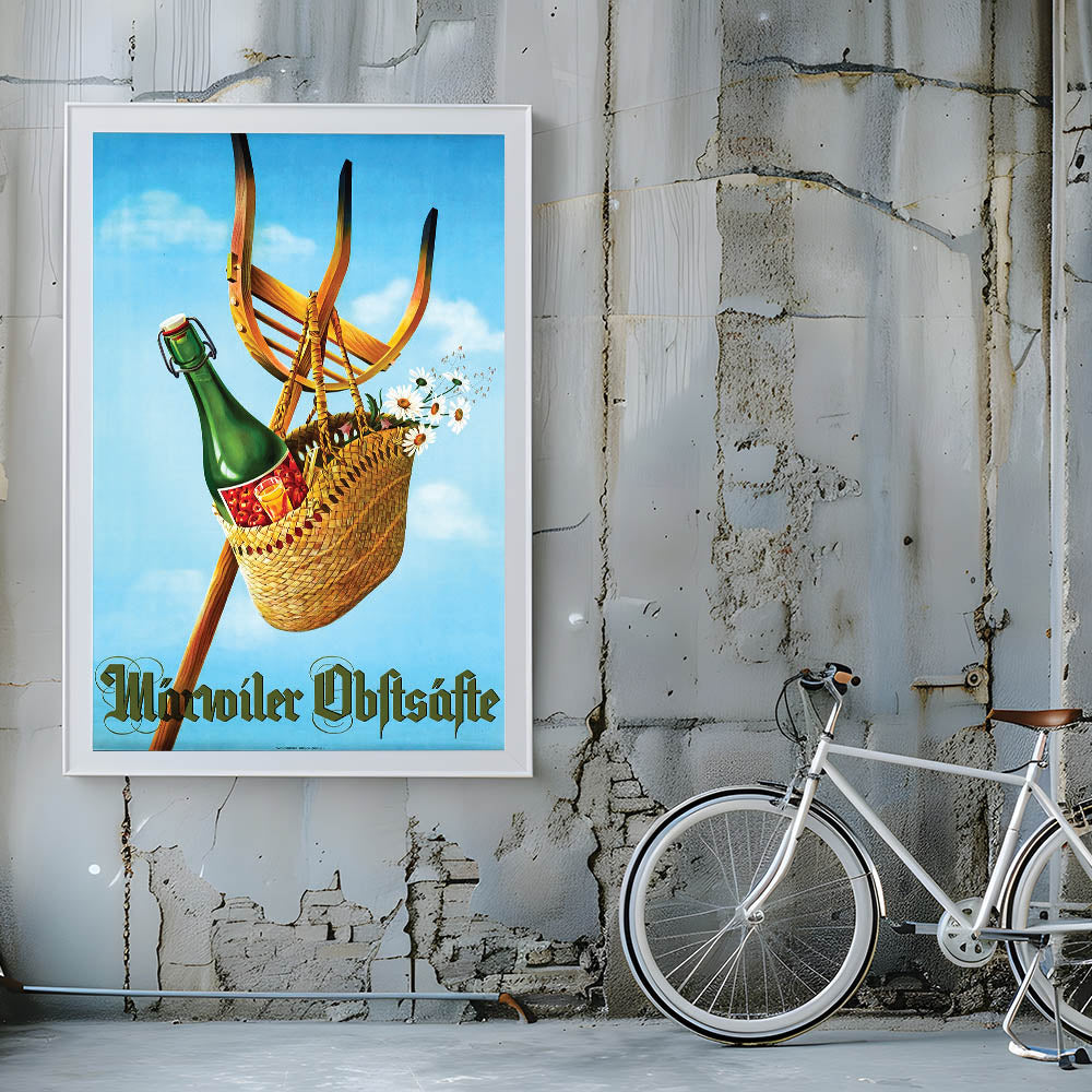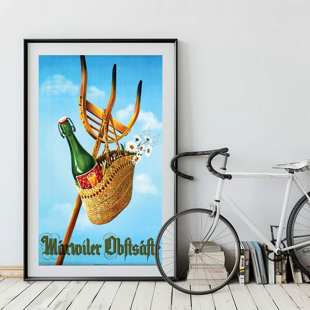 This Vintage Märvoiler Obstsäfte Poster features a charming design with a bottle of fruit juice nestled in a woven basket, surrounded by a serene, blue sky backdrop. The colorful design and nostalgic vibe make it a perfect addition for anyone who loves vintage-inspired wall art. The soft and playful scene is ideal for those looking to add retro home decor with a touch of elegance and history.