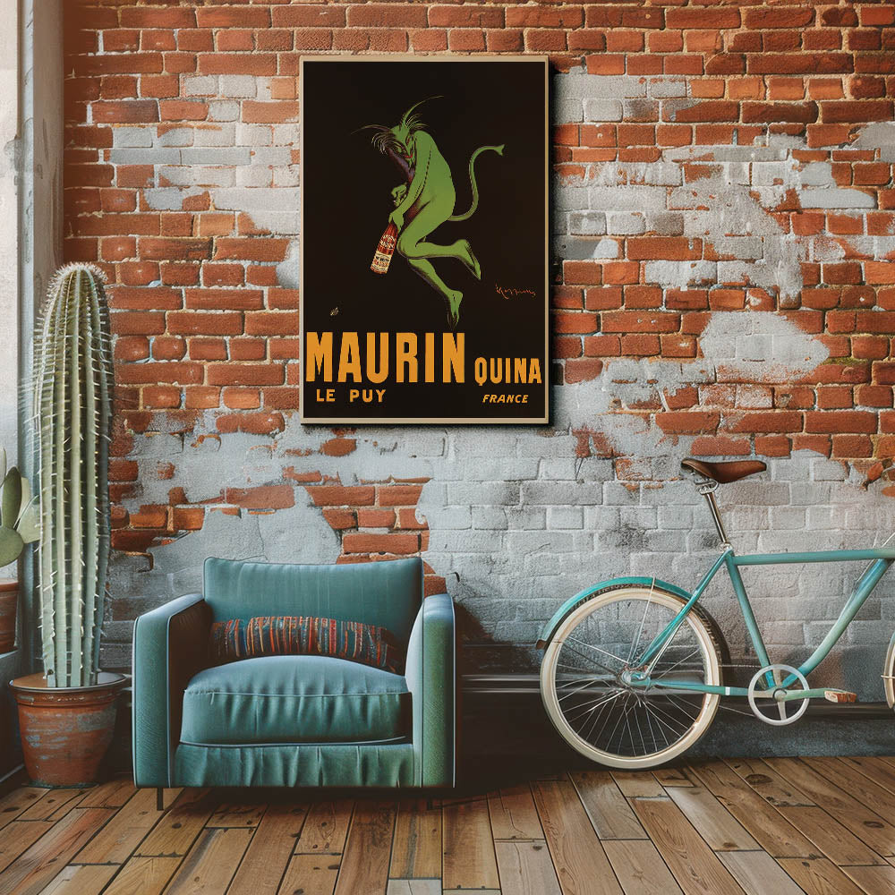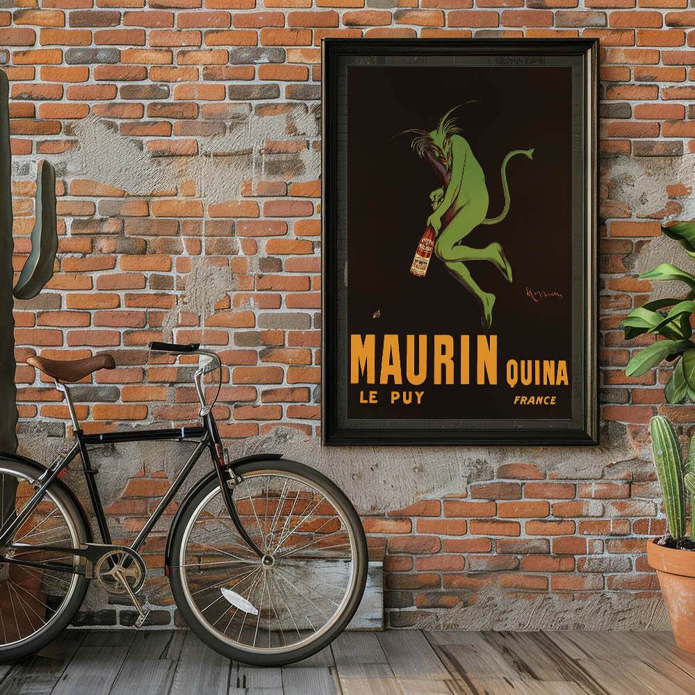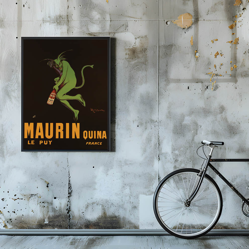 This Vintage Maurin Quina Poster features a playful and bold design with a green, devilish figure holding a bottle of Maurin Quina liqueur. The vibrant, eye-catching colors and vintage charm make it an excellent addition to any collection of vintage-inspired wall art. Perfect for those who appreciate historical advertising artwork, this poster will add character to any retro home decor.