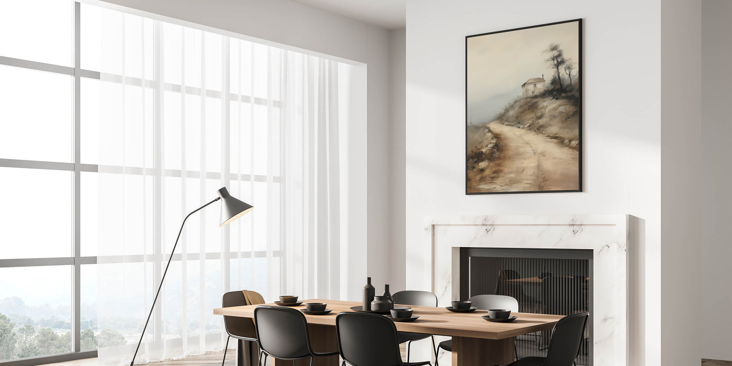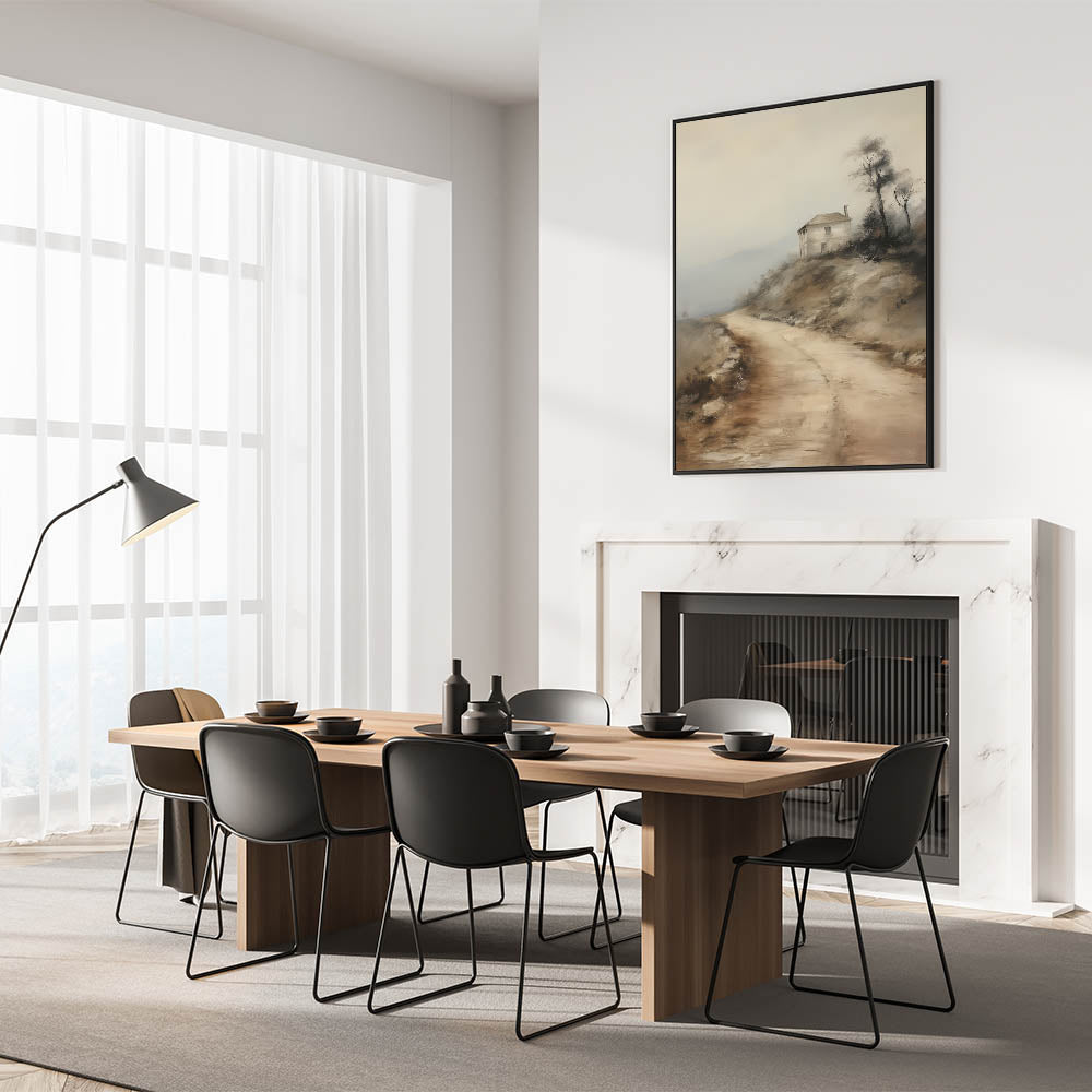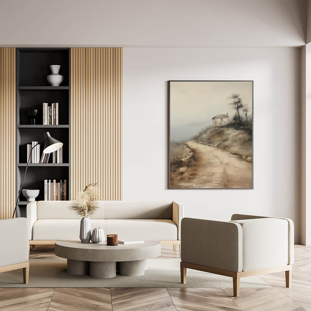 Step into the timeless beauty of vintage landscapes with this mountain path wall art, featuring a solitary countryside house perched on a rugged hillside. The soft, earthy tones and textured brushstrokes create a sense of depth, evoking nostalgic scenery and natural vistas. This classic landscape print blends rustic charm with a touch of mystery, making it an exquisite statement piece for any vintage-inspired décor.
