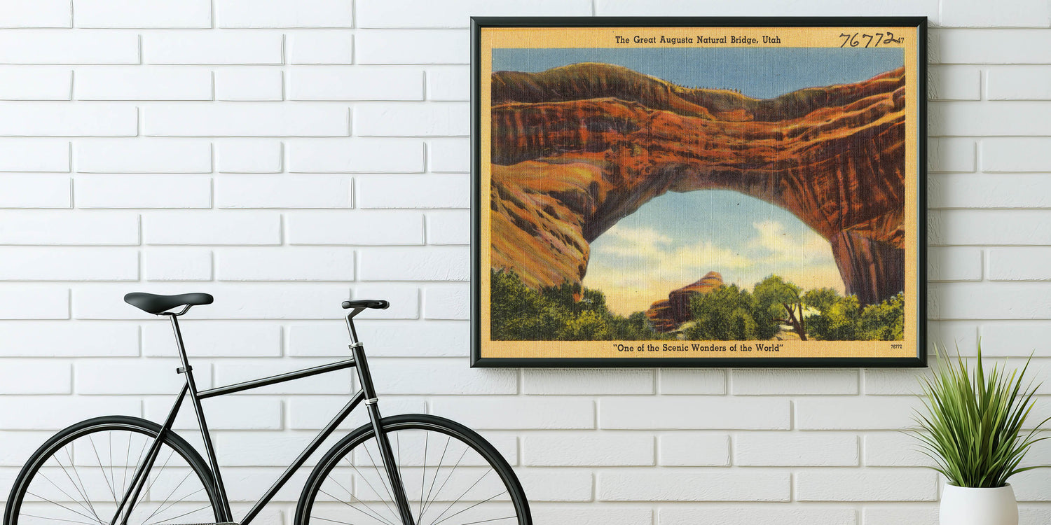 Embrace the breathtaking landscapes of Utah with this vintage travel poster featuring the Great Augusta Natural Bridge. Capturing the rugged beauty of the red rock formations against soft blue skies and lush greenery, this print is a tribute to classic travel decor and America’s natural wonders. Ideal for those who appreciate nostalgic travel prints and vintage tourism illustrations, this artwork brings a sense of adventure and nature's majesty to any space.