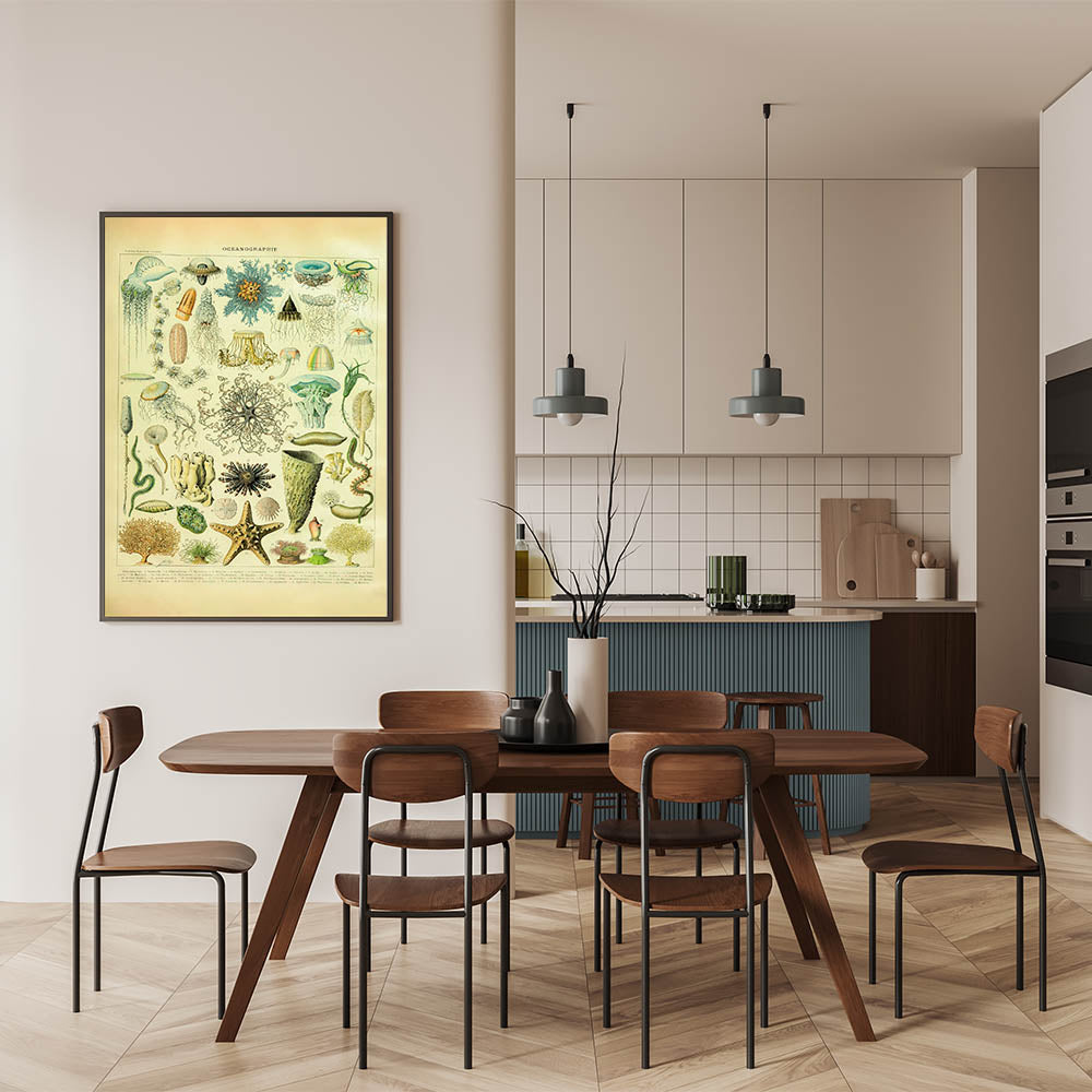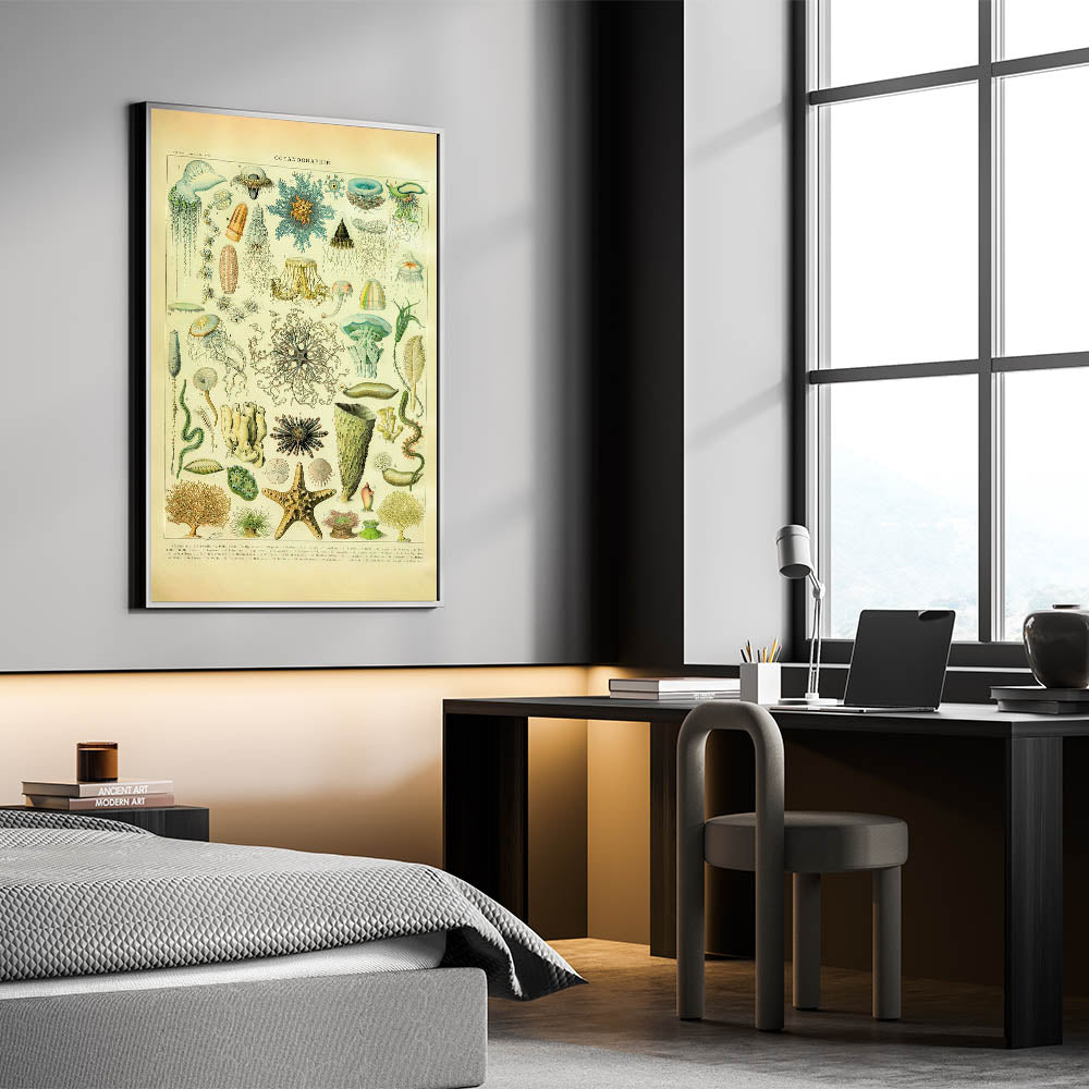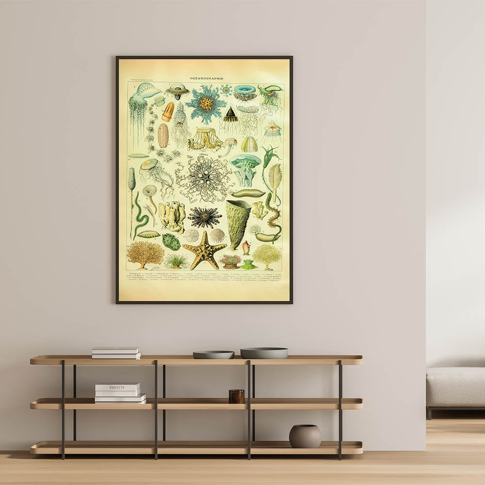 Immerse yourself in the world of marine life with our Vintage Oceanography Illustration from the Nature Elements wall art collection. This piece showcases a stunning variety of oceanic organisms, from jellyfish and starfish to intricate corals and sea plants. A perfect blend of scientific illustration and vintage art, this piece captures the delicate beauty of marine life.