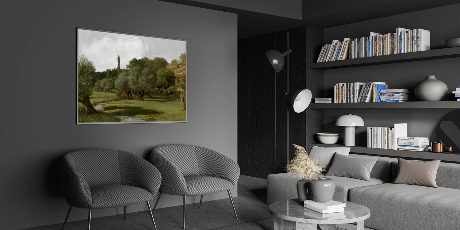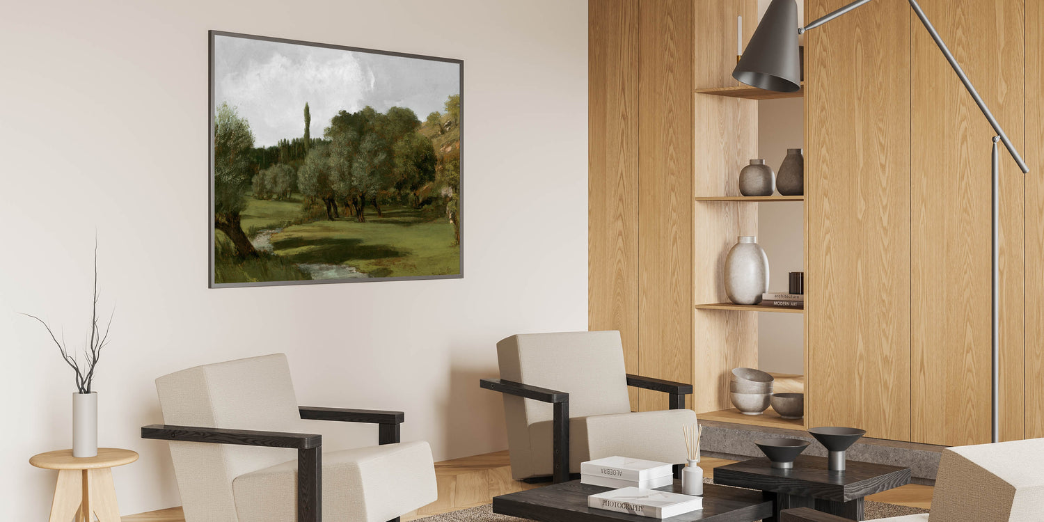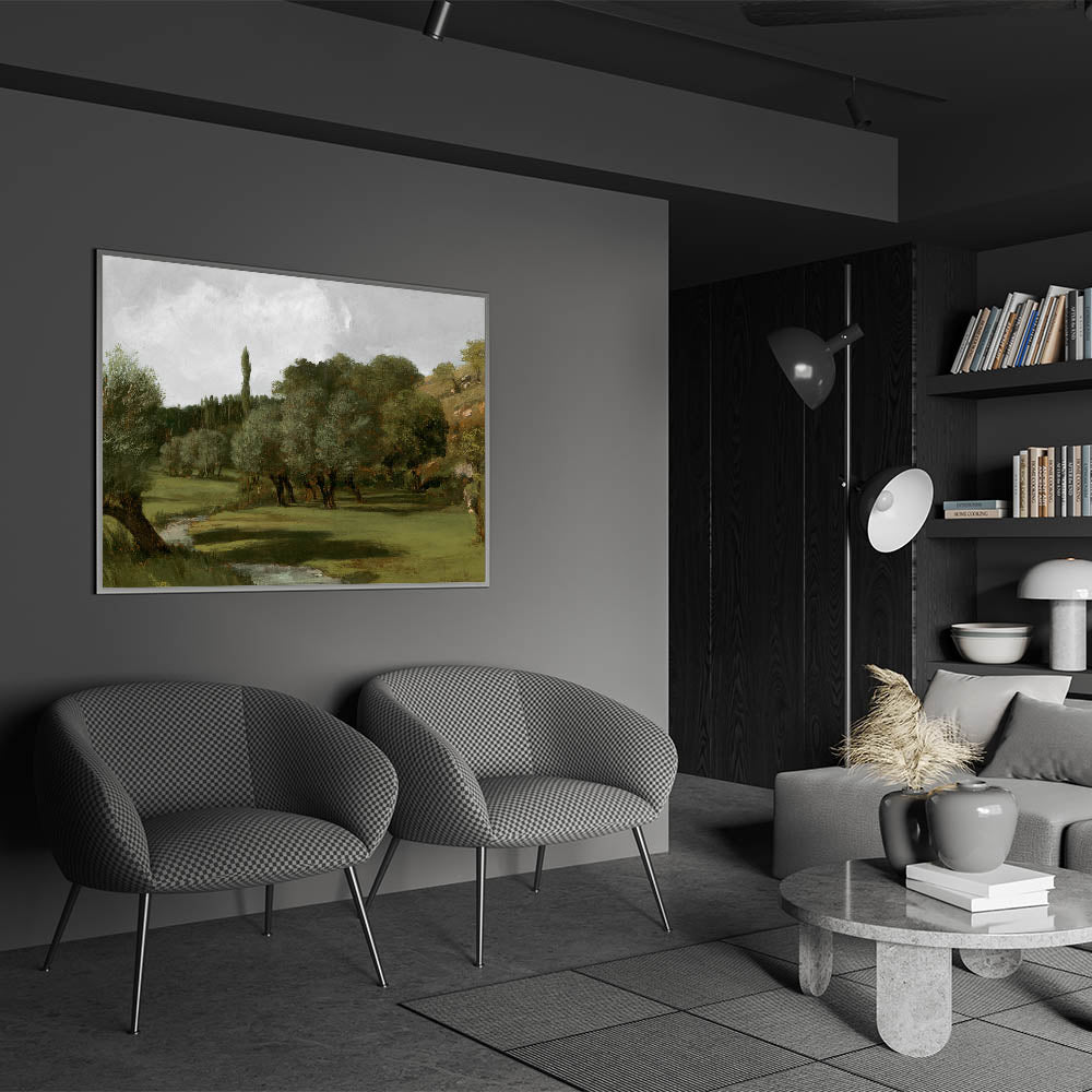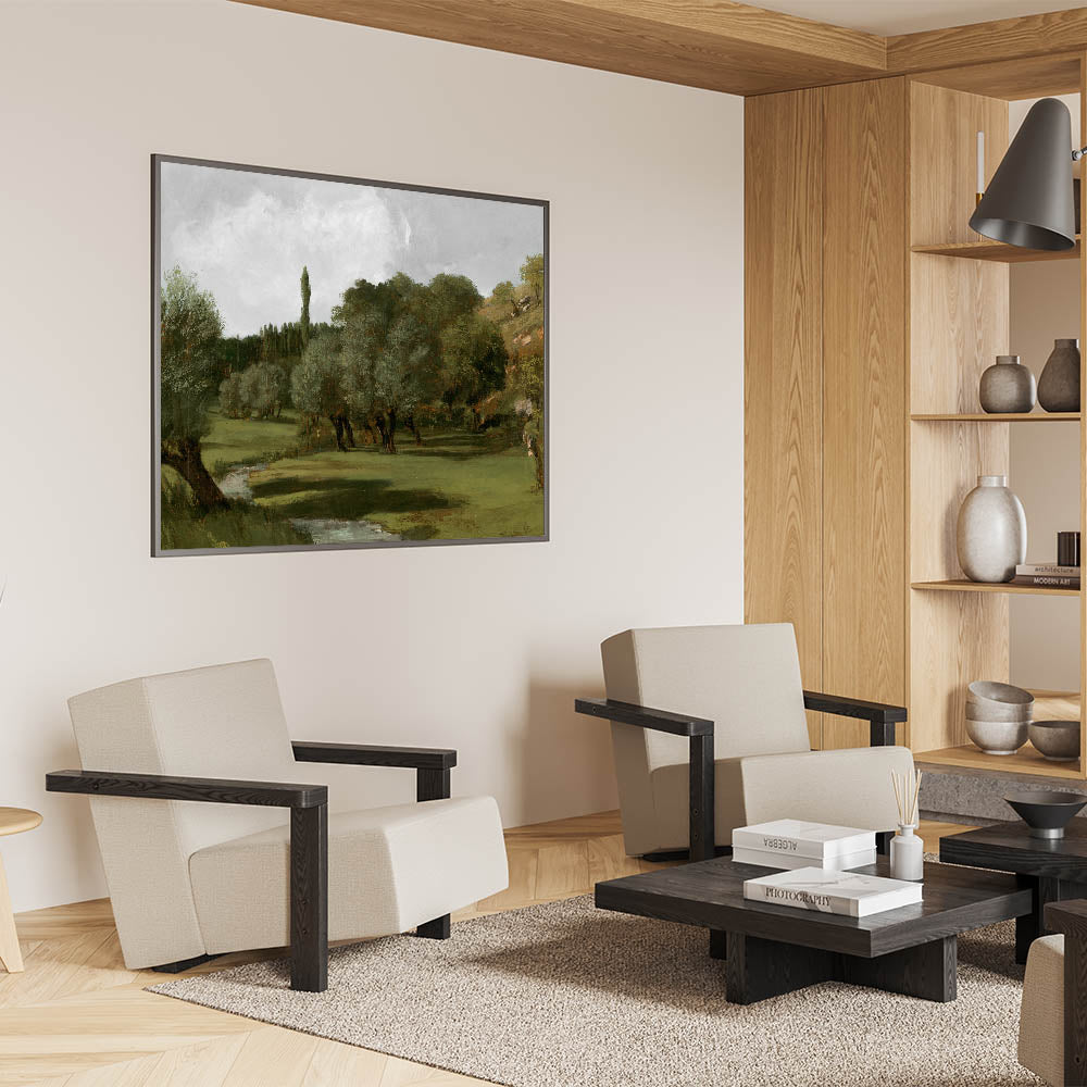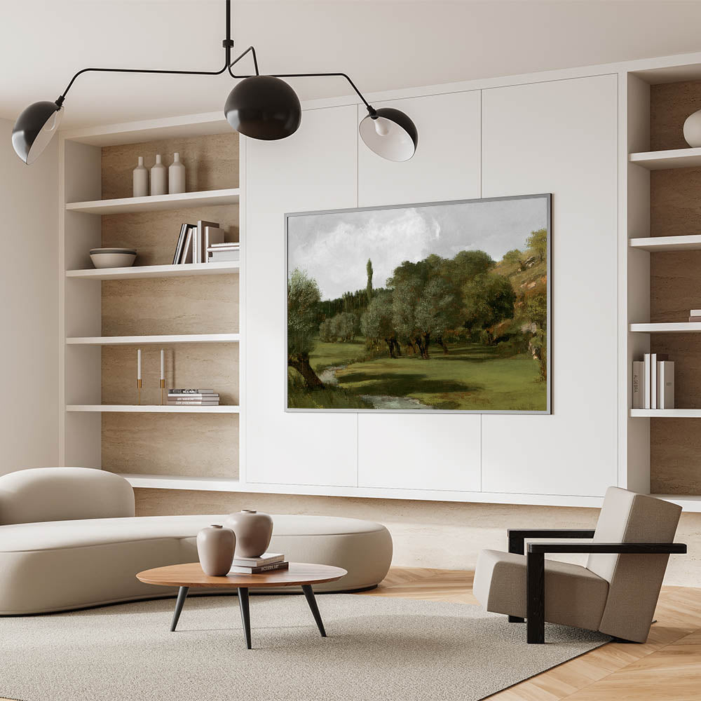 Embrace the serene beauty of nature with this vintage olive tree artwork, showcasing a tranquil countryside scene. The olive trees, set against rolling green hills and a peaceful stream, create a calming atmosphere. This piece captures the timeless charm of rural life, offering a classic and rustic touch to your home decor.