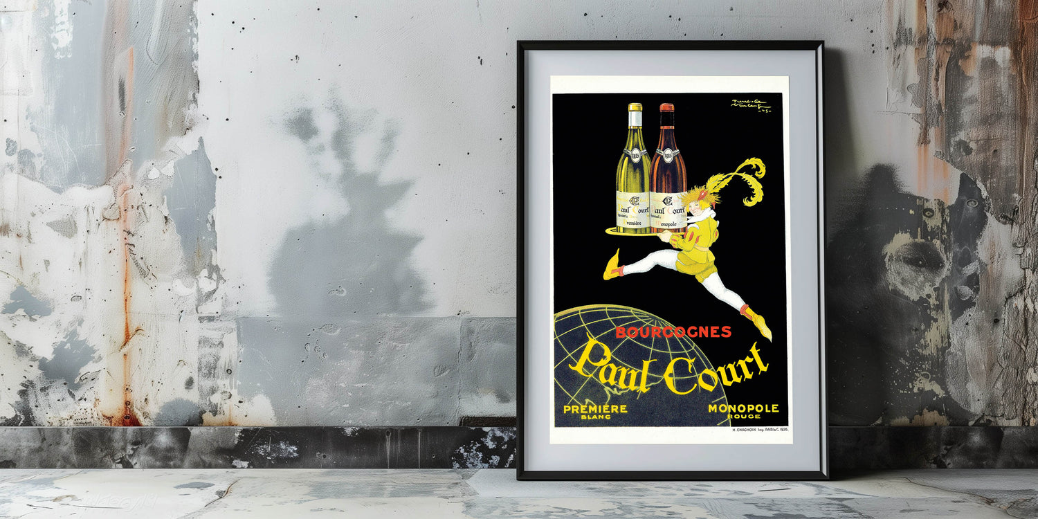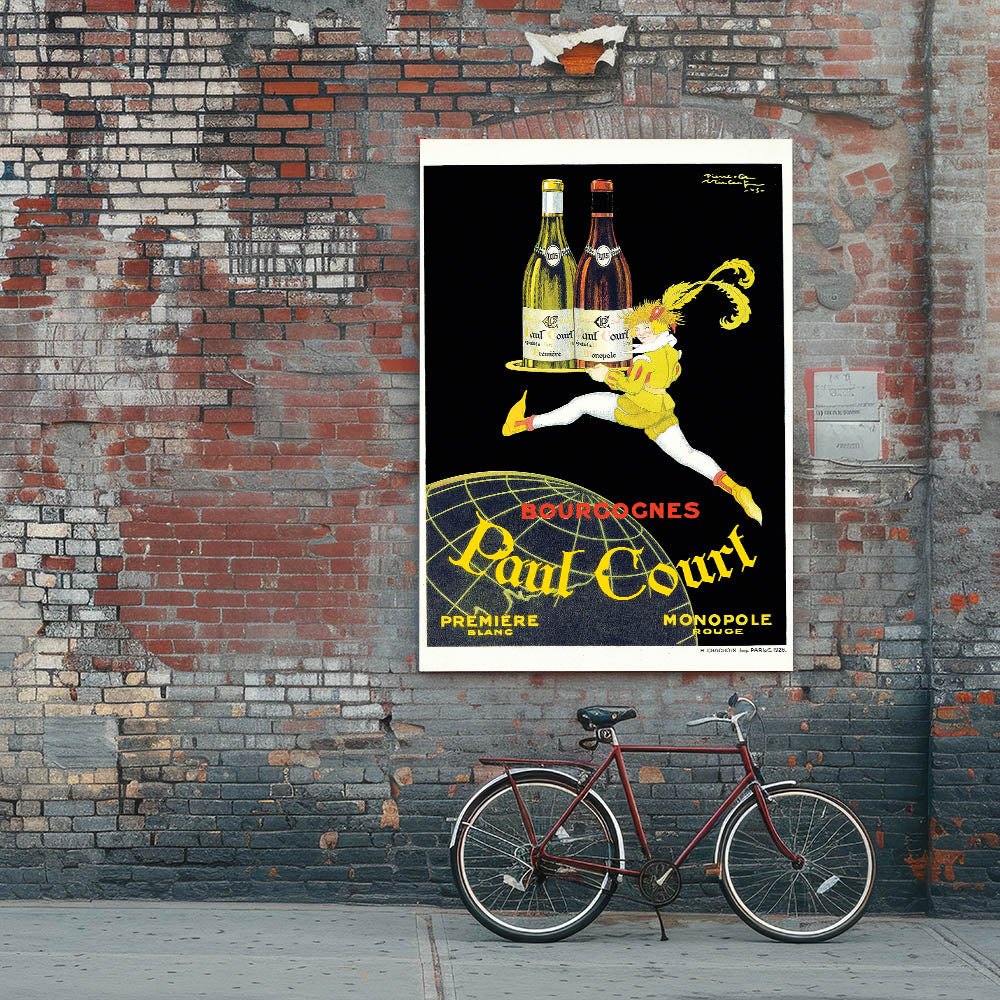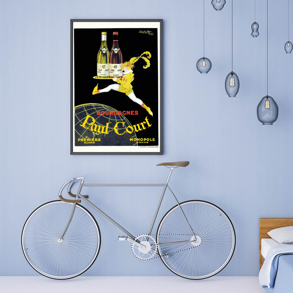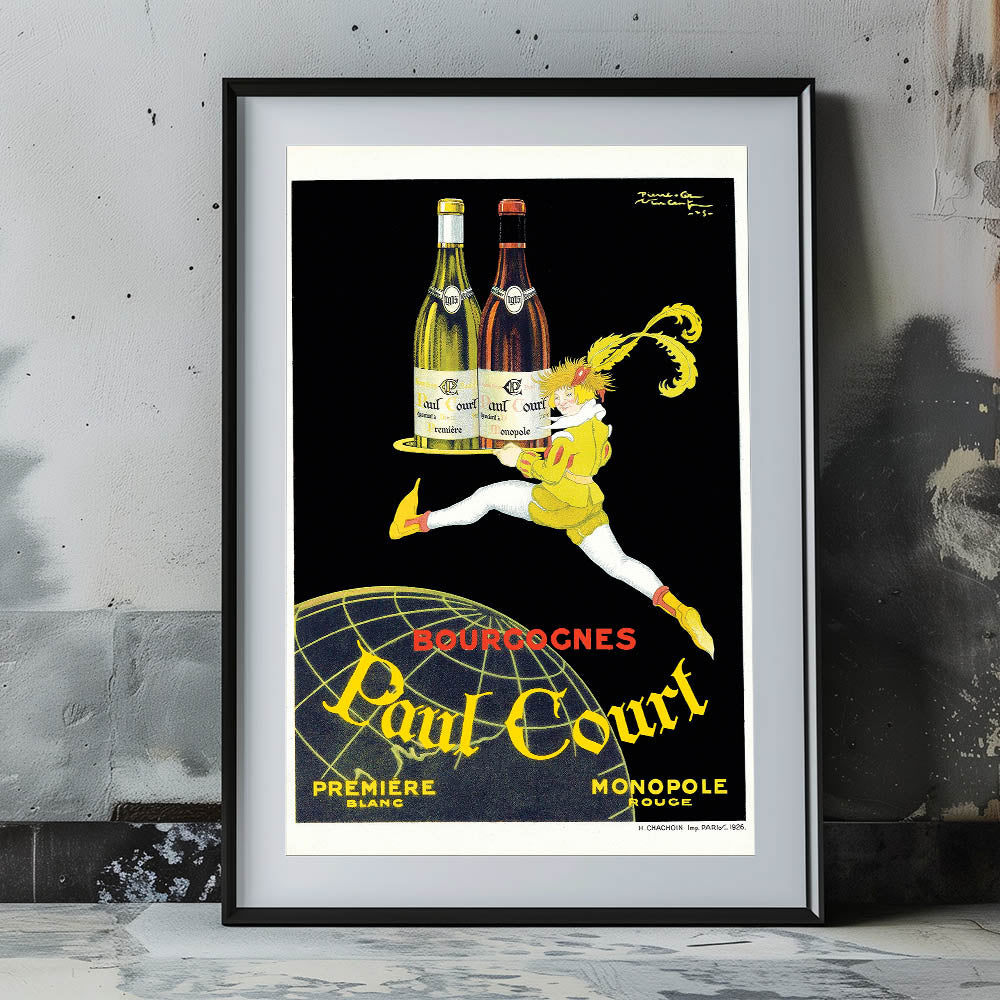This Vintage Paul Court Wine Advertising Poster showcases a bold and sophisticated design that is perfect for wine enthusiasts and collectors of vintage-inspired wall art. The illustration of a character holding a tray with two bottles of wine from the Paul Court collection exudes elegance and charm, making it a fantastic addition to any home or office space. This poster highlights the timeless appeal of classic advertising posters, featuring wine and the luxurious essence of the Bourgogne region.