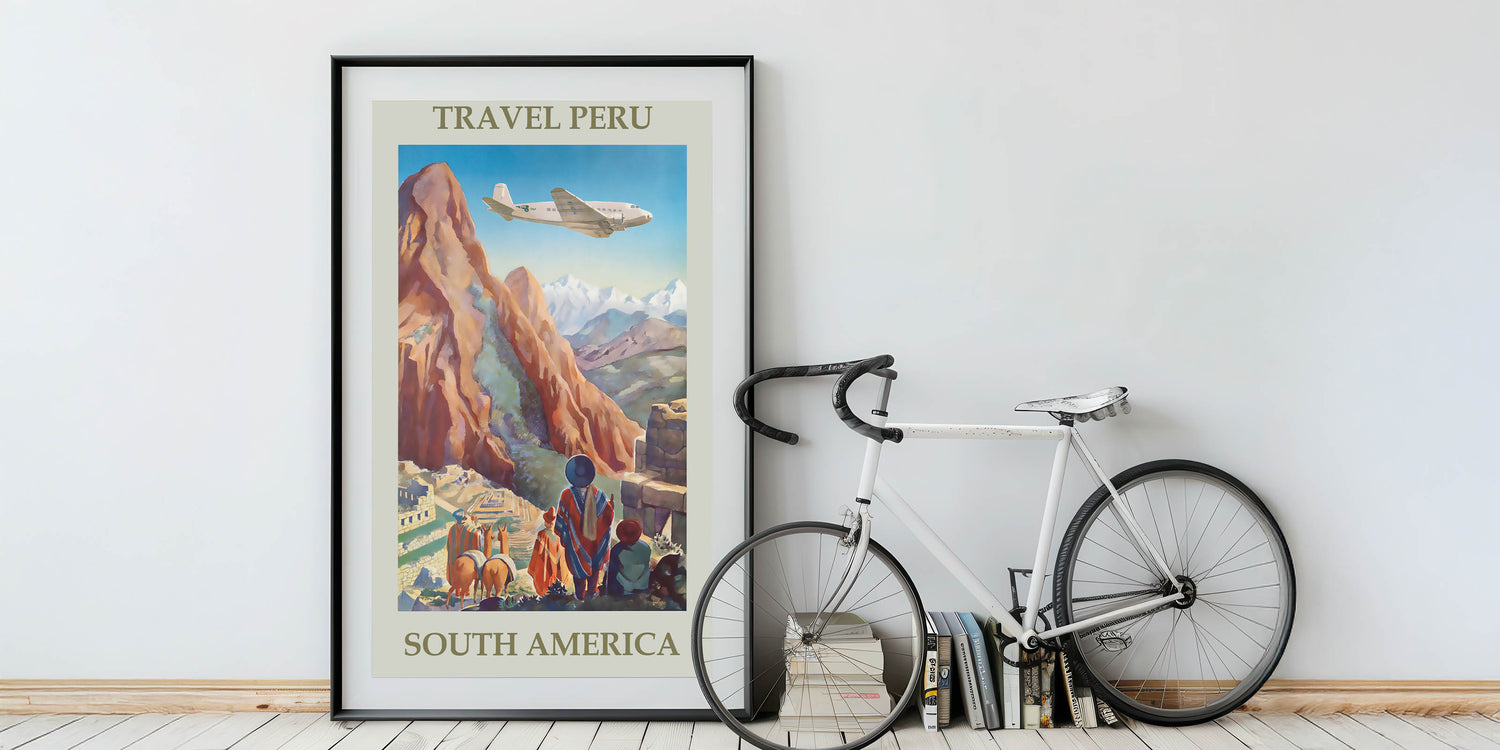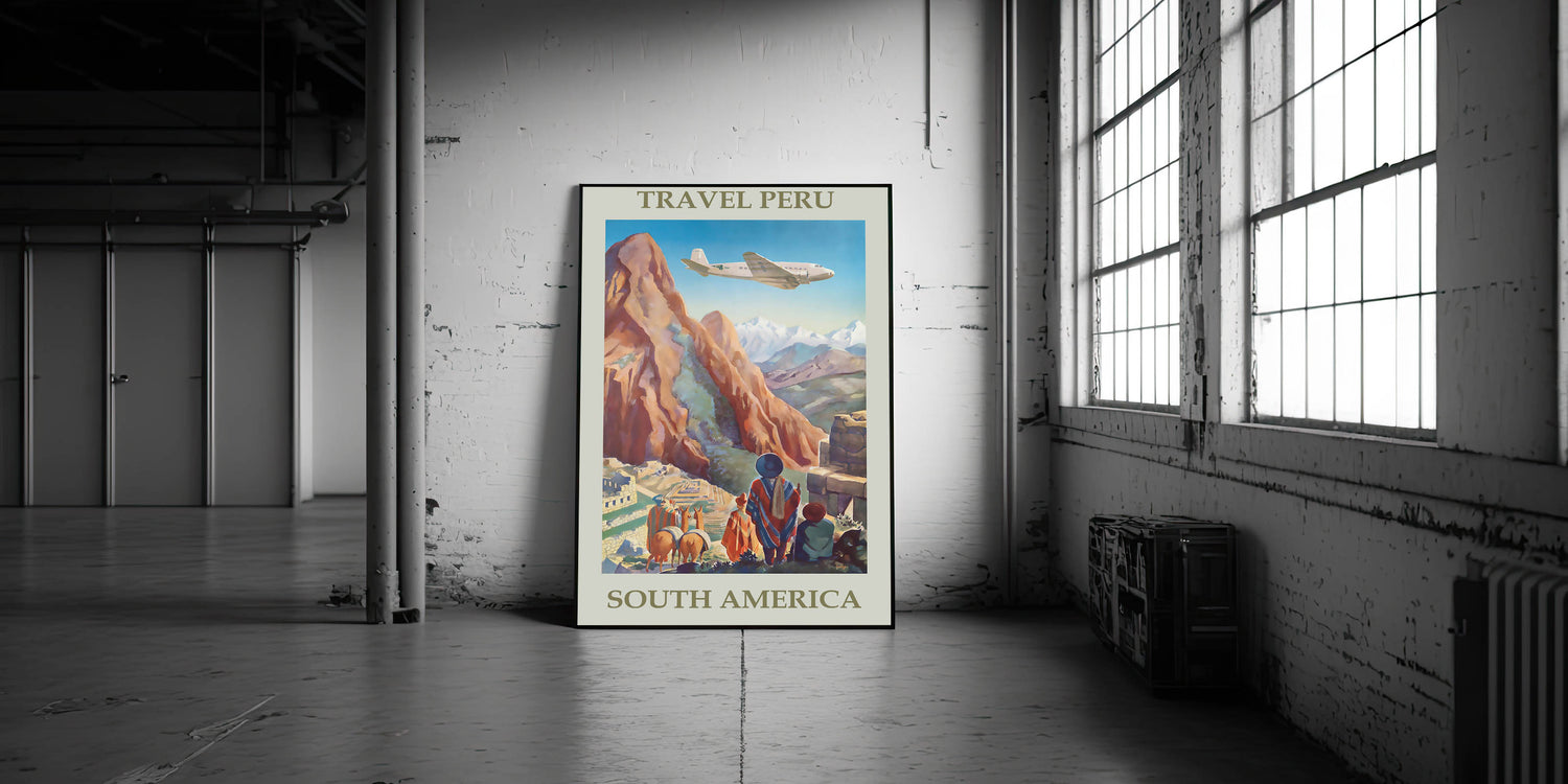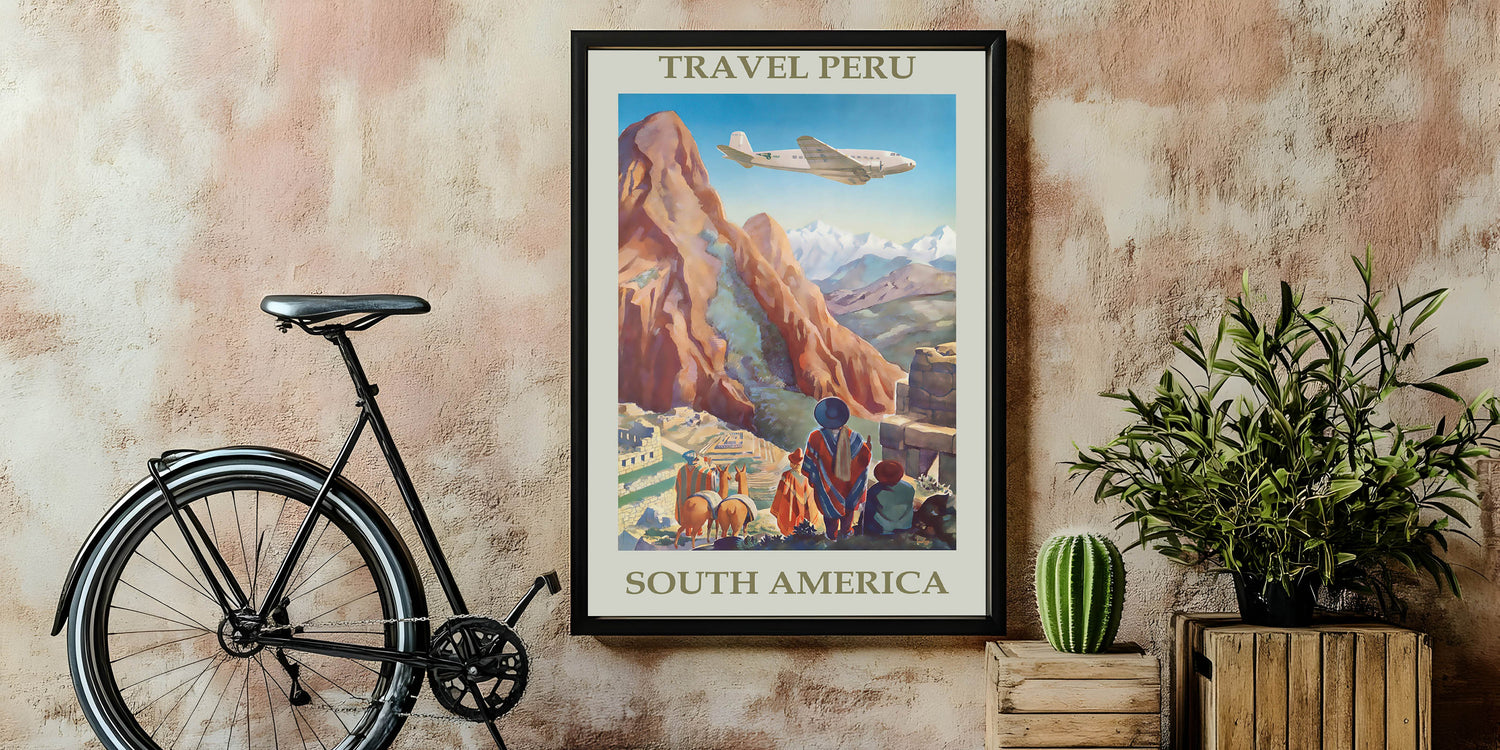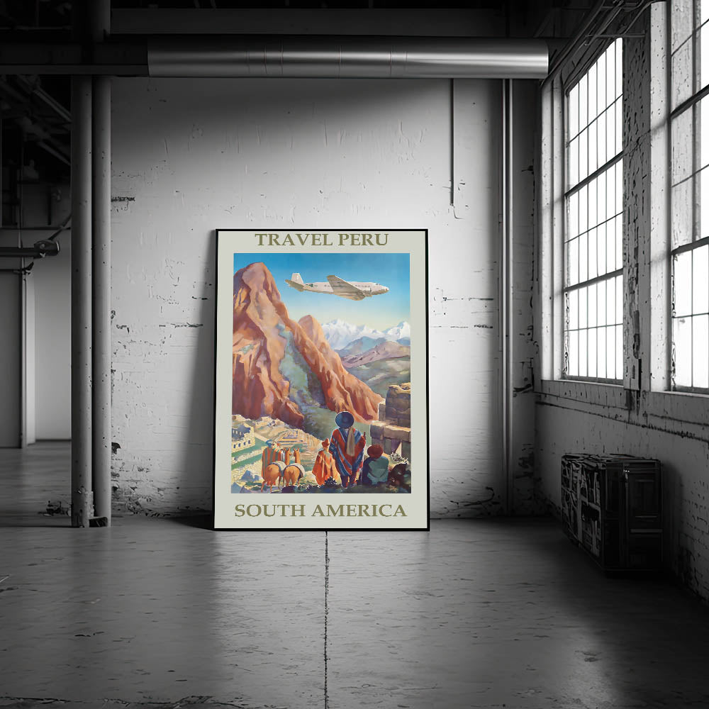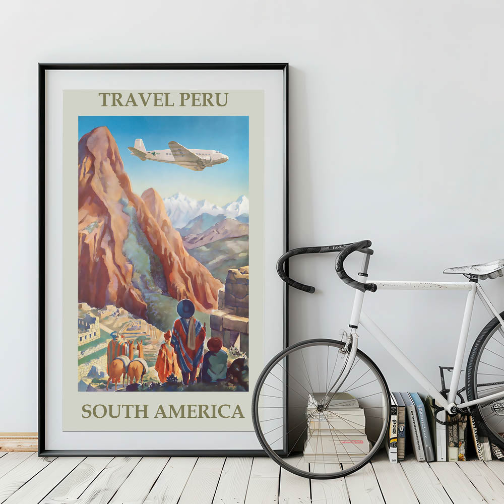 This stunning Retro Peru Travel Poster takes you on a journey through South America's majestic landscapes. Featuring an airplane soaring over the Andes Mountains, with a group of travelers and llamas gazing at the ancient ruins below, this piece brings the adventure of Peru to life. Perfect for anyone who loves vintage decor or has a passion for travel, this nostalgic art print transports you to the heart of Peru.