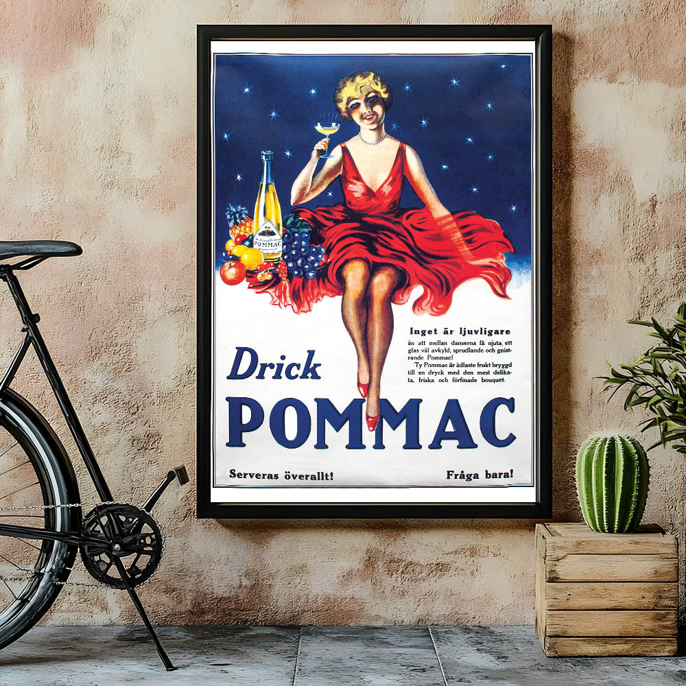 This Vintage Pommac Poster is a fun and vibrant piece of vintage-inspired wall art. Featuring a woman in a red dress holding a glass of Pommac while surrounded by fresh fruit, the playful design captures the lively spirit of early 20th-century advertising. The bold colors and cheerful atmosphere make it a perfect addition to any retro home decor collection.