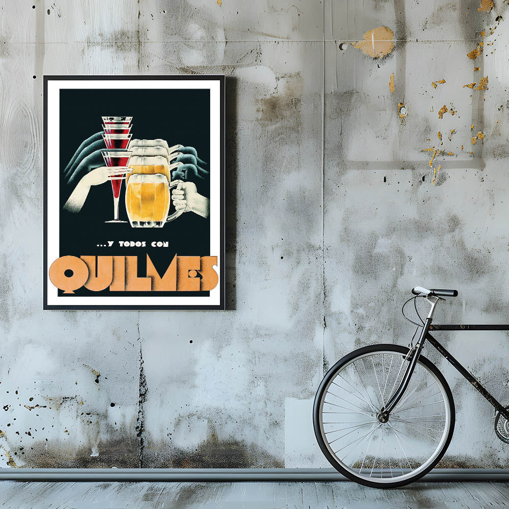This Vintage Quilmes Poster is a stunning example of Art Deco-inspired advertising, showcasing hands holding various drinks—wine glasses, cocktails, and beer mugs—all with a bold and artistic design. The colorful yet sophisticated aesthetic makes this vintage-inspired wall art a perfect addition to any space, whether you’re a fan of timeless art prints, retro home decor, or vintage drink ads.