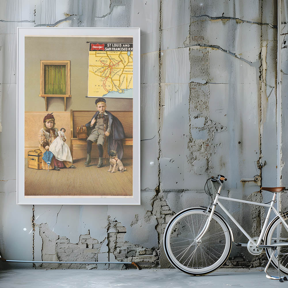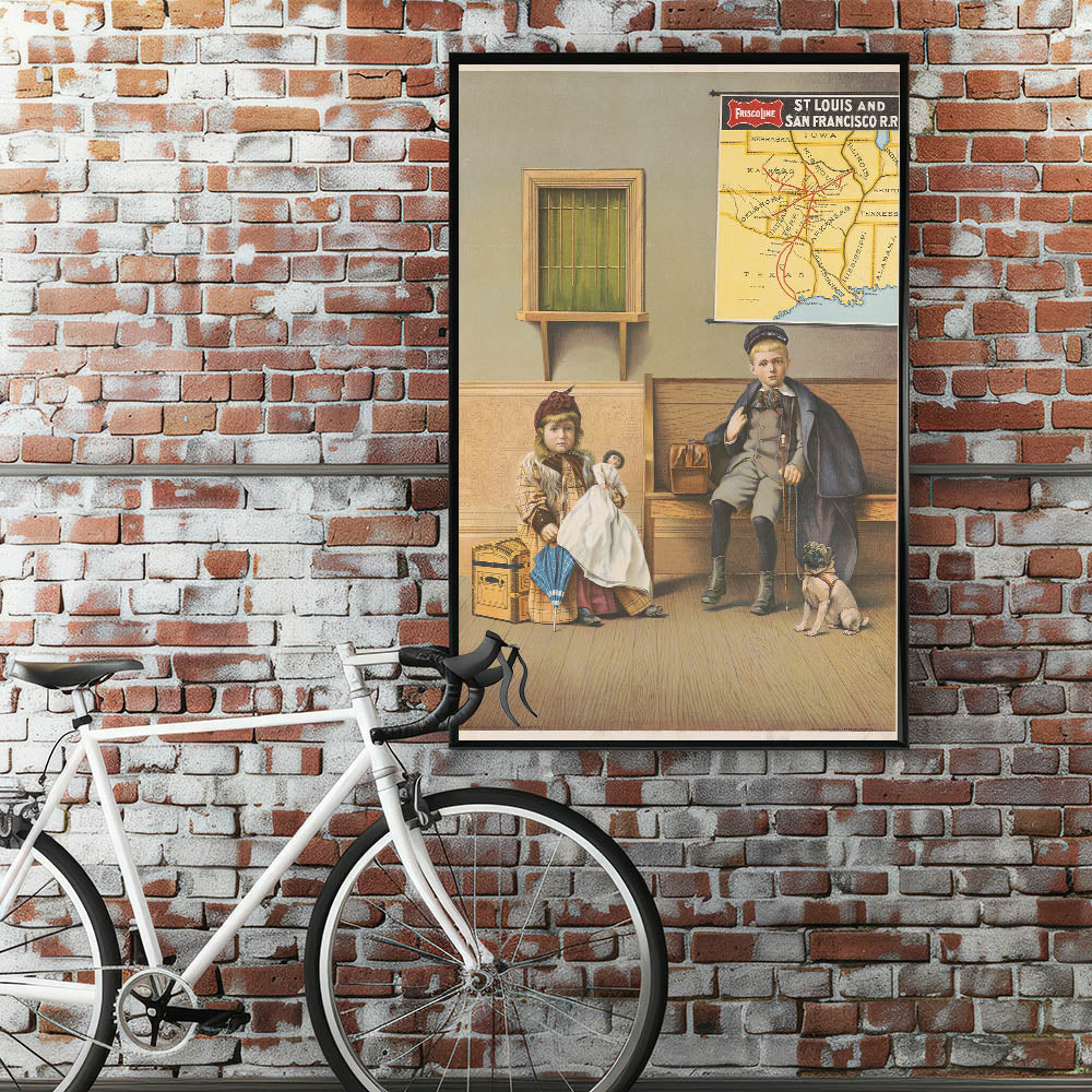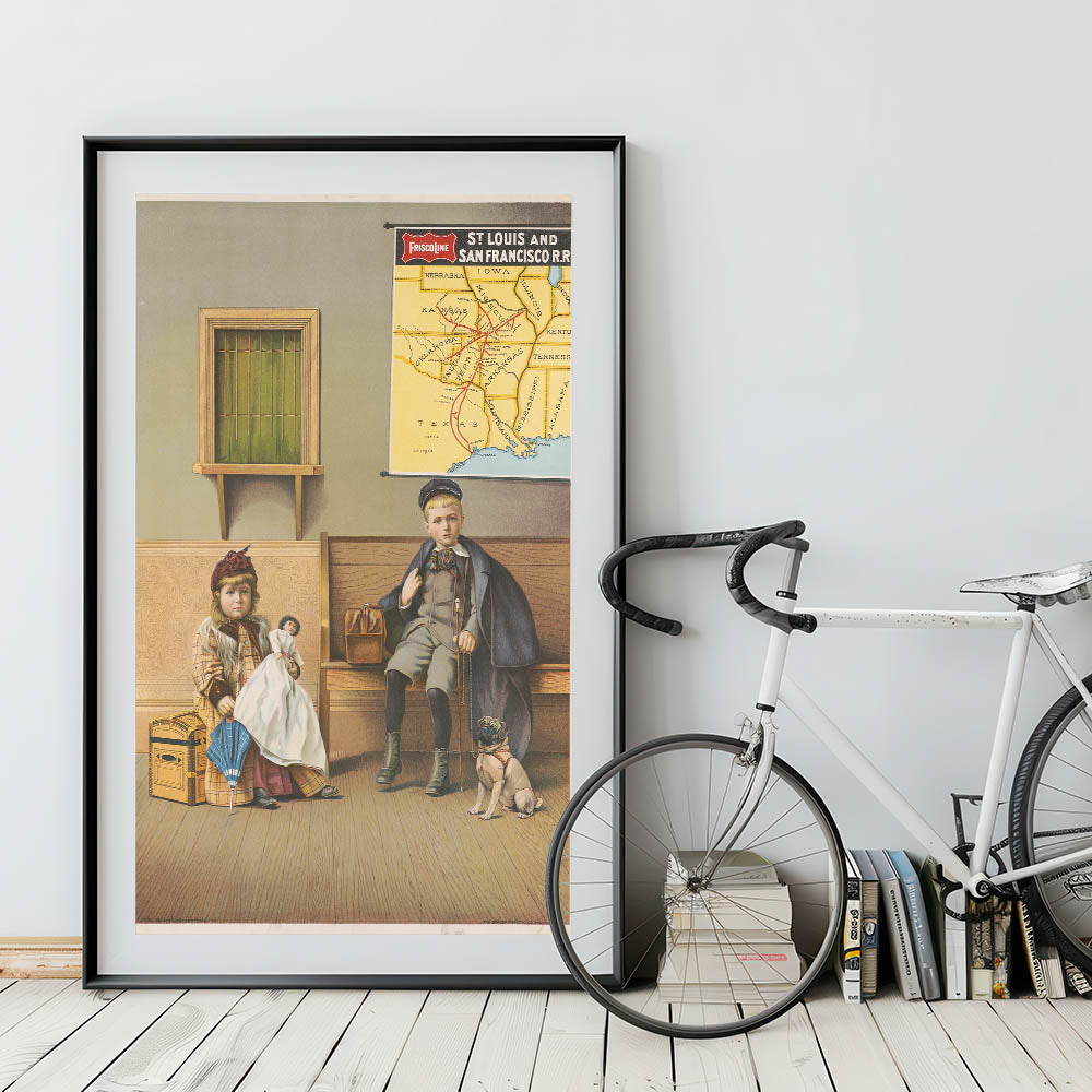 Step back in time with this vintage destination poster featuring an iconic scene from the golden age of train travel. This artwork showcases children waiting at a train station, with the St. Louis and San Francisco Railroad map in the background. The classic travel art design evokes a sense of nostalgia for the early 20th century, making it perfect for train enthusiasts and collectors of nostalgic travel prints.