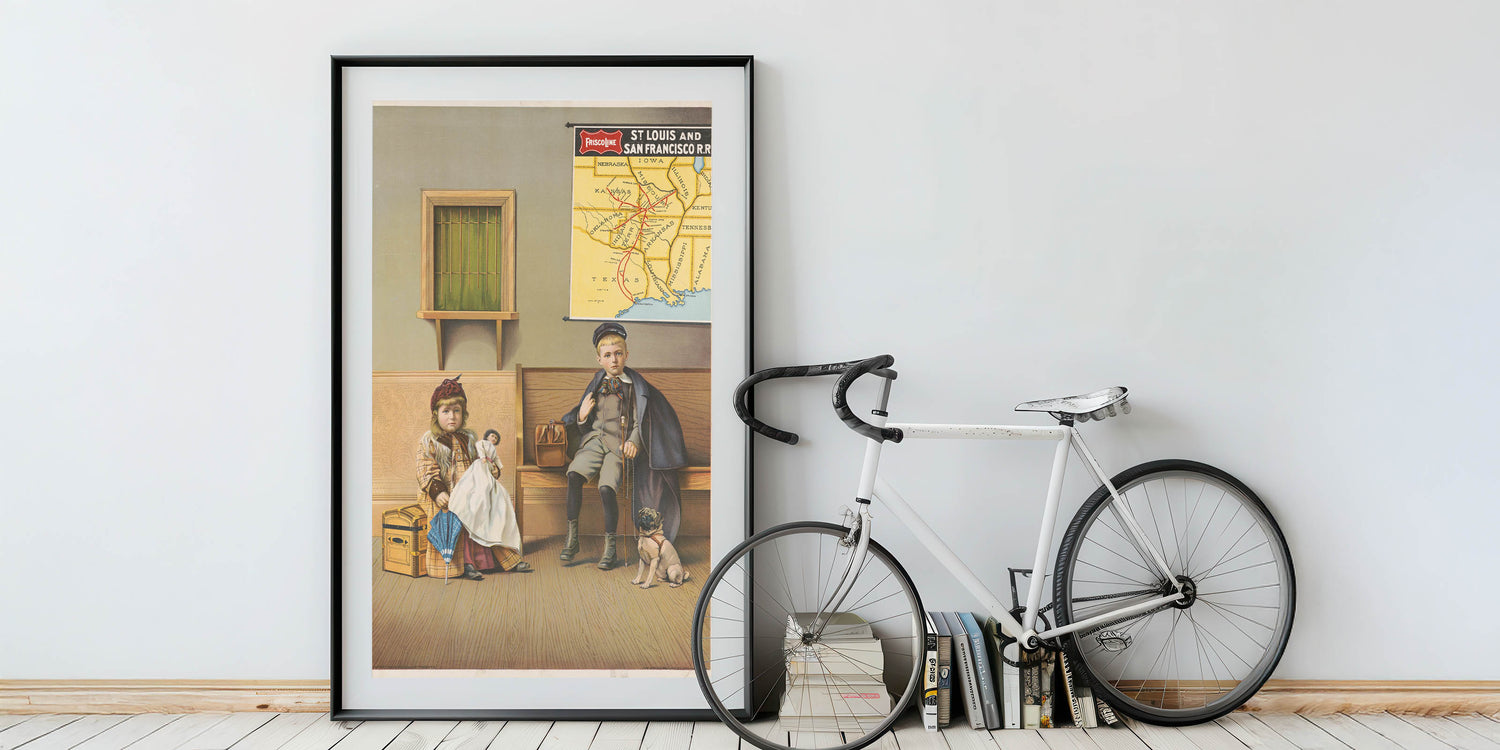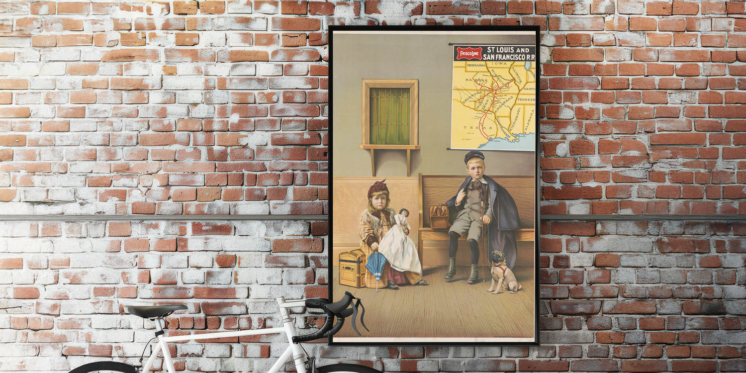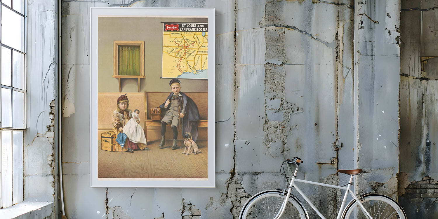 Step back in time with this vintage destination poster featuring an iconic scene from the golden age of train travel. This artwork showcases children waiting at a train station, with the St. Louis and San Francisco Railroad map in the background. The classic travel art design evokes a sense of nostalgia for the early 20th century, making it perfect for train enthusiasts and collectors of nostalgic travel prints.