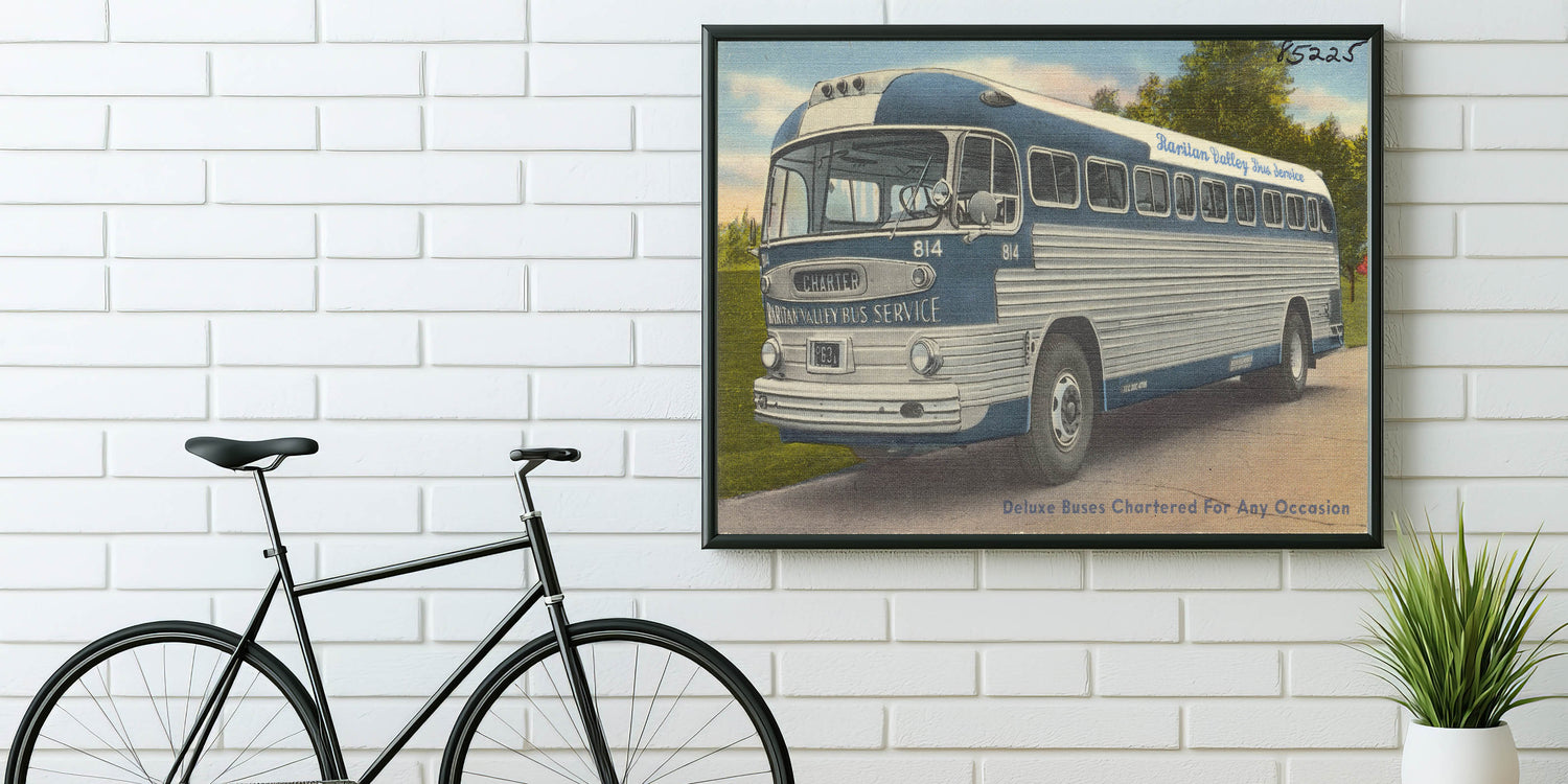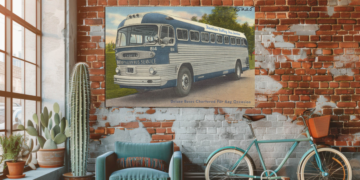 Travel back in time with this vintage poster of the Raritan Valley Bus Service. Featuring the classic blue and gray bus, this print captures the essence of mid-century transportation and the elegance of chartered bus travel. Set against a backdrop of lush greenery, this nostalgic travel print is perfect for those who appreciate the charm of vintage tourism illustrations and retro travel art.