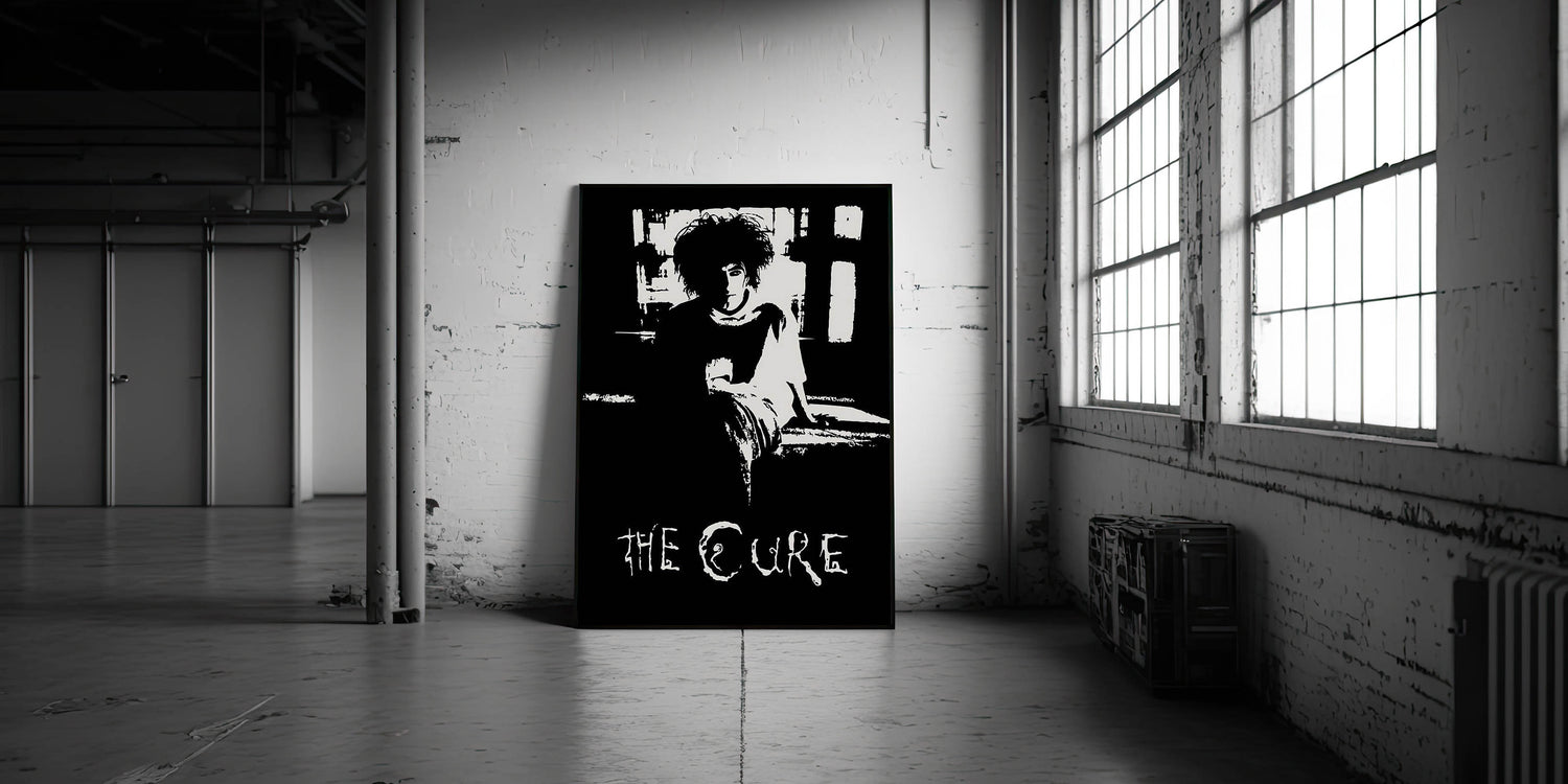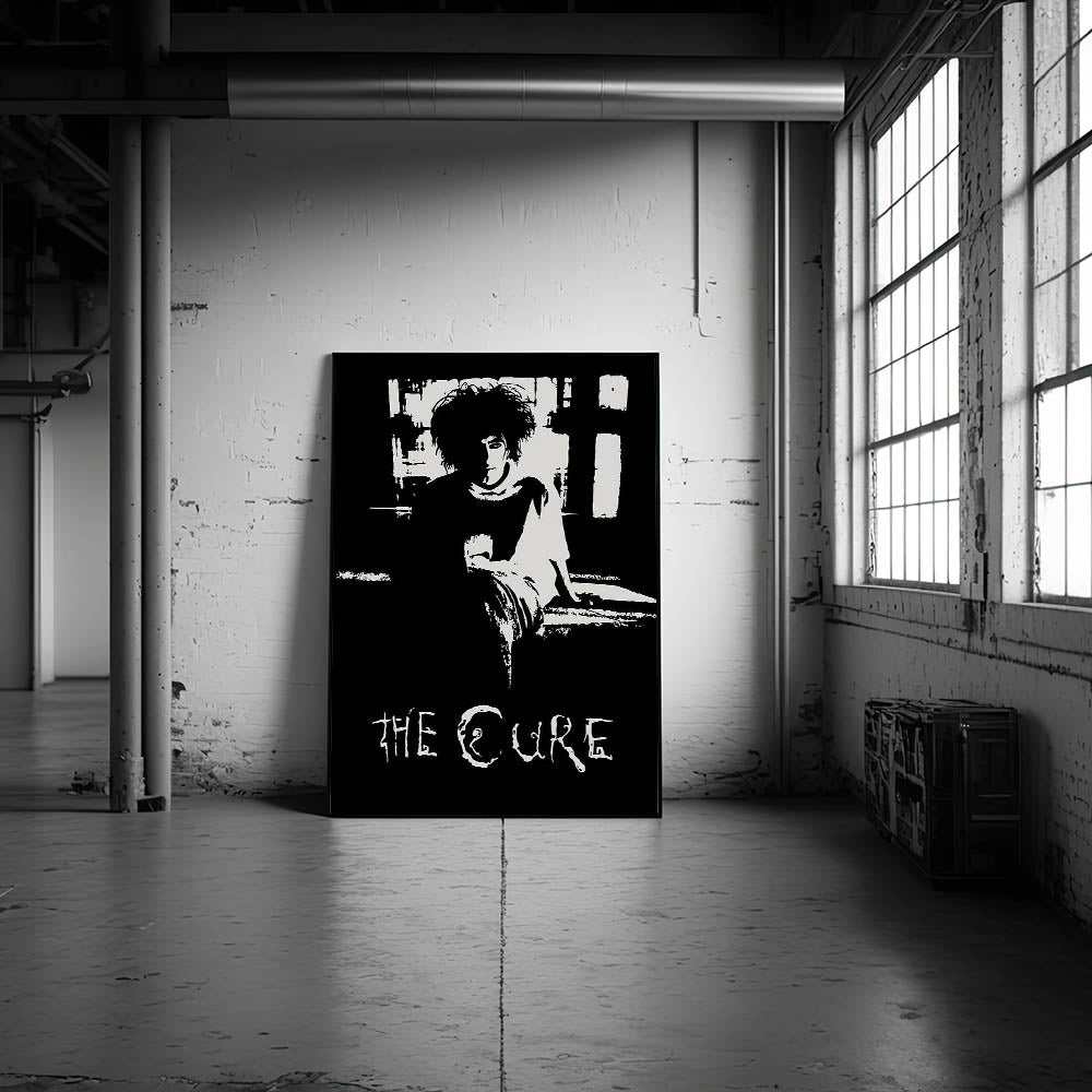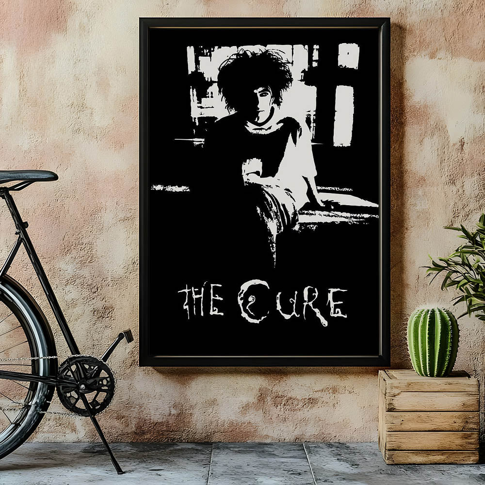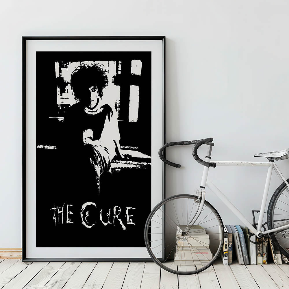This striking black and white art features a timeless portrait of The Cure frontman, capturing the essence of the band’s gothic style. The minimalist design offers a raw and emotional connection to the music, making it a perfect piece for any fan of retro aesthetic or vintage decor.