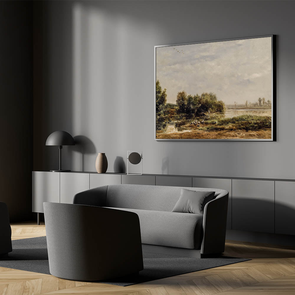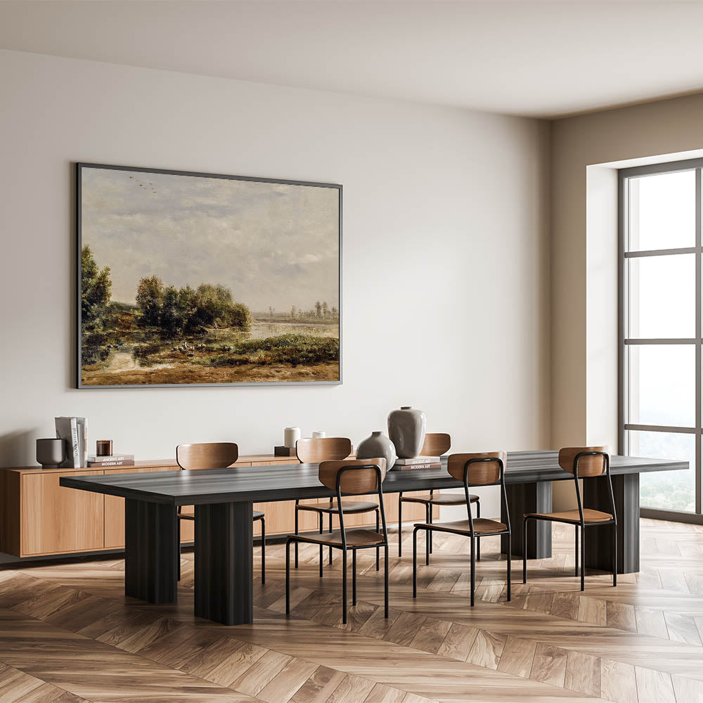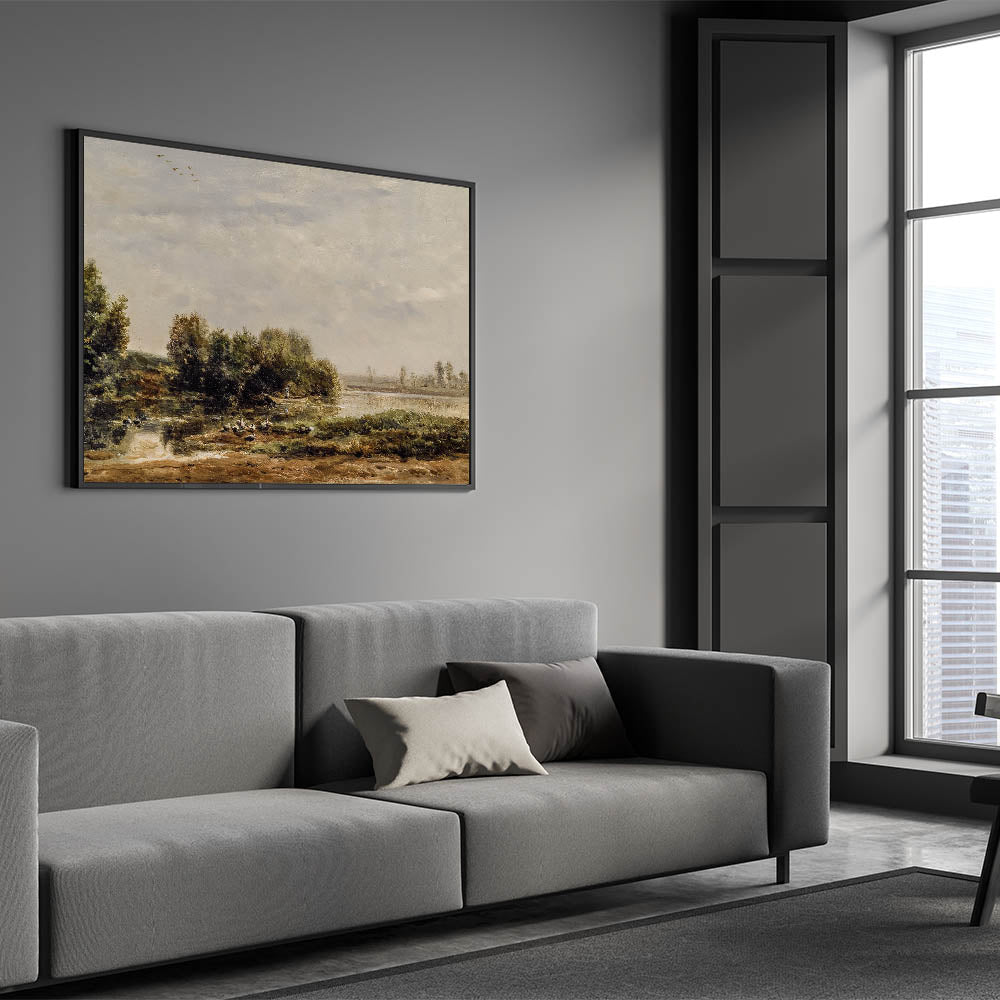 This vintage-inspired riverside landscape brings timeless beauty and peacefulness into your home, making it a perfect addition for creating a serene atmosphere.