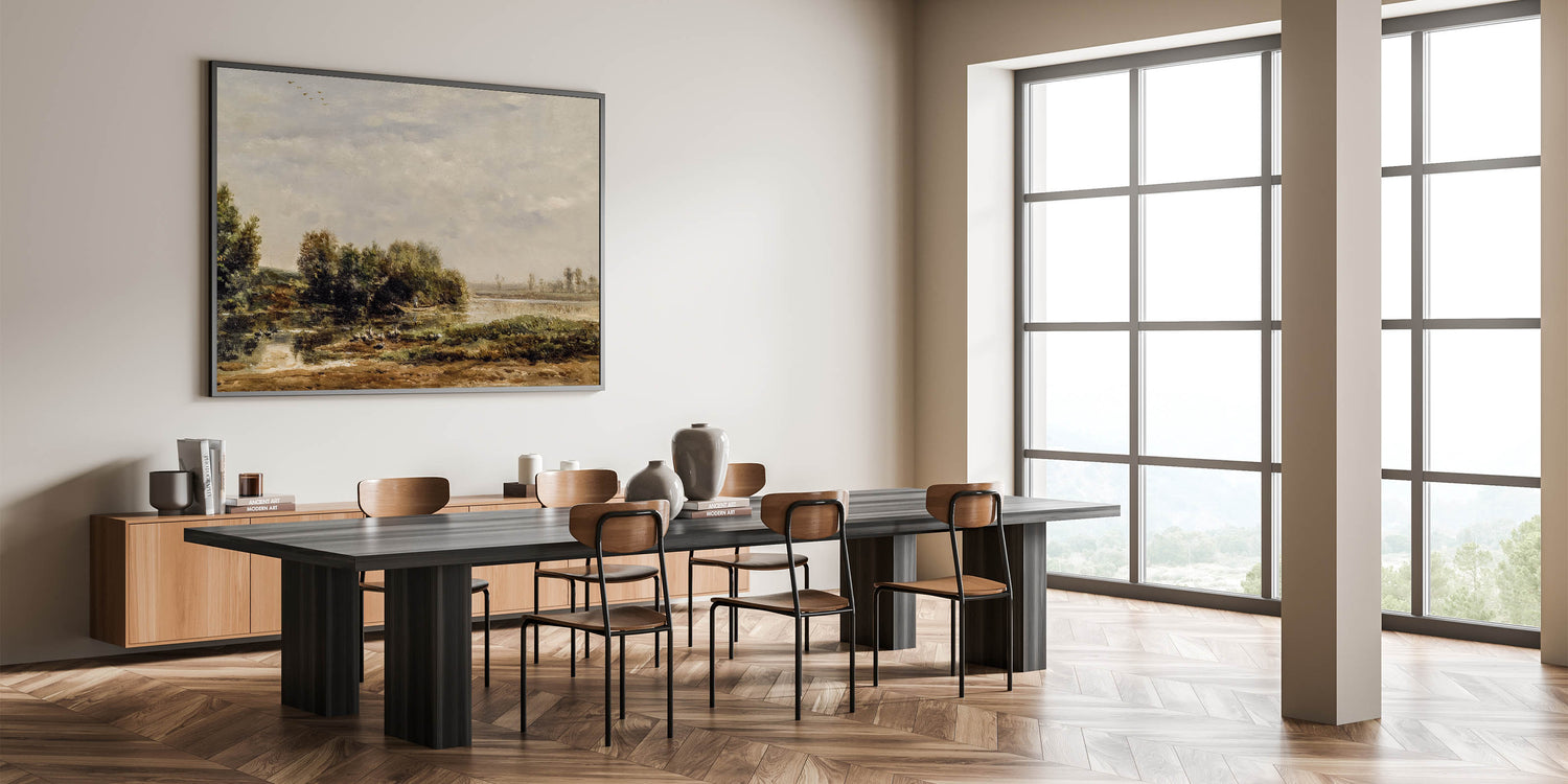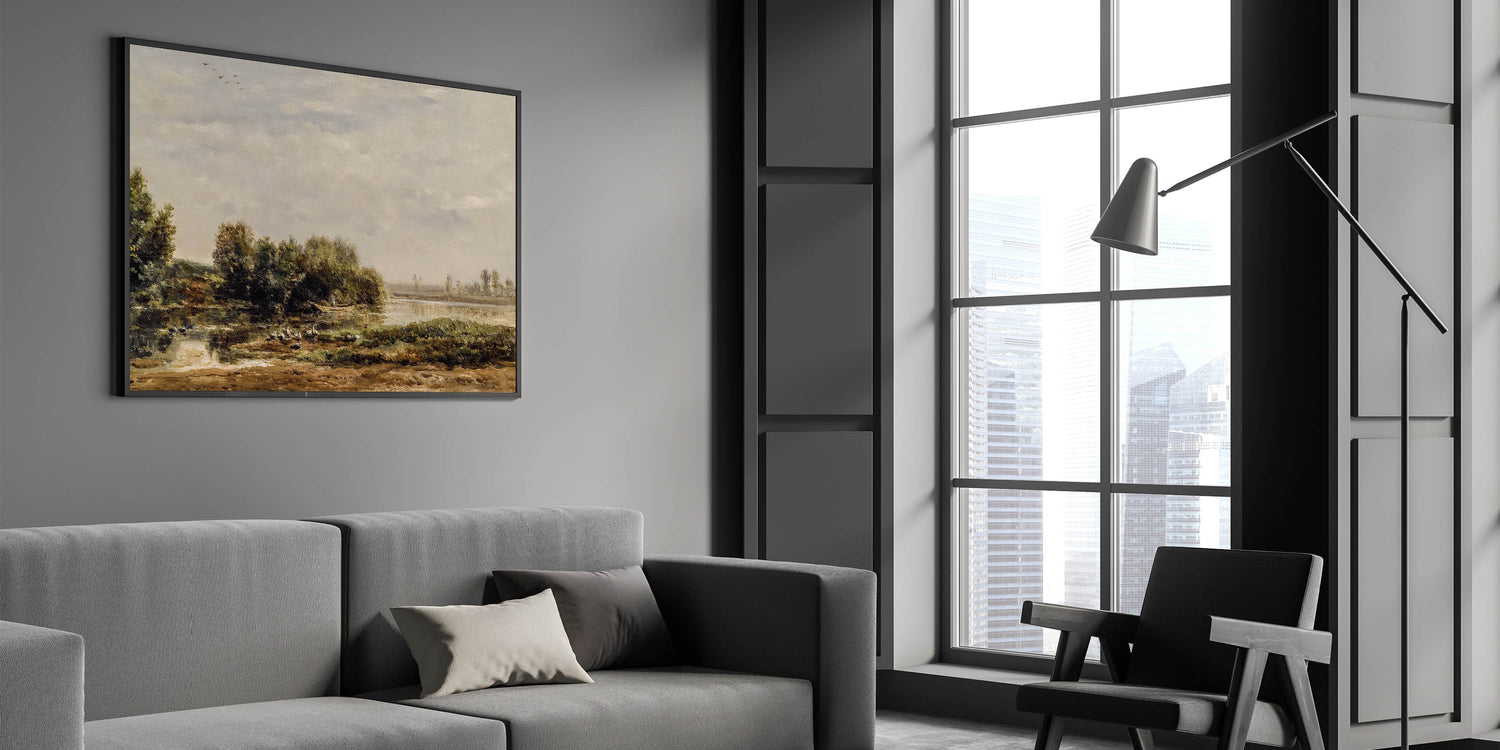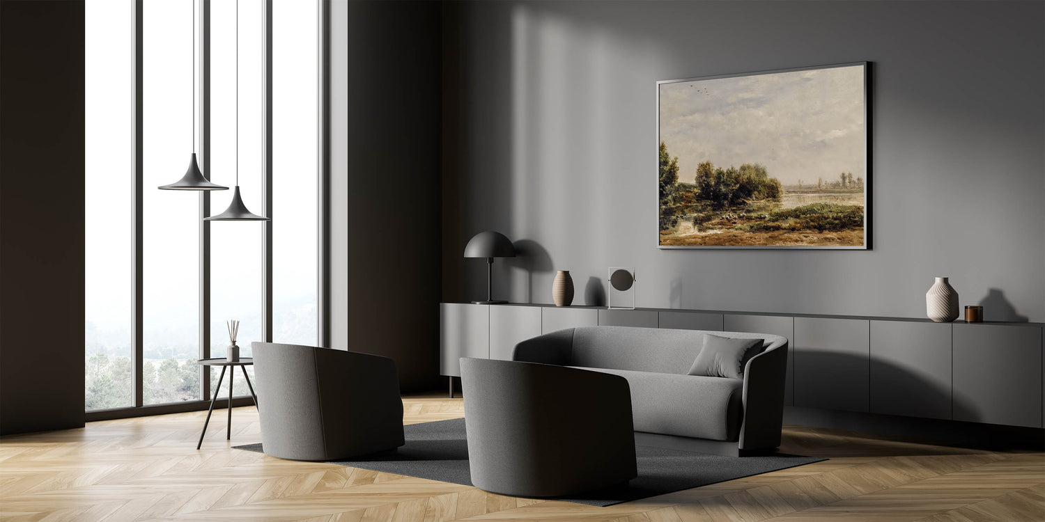 This vintage-inspired riverside landscape brings timeless beauty and peacefulness into your home, making it a perfect addition for creating a serene atmosphere.