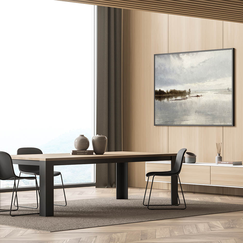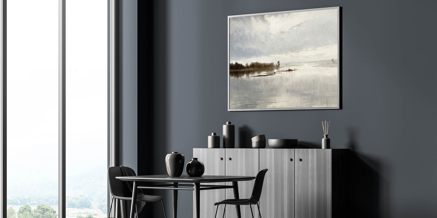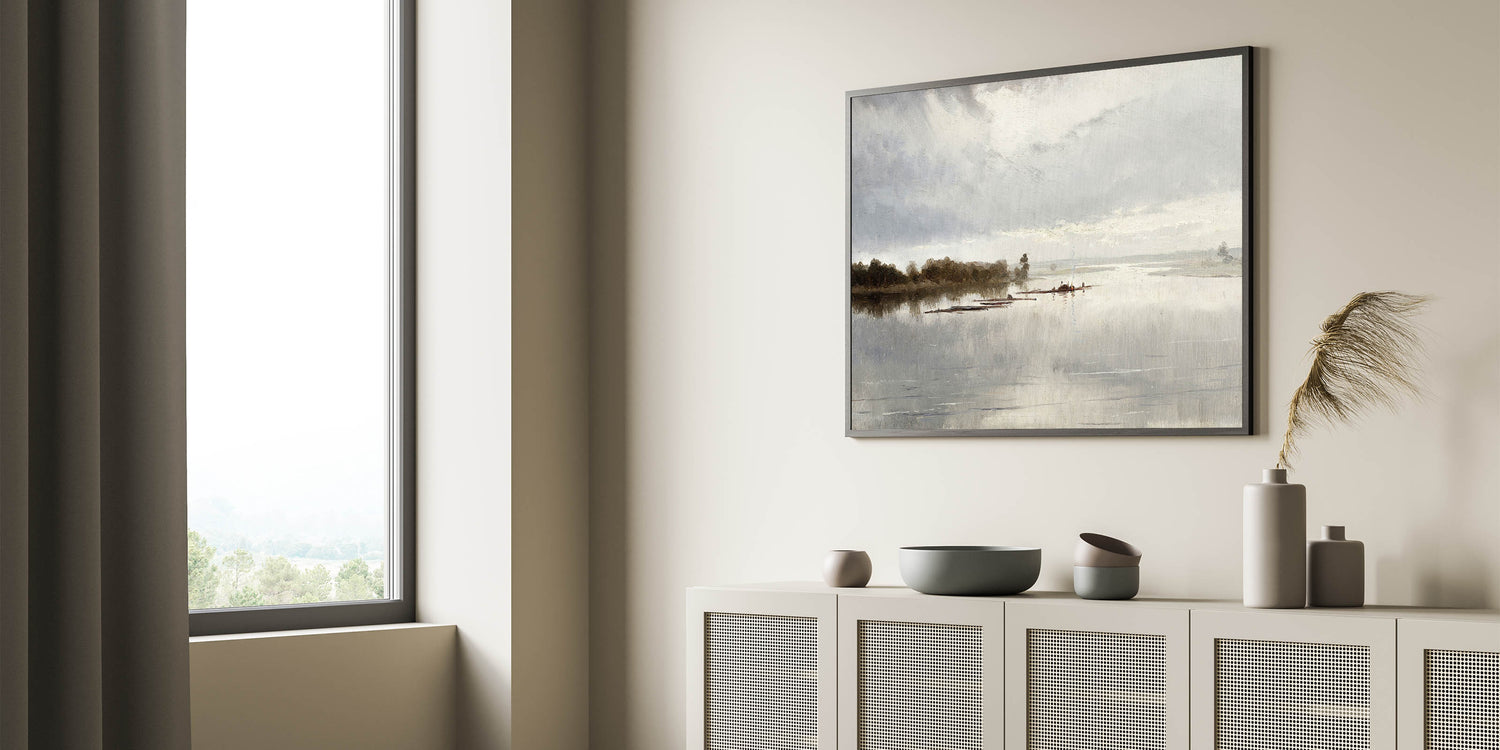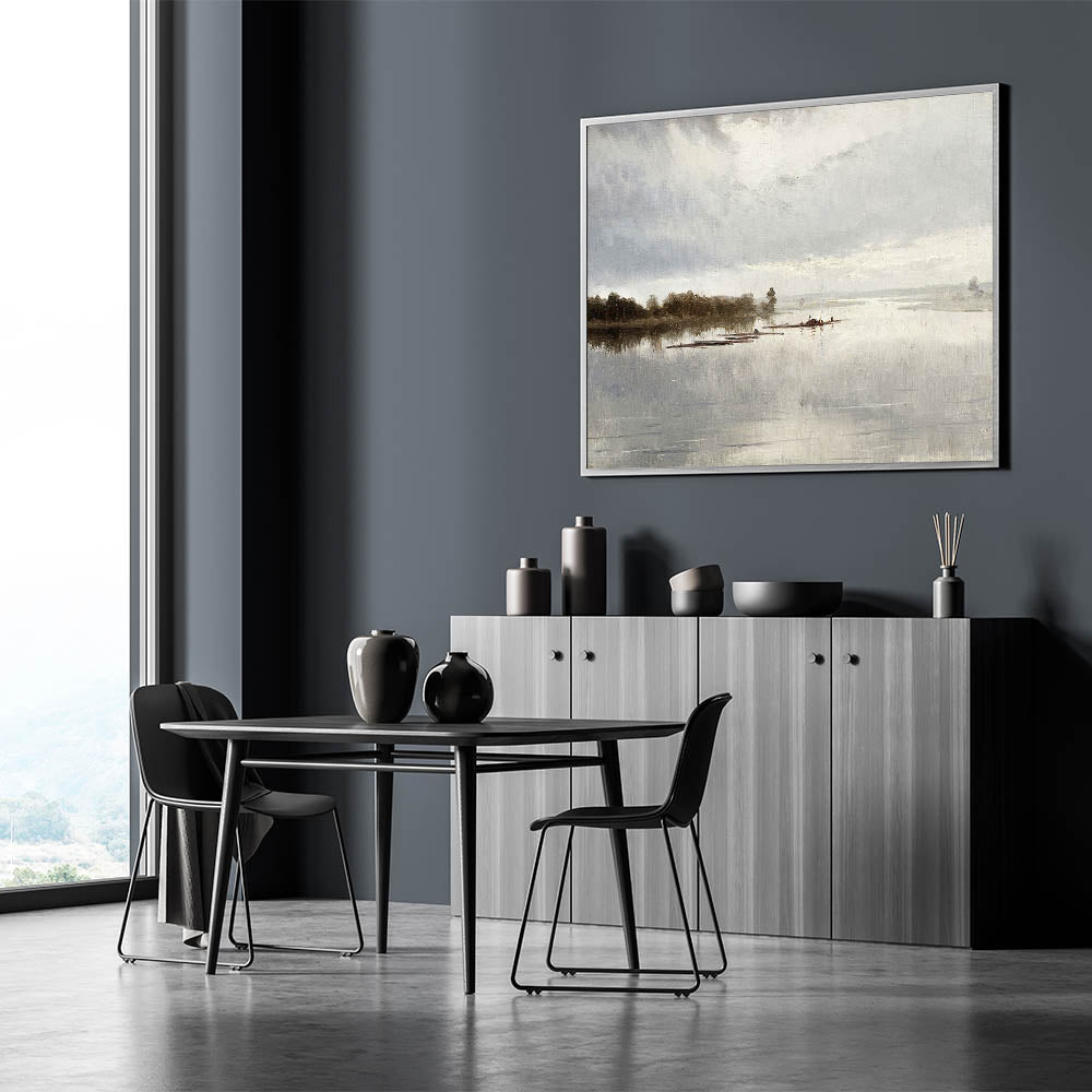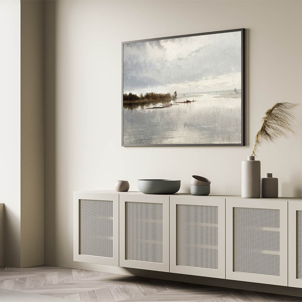 Capture the serene beauty of nature with this vintage riverside landscape artwork. Featuring calm waters, distant trees, and boats gently floating down the river, this piece evokes a sense of tranquility and timeless peace. The soft light and muted tones of the landscape bring the calm of the river and the simplicity of nature into your home.