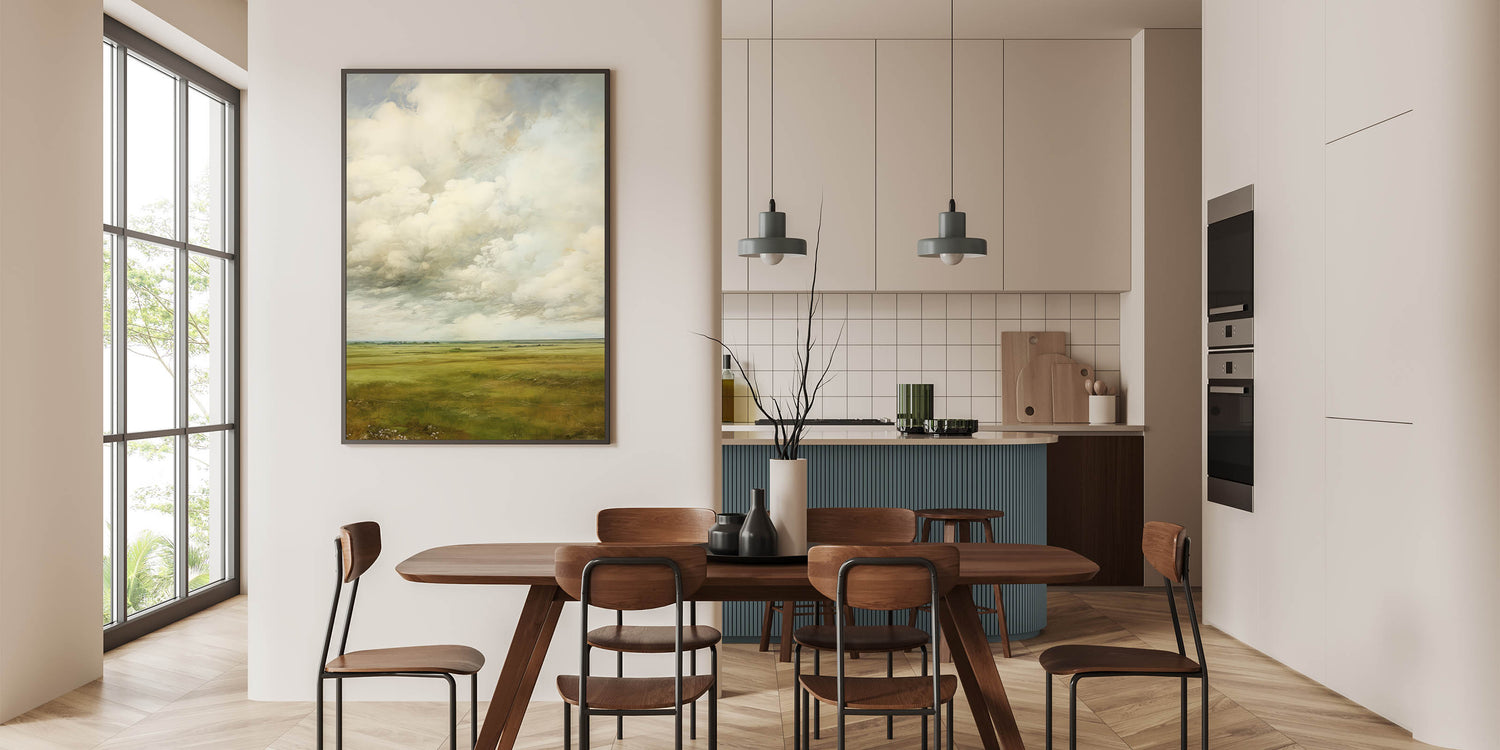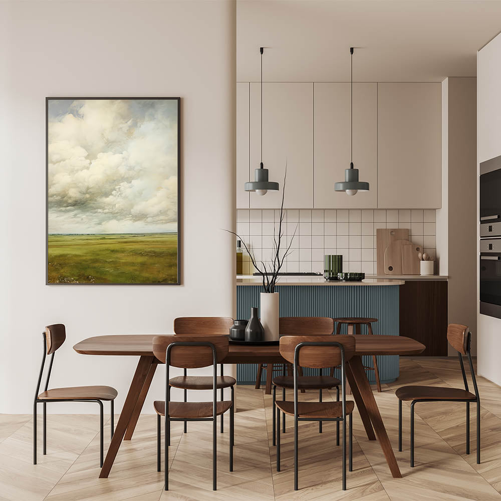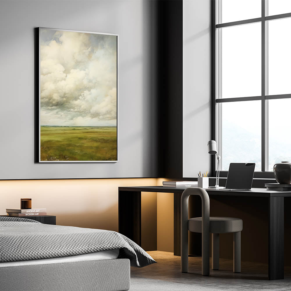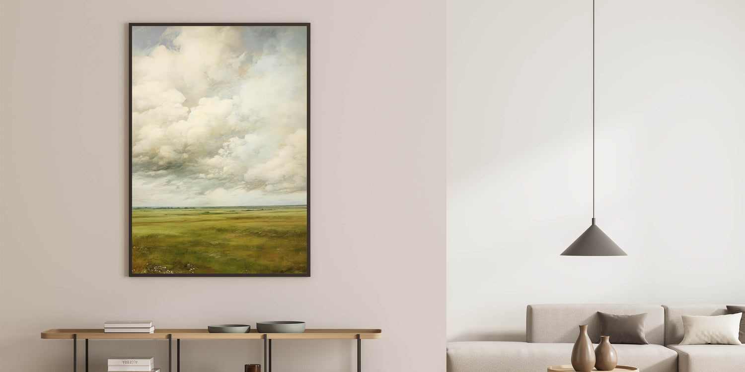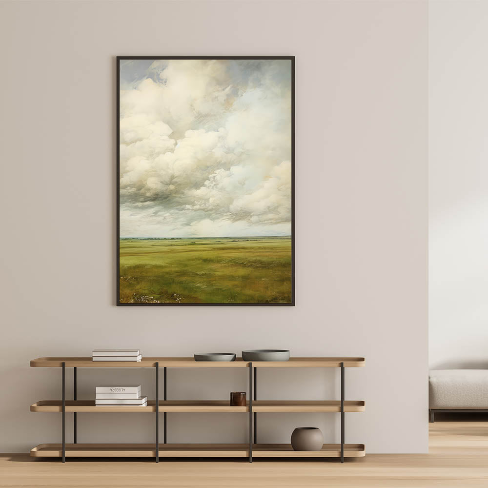 Immerse yourself in the timeless beauty of vintage landscapes with this expansive countryside wall art. Featuring a breathtaking view of rolling green fields under a dramatic cloud-filled sky, this artwork captures nostalgic scenery and natural vistas. The soft hues and delicate brushwork evoke classic elegance with retro landscapes, making it a perfect statement piece for any interior.