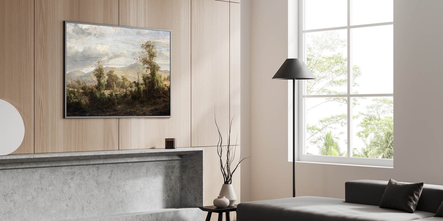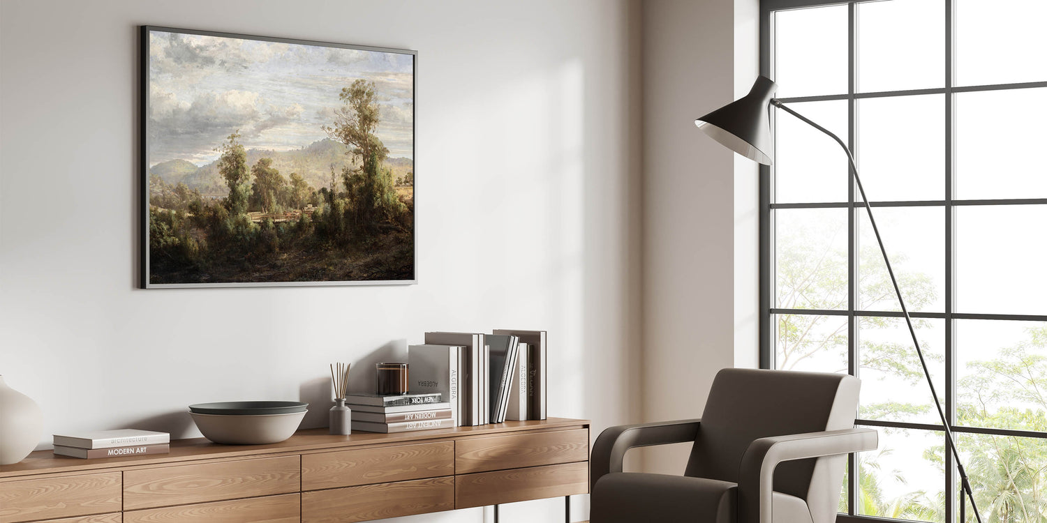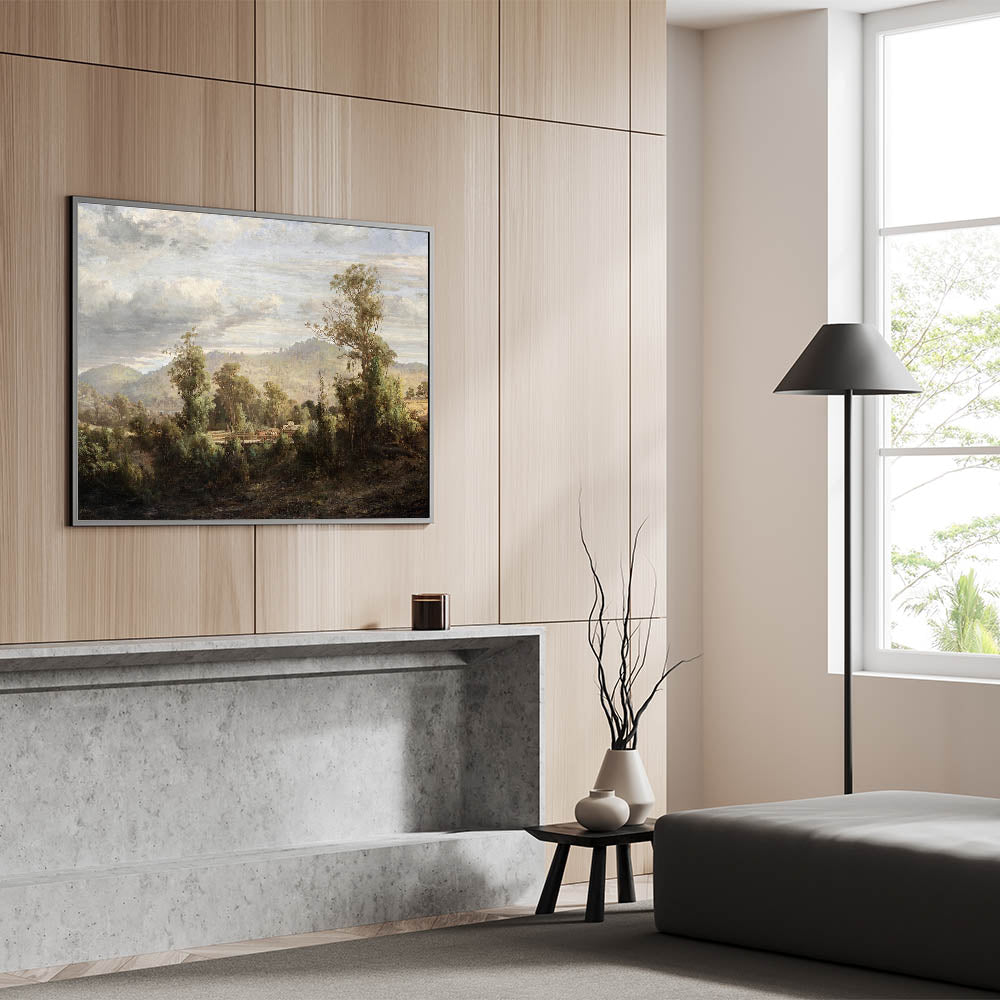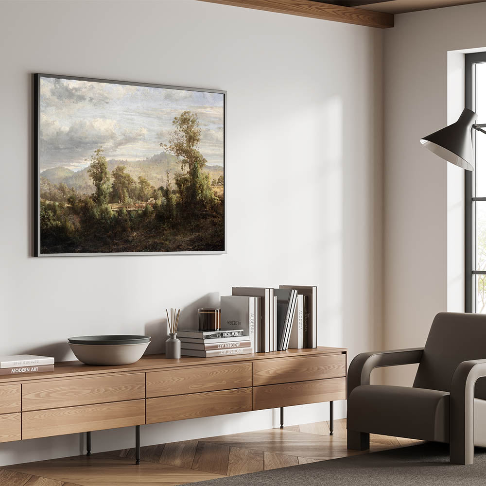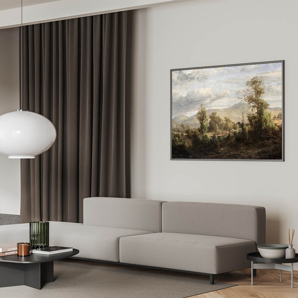 This vintage-inspired rural landscape brings the calm and natural beauty of the countryside into your home, creating a timeless and relaxing space.